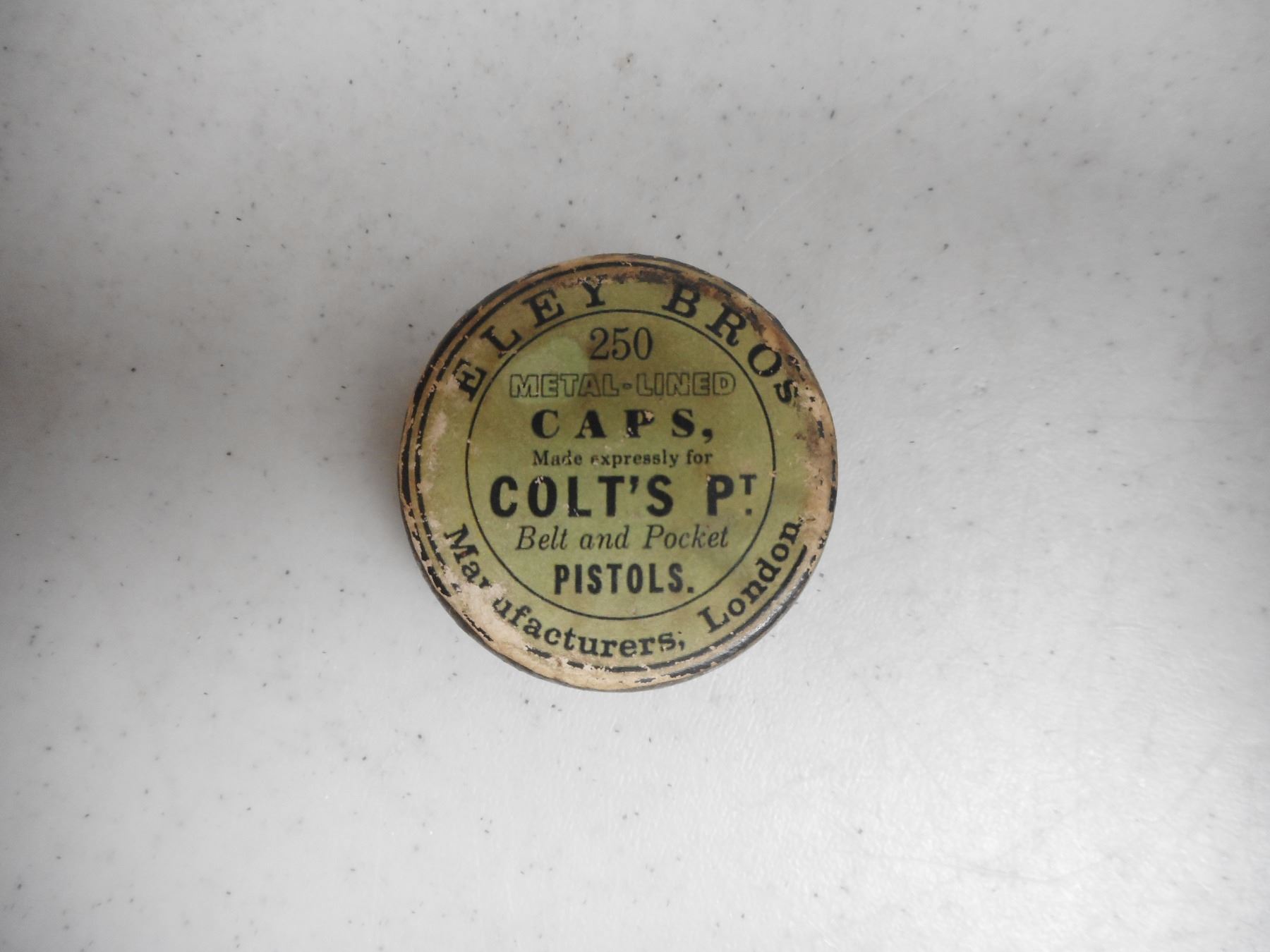 ELEY BROS COLT PERCUSSION CAPS IN ROUND TIN , ELEY BROS. 8 COLT PERCUSSION CAPS IN ROUND TIN