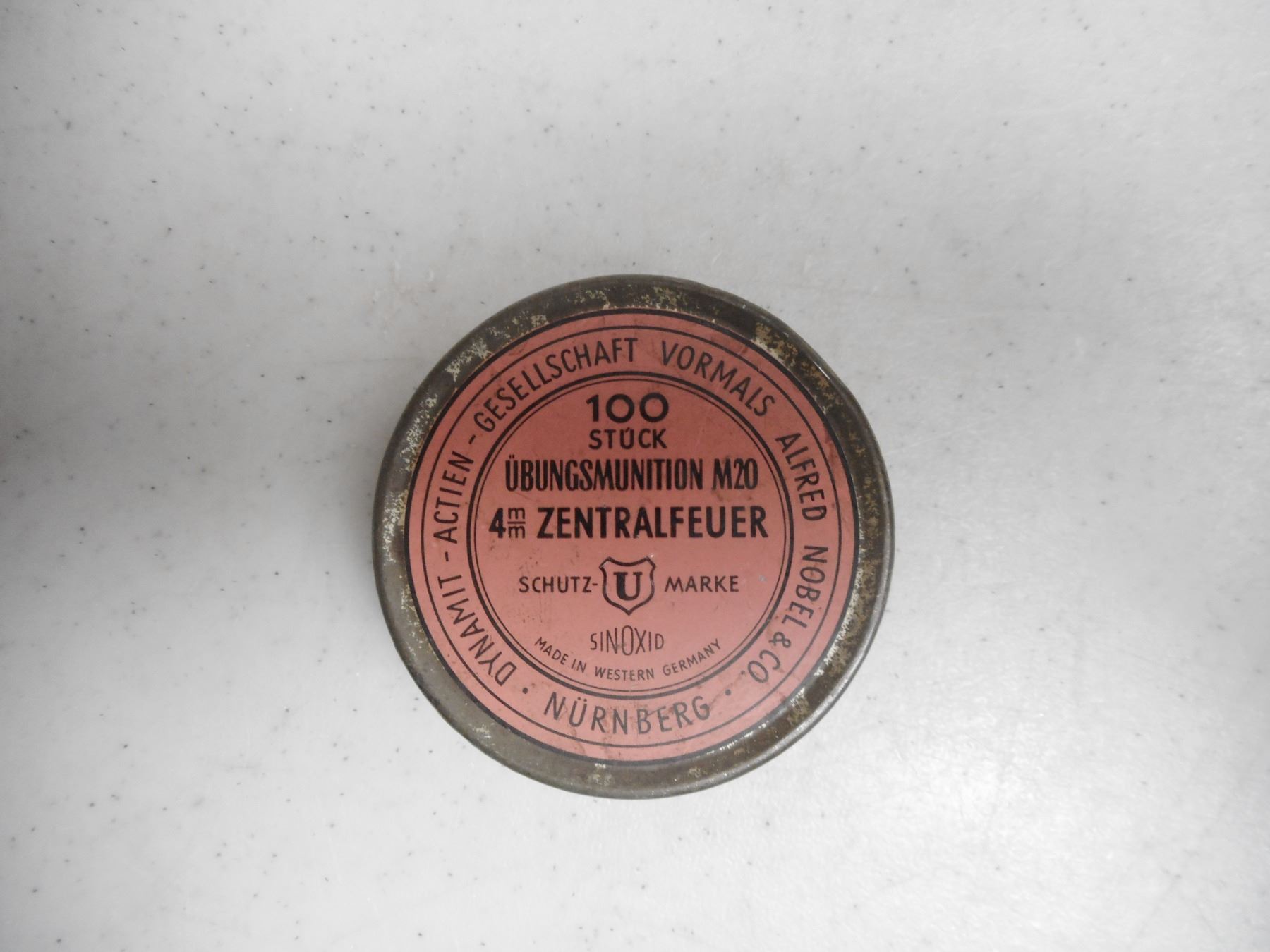 GERMAN DYNAMIT/NOBEL 4MM CENTREFIRE UBUNGSMUNITION AMMO , 39 RNDS GERMAN DYNAMIT/NOBEL 4MM CENTERFIRE UBUNGSMUNITION IN ROUND TIN