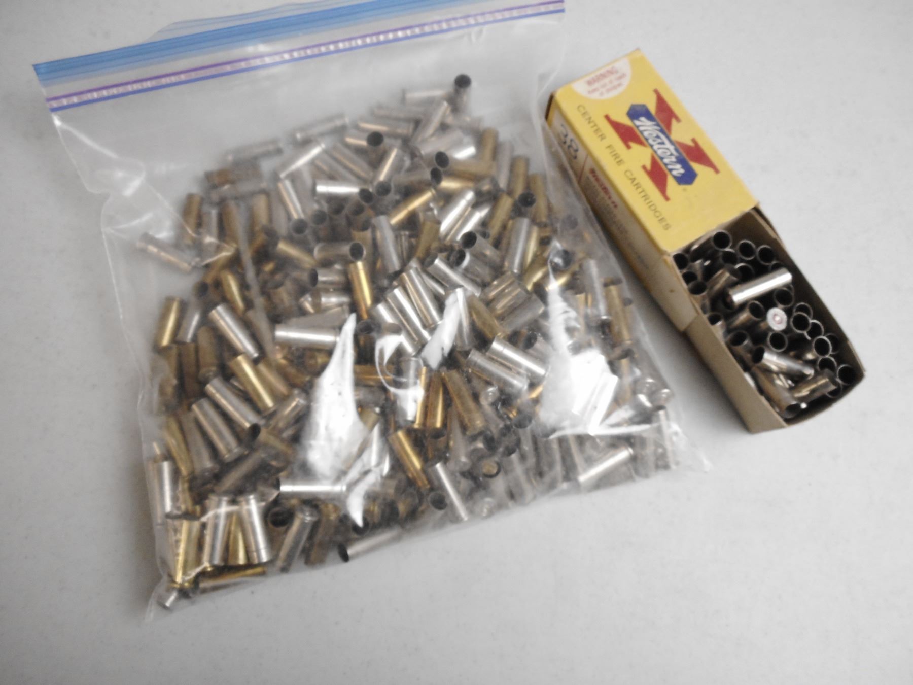 38 SP BRASS WITH VINTAGE 38 SP WESTERN X BOX , 1.7 KG BAG OF 38 SP BRASS WITH VINTAGE 38 SP WESTERN X BOX