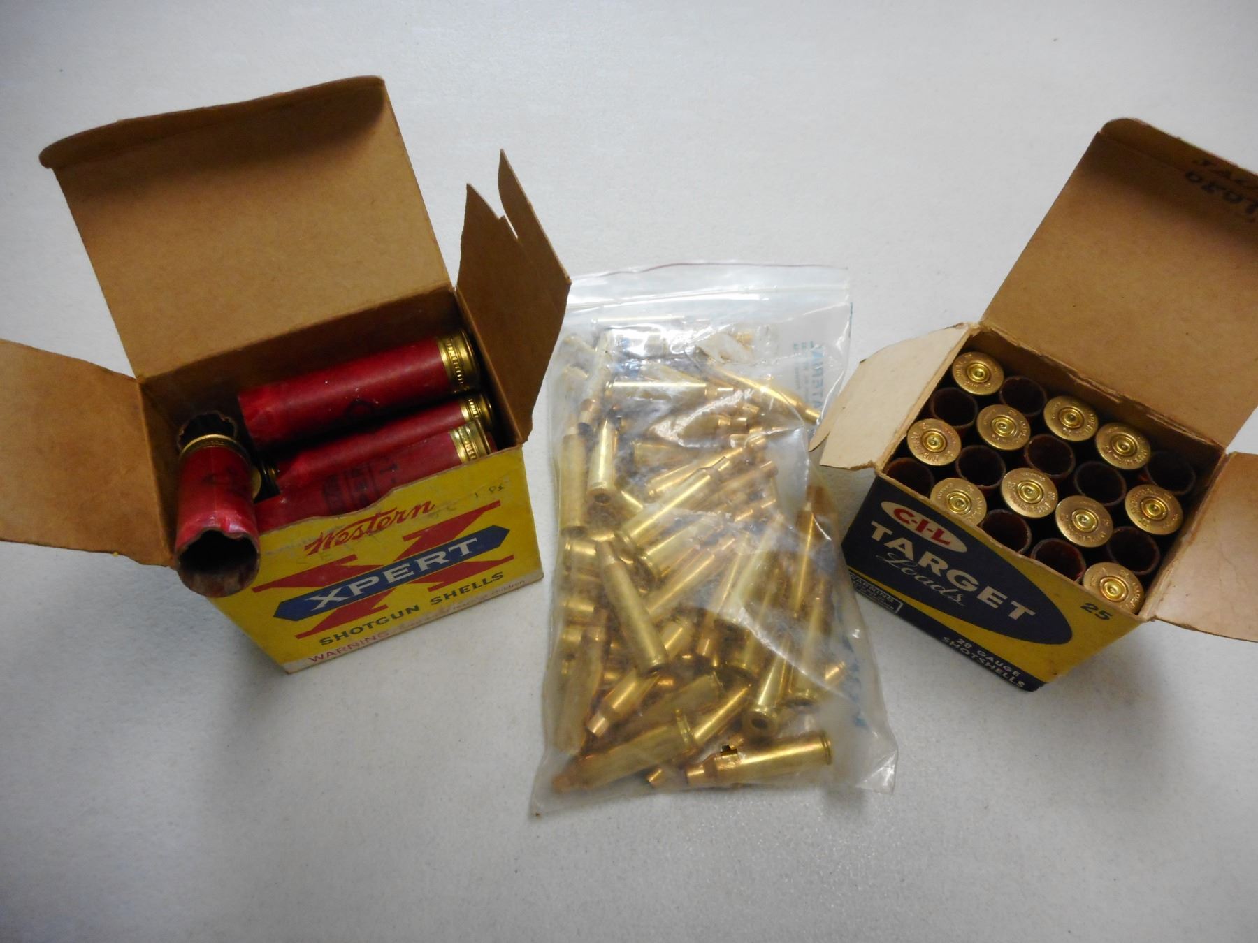SHOTGUN SHELL BRASS, 16 GAUGE, 28 GAUGE, 22-250 REM BRASS , 87 BRASS, 28 GAUGE, 16 GAUGE, 22-250 REM BRASS, SHELL BRASS IN VINTAGE WESTERN, AND CIL BOXES