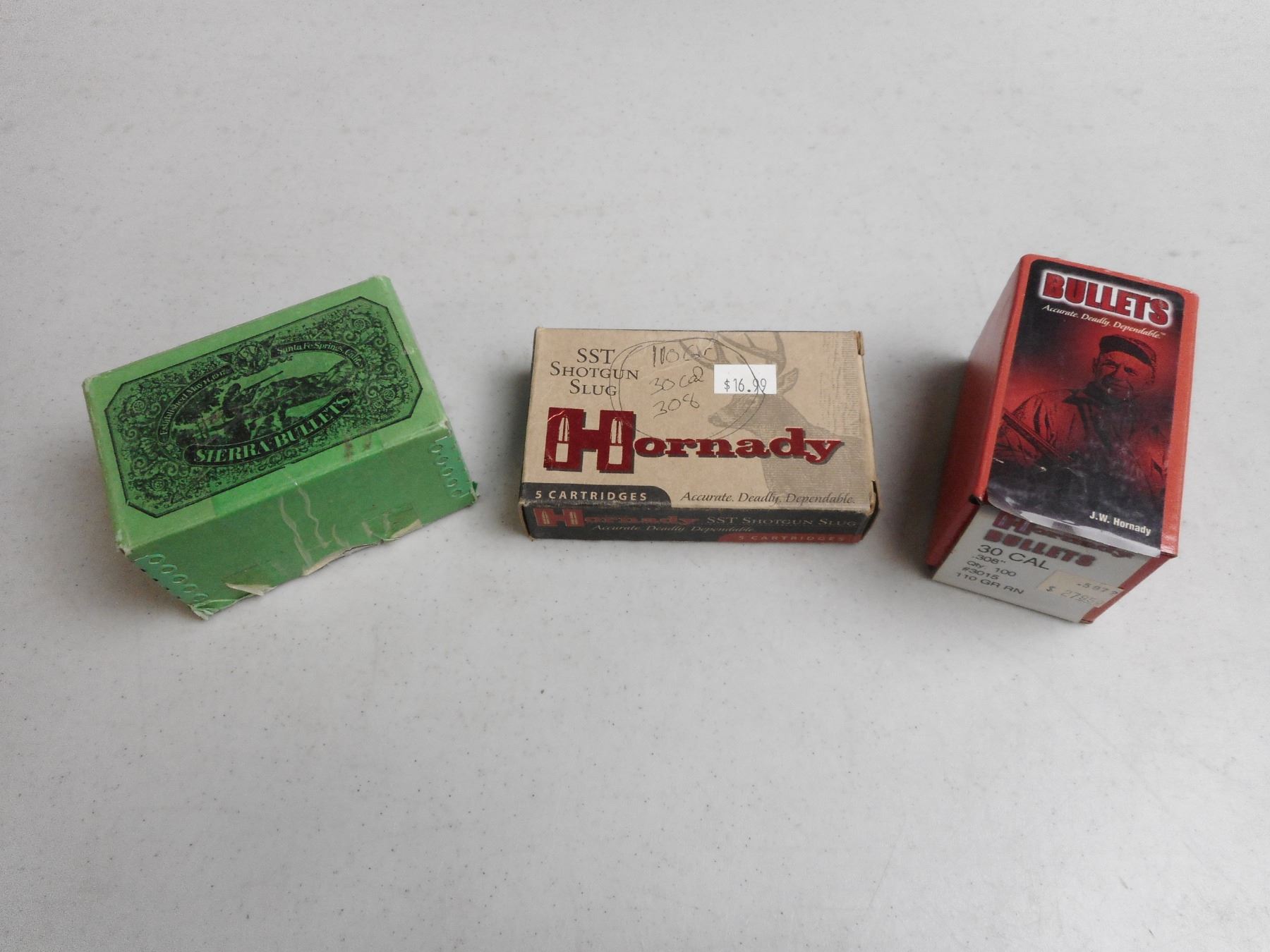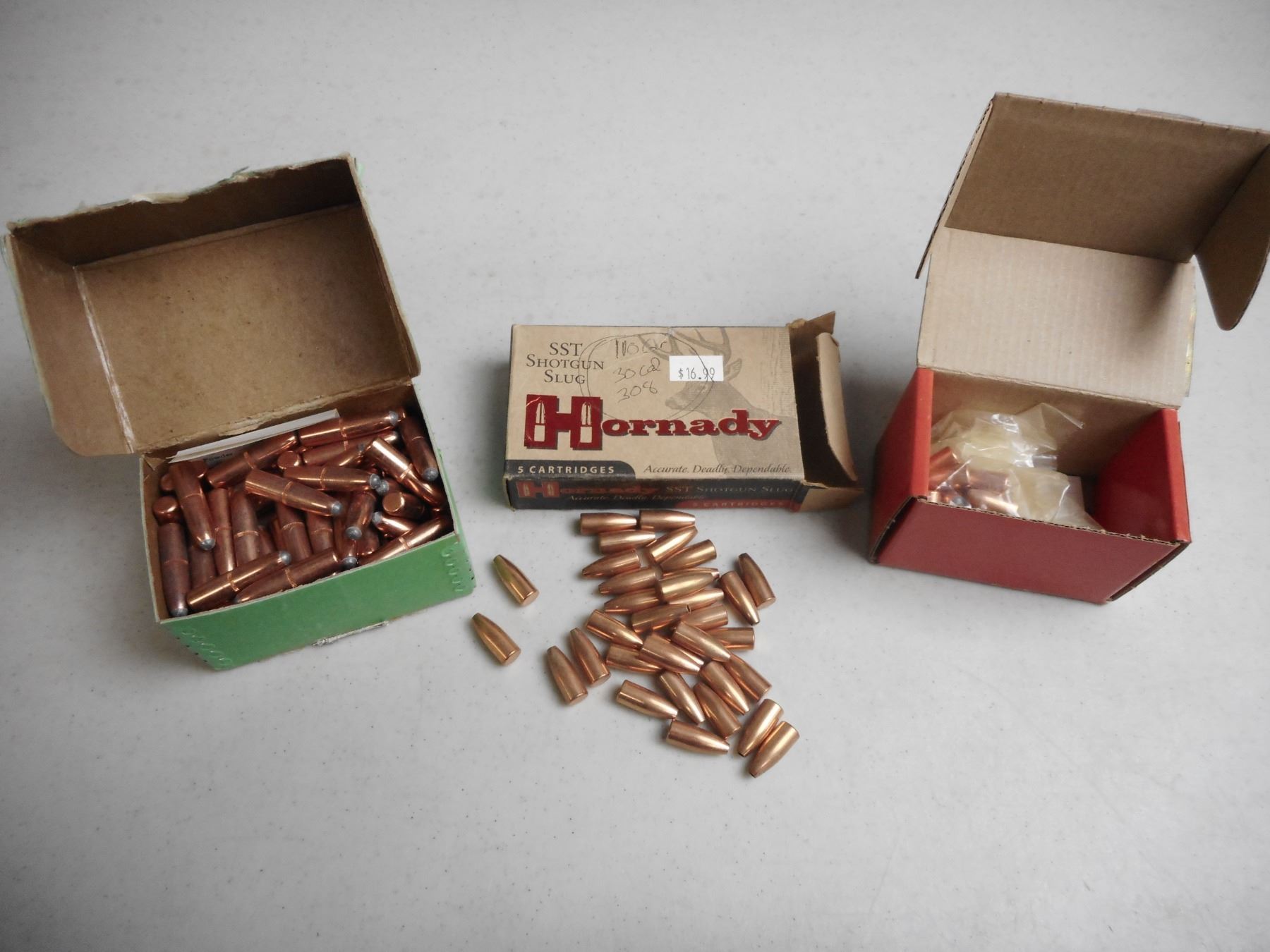 ASSORTED BULLETS 12 GA. 30 CAL, .30 CAL ROUND NOSE , 151 BULLETS 33 BULLETS HORNADY 12 GA. SST 300 GRNS FTX SLUG, 18 HORNADY 30 CAL. 110 GRN RN, 100 SIERRA .30 CAL. 220 GRNS RNOUND NOSE BULLETS