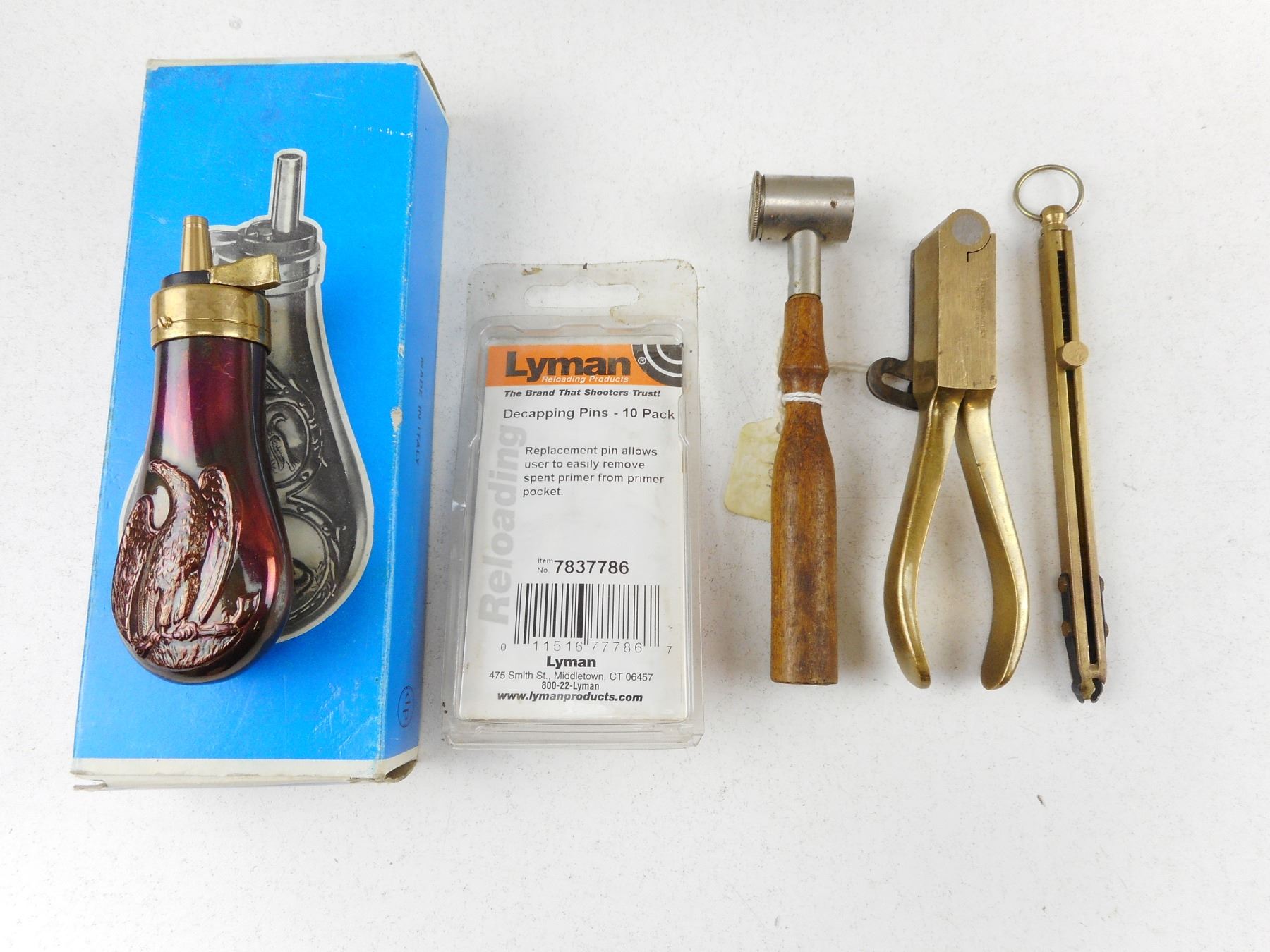 ASSORTED RELOADING TOOLS , SOLID BRASS BULLET MOLD PLIERS, BRASS CAP DISPENSER, POWDER MEASURES