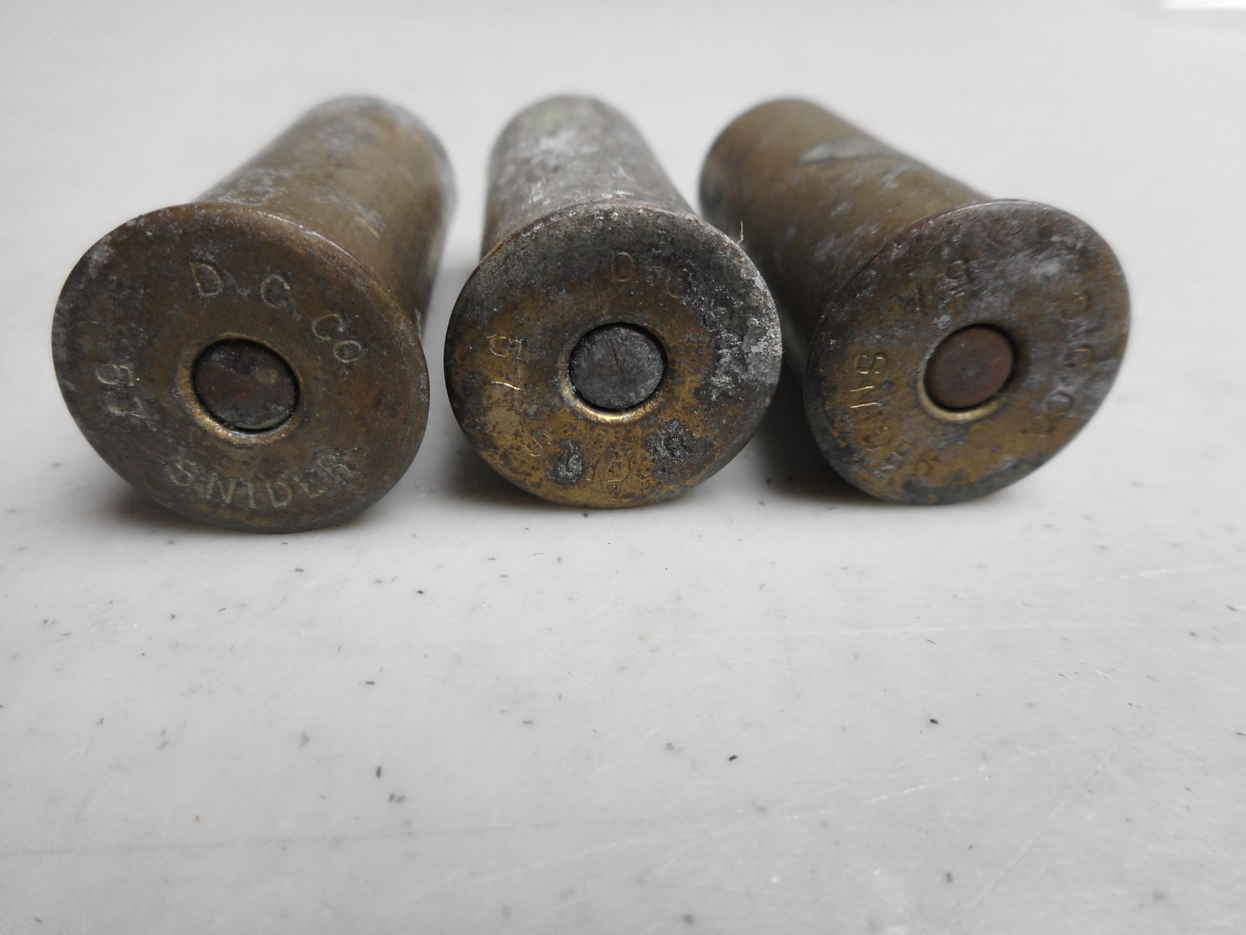 DCCO 57 SNIDER PE A BN FOR LEAD, B STGT FOR SHOT, CA 1901/04 , 3 PRIMED BRASS DCCO 57 SNIDER PE, A BN FOR LEAD, B STGT FOR SHOT, CA 1901/04 , JOHN, A. BELTON COLLECTION
