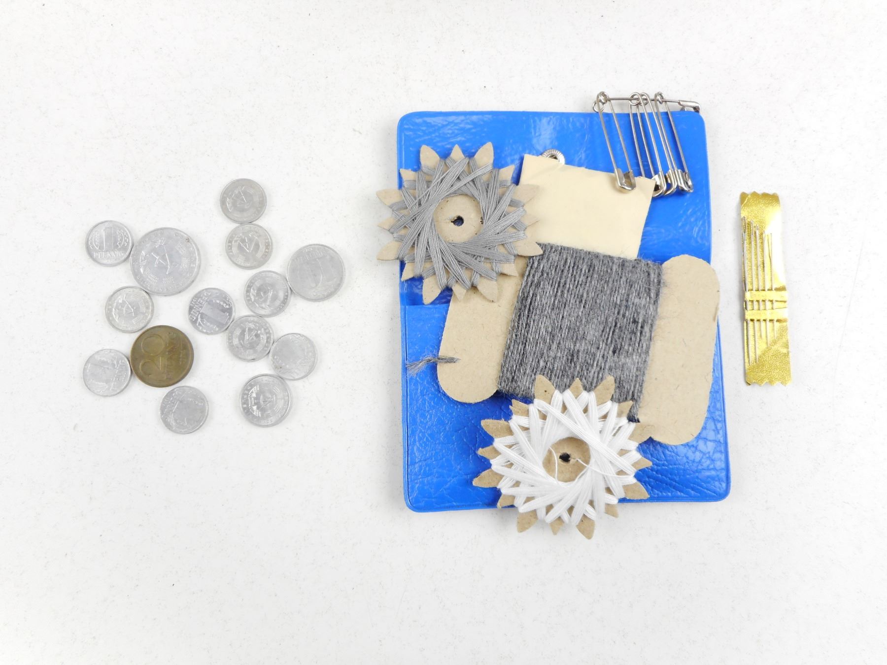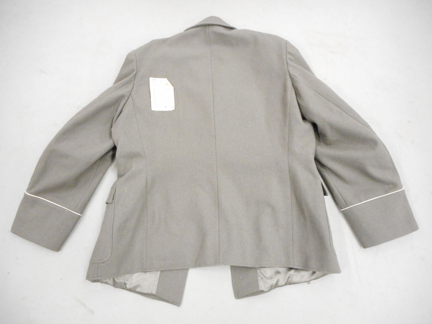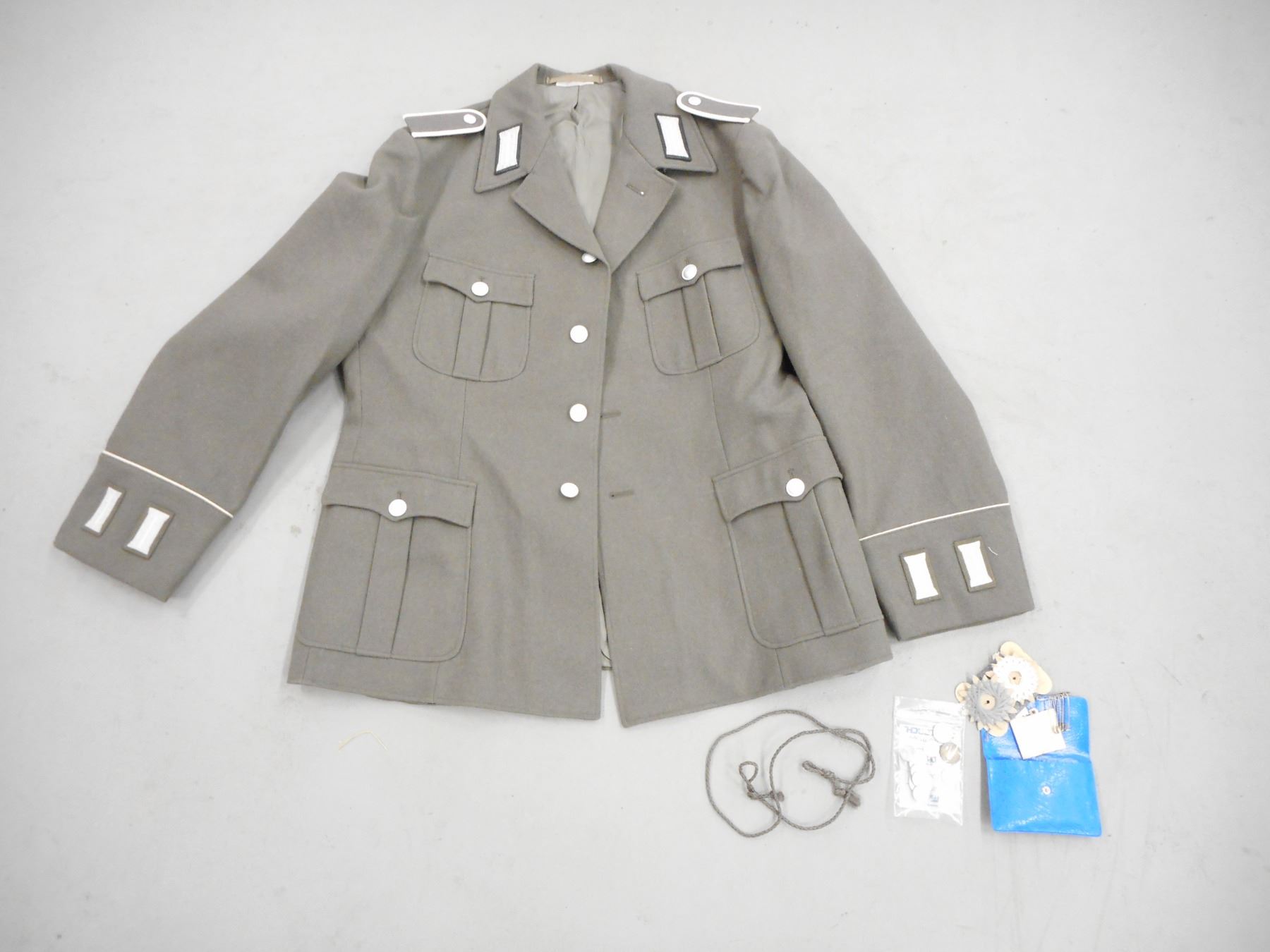 EAST GERMAN JACKET & ACCESSORIES, INCLUDES GREY JACKET WITH FLASHES, STAMPED NVA INSIDE, ASSORTED GERMAN COINS INCLUDES DATES 1960'S-1980'S, SEWING KIT IN POUCH, GREY BRAID
