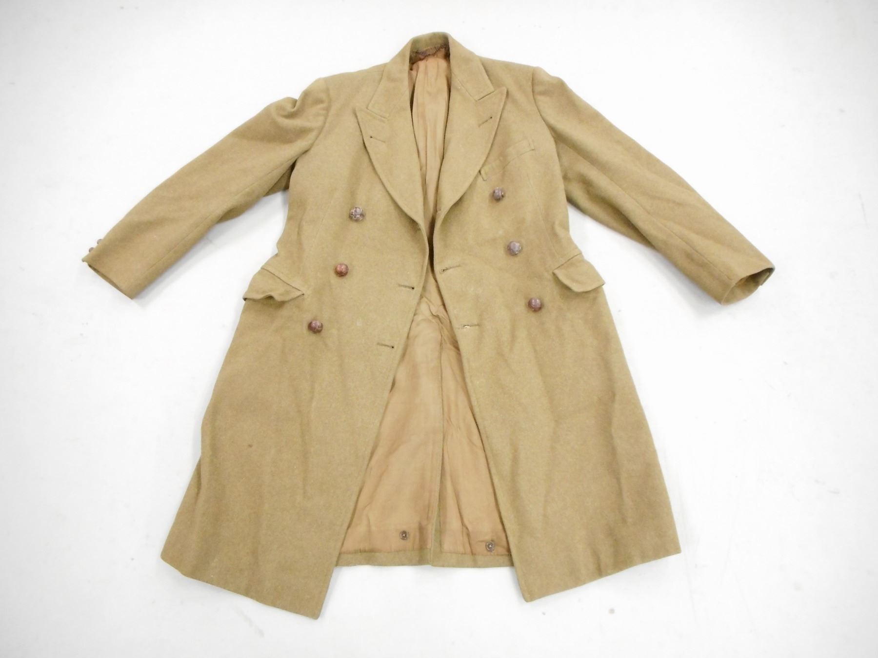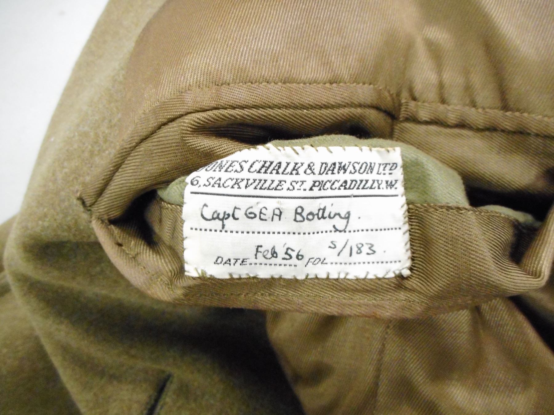 GREEN WOOL LONG COAT , LABELED CAPT. G.E.A. BOTTING DATED FEB '56 IN CONJUNCTION WITH BOTTING ITEMS