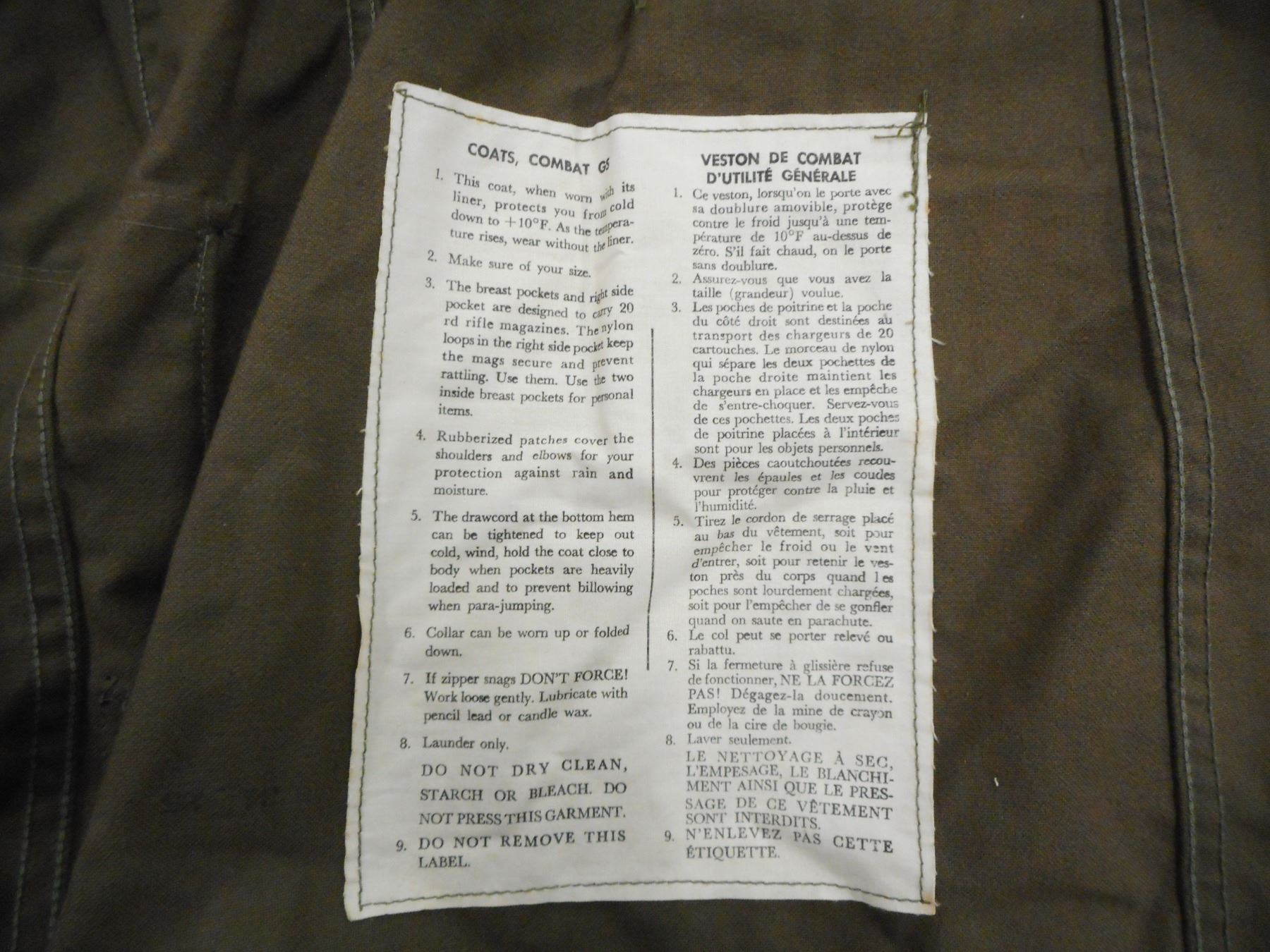 MENS COAT COMBAT GS, DATED OCTOBER 1965 SIZE 9X LONG X LARGE