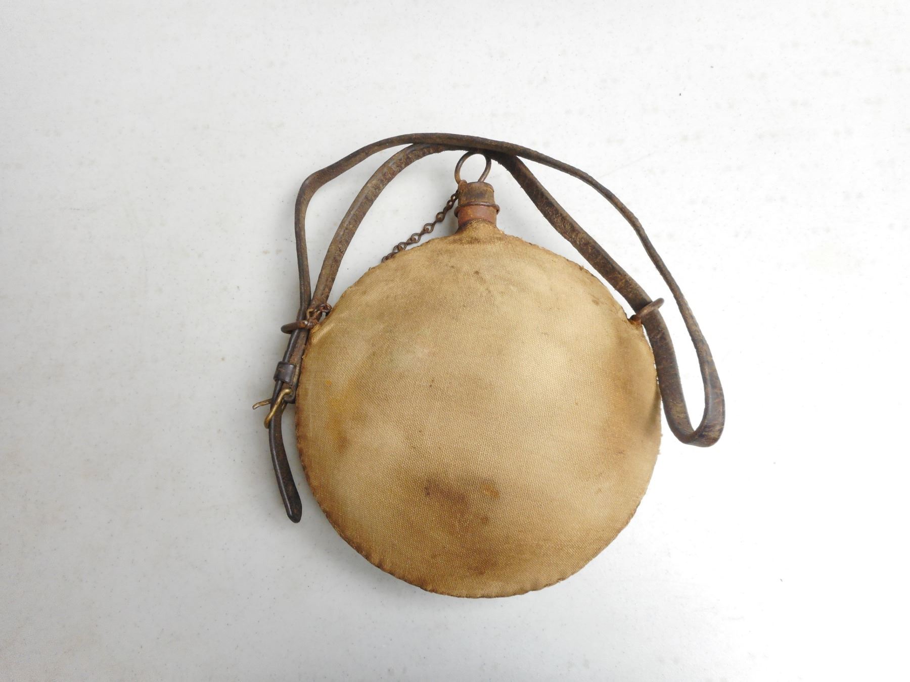 ANTIQUE U.S. ARMY CANTEEN , MODEL 1878-1885, WITH CANVAS COVER STAMPED U.S., CORK STOPPER WITH CHAIN & LEATHER SADDLE ATTACHMENT STRAP