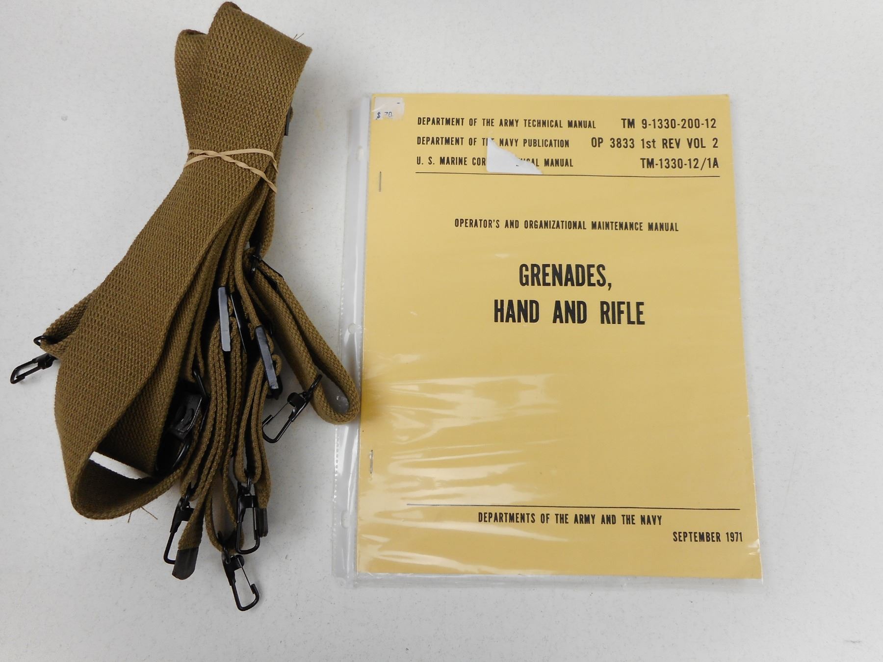 U.S. MILITARY SUSPENDERS & MANUAL , WWII ERA U.S. ARMY "SUSPENDERS" BELT M-1936, & OPERATOR'S AND ORGANIZATIONAL MAINTENANCE MANUAL GRENADES, HAND AND RIFLE, LOT OF 2