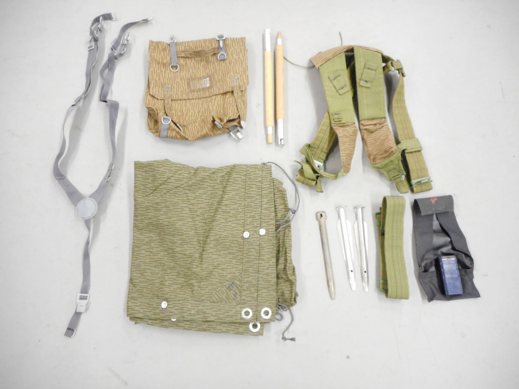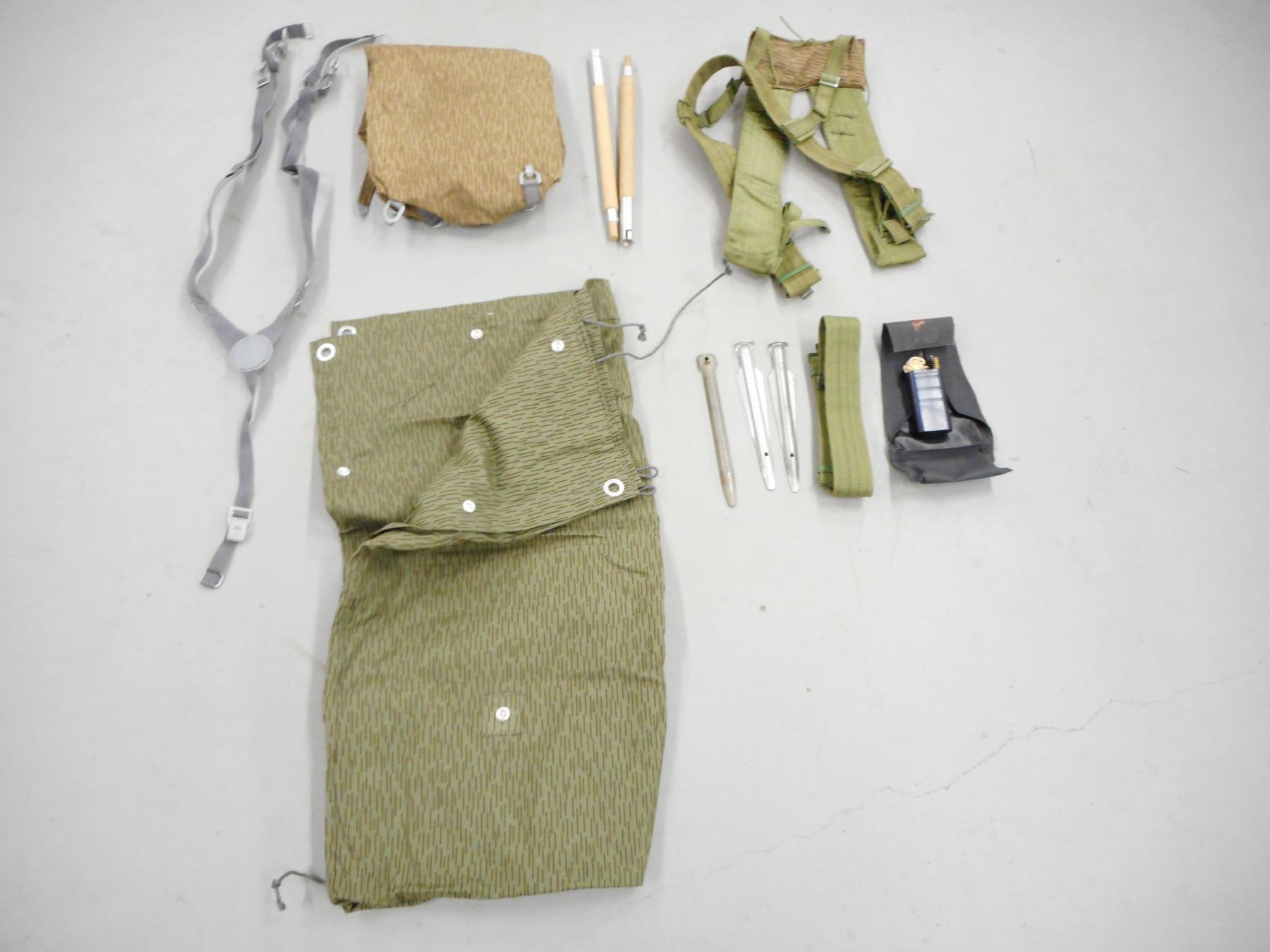 ASSORTED EAST GERMAN GEAR , INCLUDES RAIN COVER, "Y" STRAPS, HARNESS, BACKPACK, PEGS & TOOL KIT