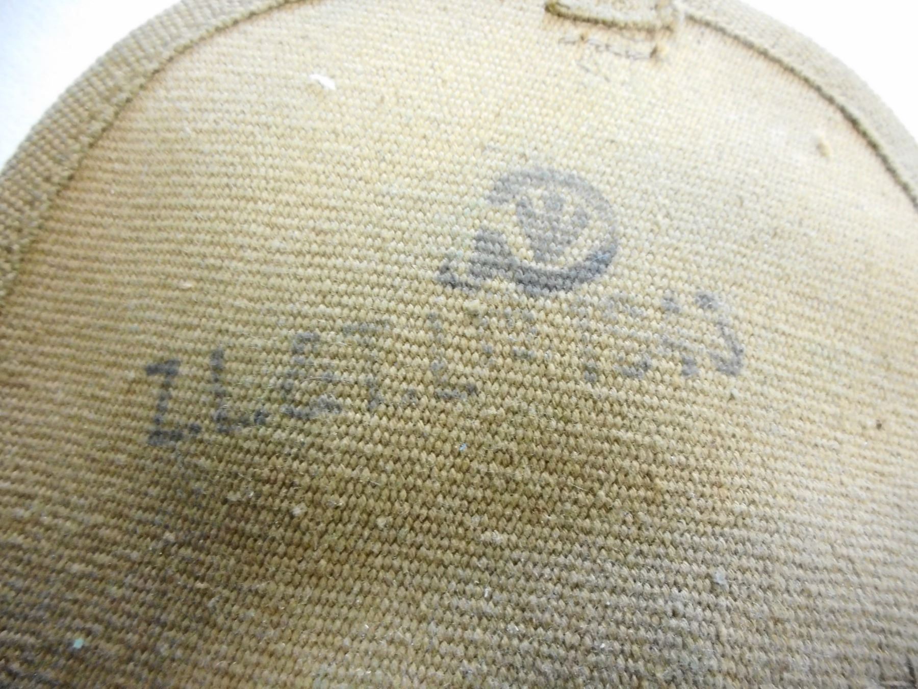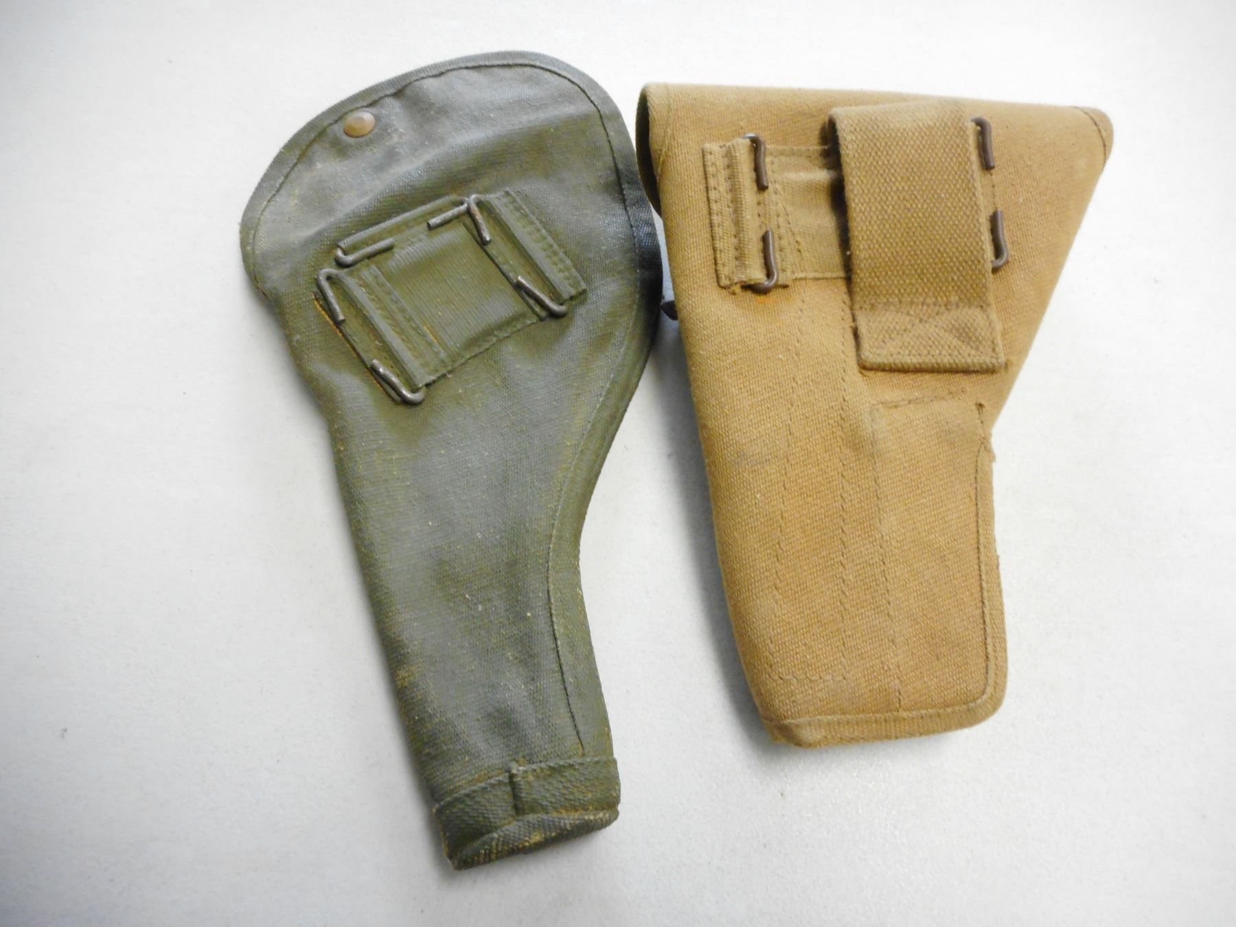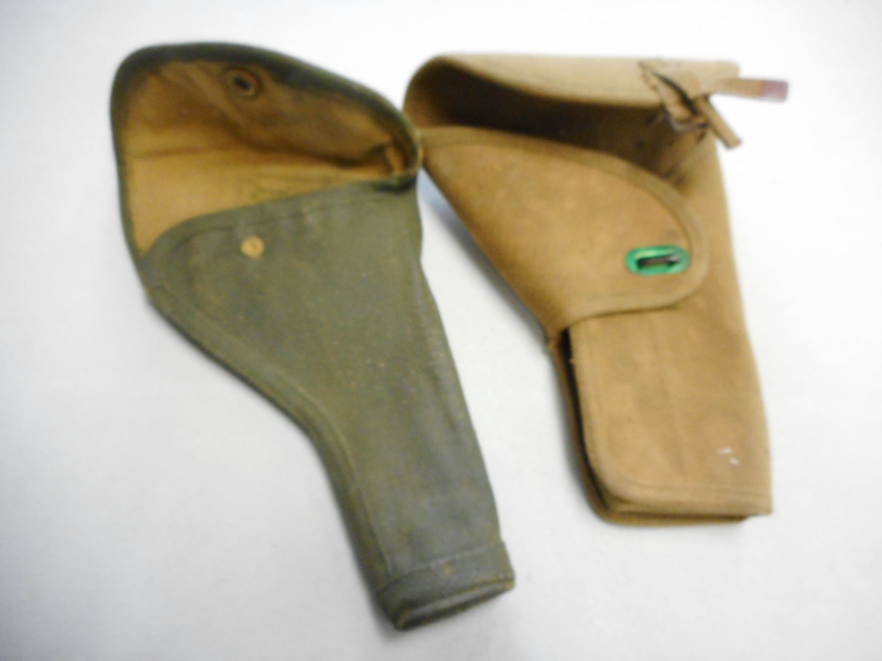 CANADIAN WWII HOLSTERS, (1) GREEN WAXED CANVAS CANADIAN BROAD ARROW STAMPED, DATED 1943, (1) KHAKI CANVAS CANADIAN BROAD ARROW STAMPED Z.L.&T. LTD. 1943, LOT OF 2