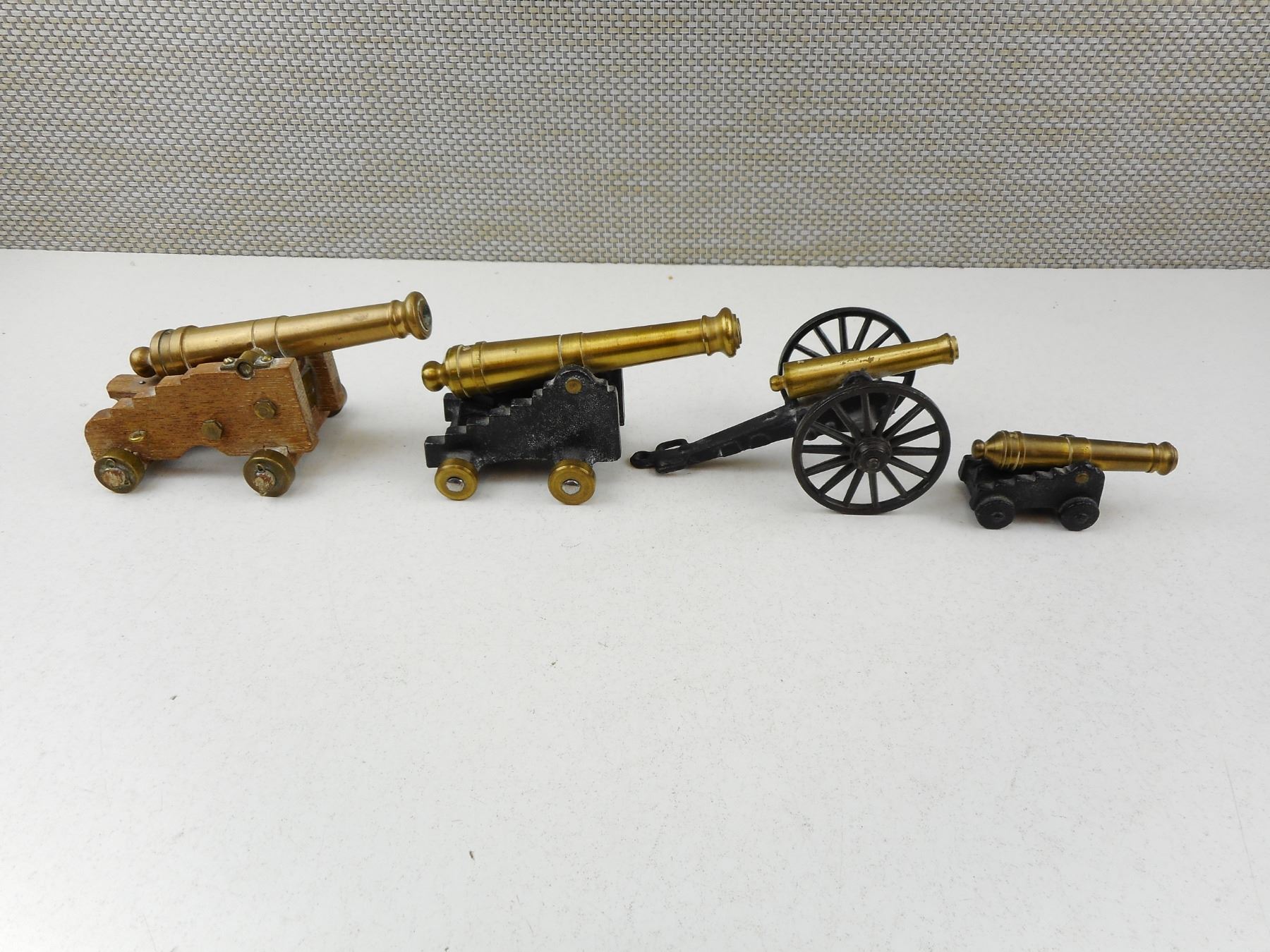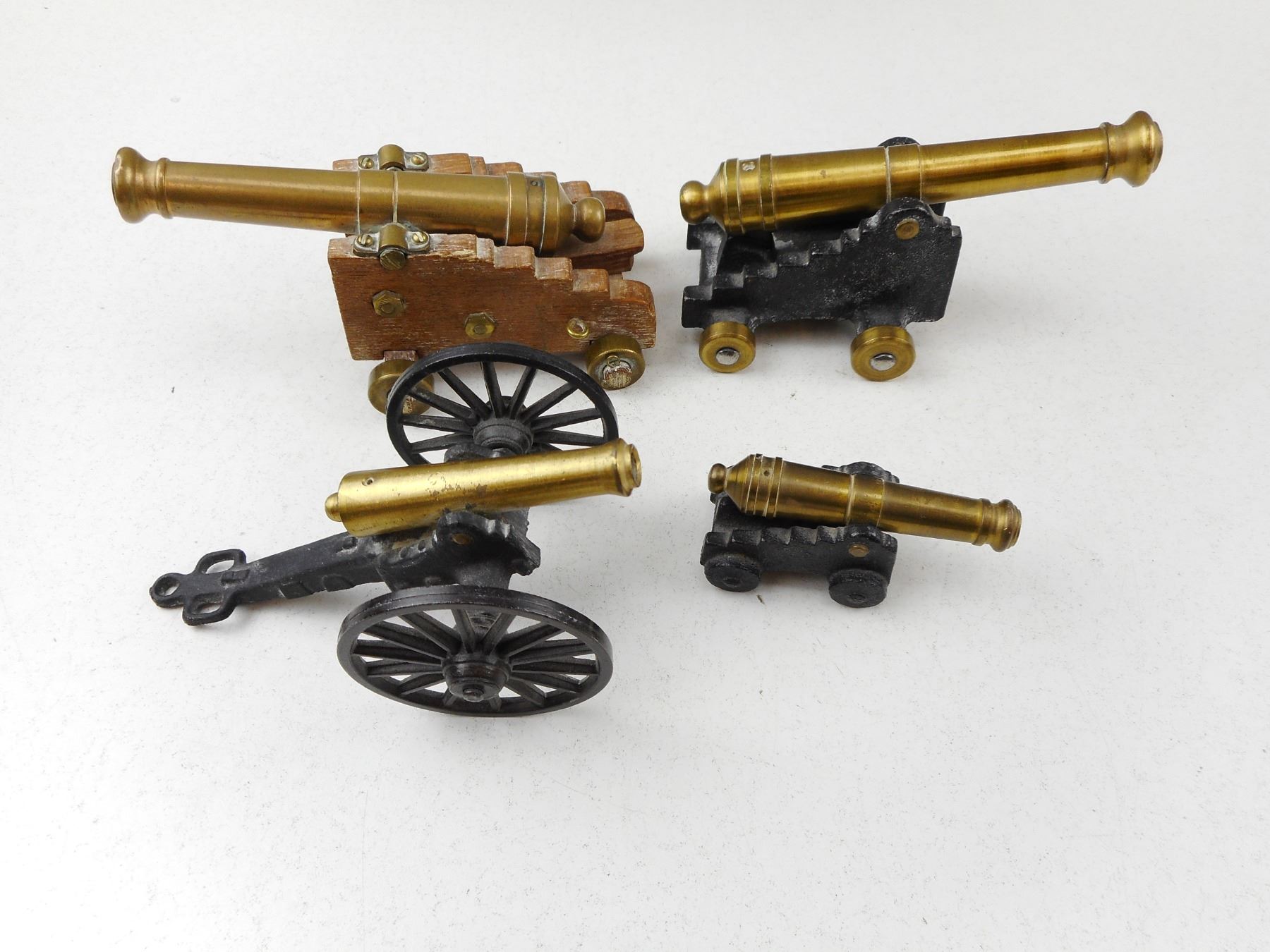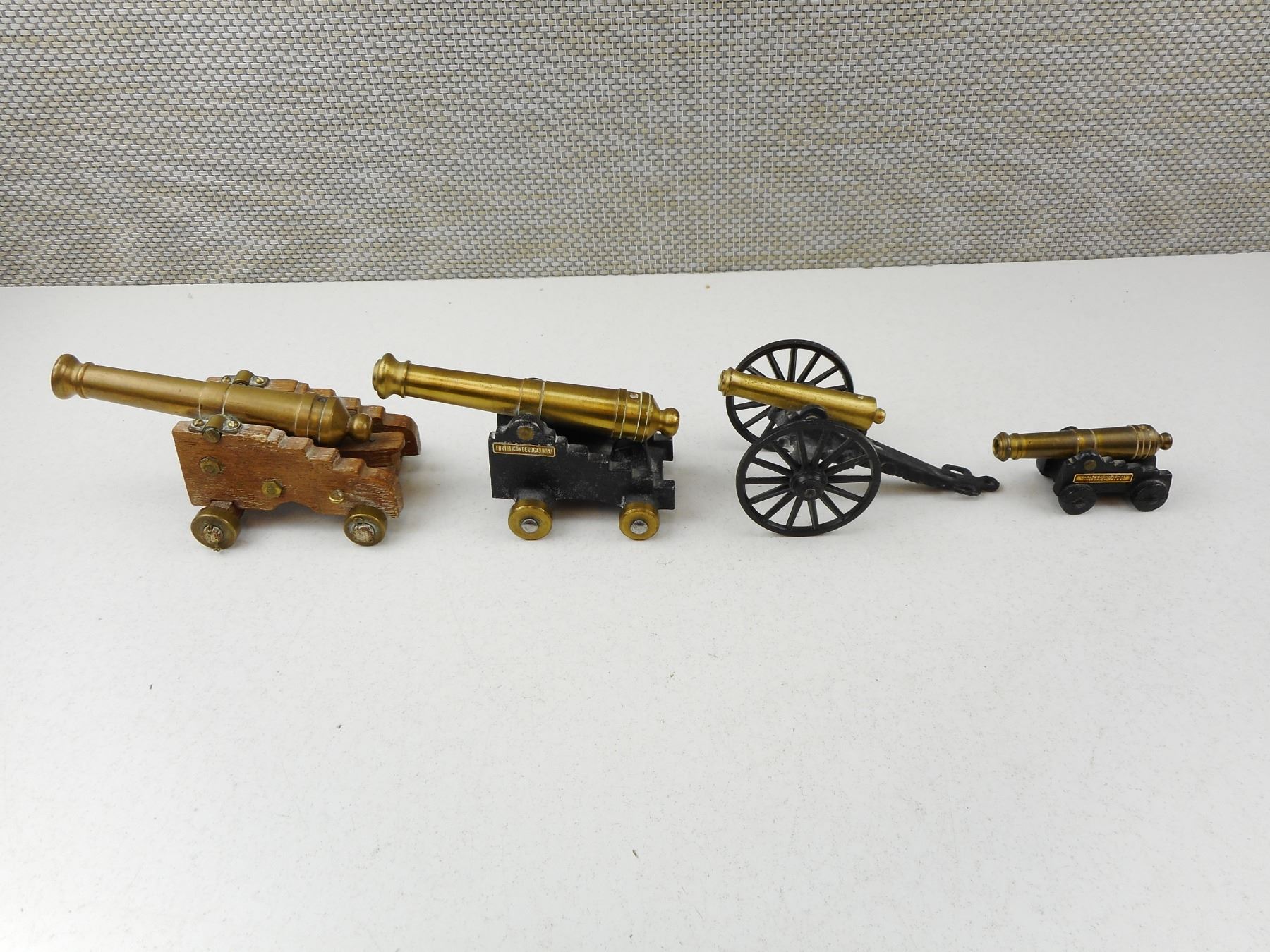 REPRODUCTION CANNONS, (1) MARKED SARATOGA NATIONAL HISTORICAL PARK BOTTOM: 1/0 MFCO (1) MARKED FORT TICONDIROGA, N.Y. BOTTOM: 1/4 MFCO, (1) BOTTOM: C1/2 MFCO, (1) WITH WOODEN BASE MARKED FROM OLD FORT HENRY KINGSTON CANADA, LOT OF 4