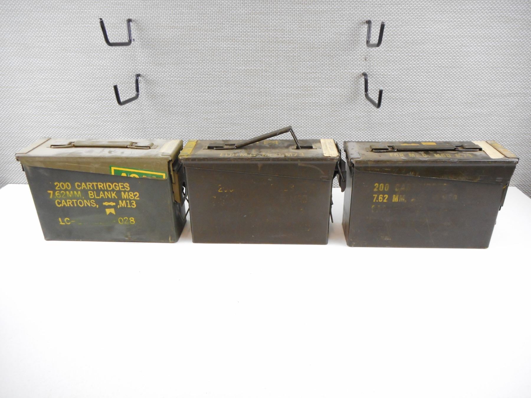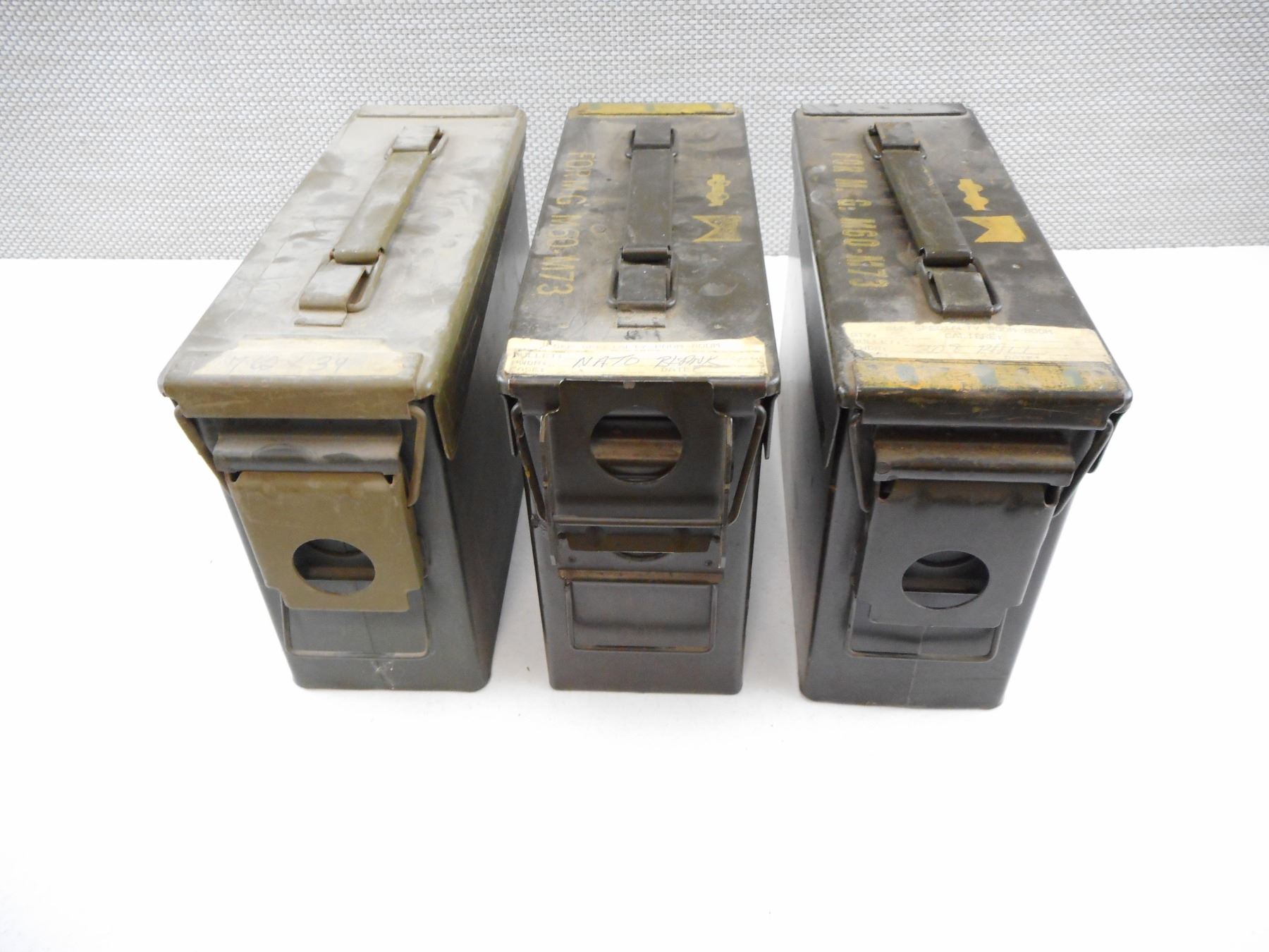 AMMO TINS , (2) STAMPED FOR M.G. M60-M73 ON TOP WITH SIDES MOSTLE WORN OFF SIZE 10 X 7 X 3.5", (1) STAMPED 200 CARTRIDGES 7.62 MM BLANK M82 CARTONS SIZE 10 X 7 X 3.5", LOT OF 3