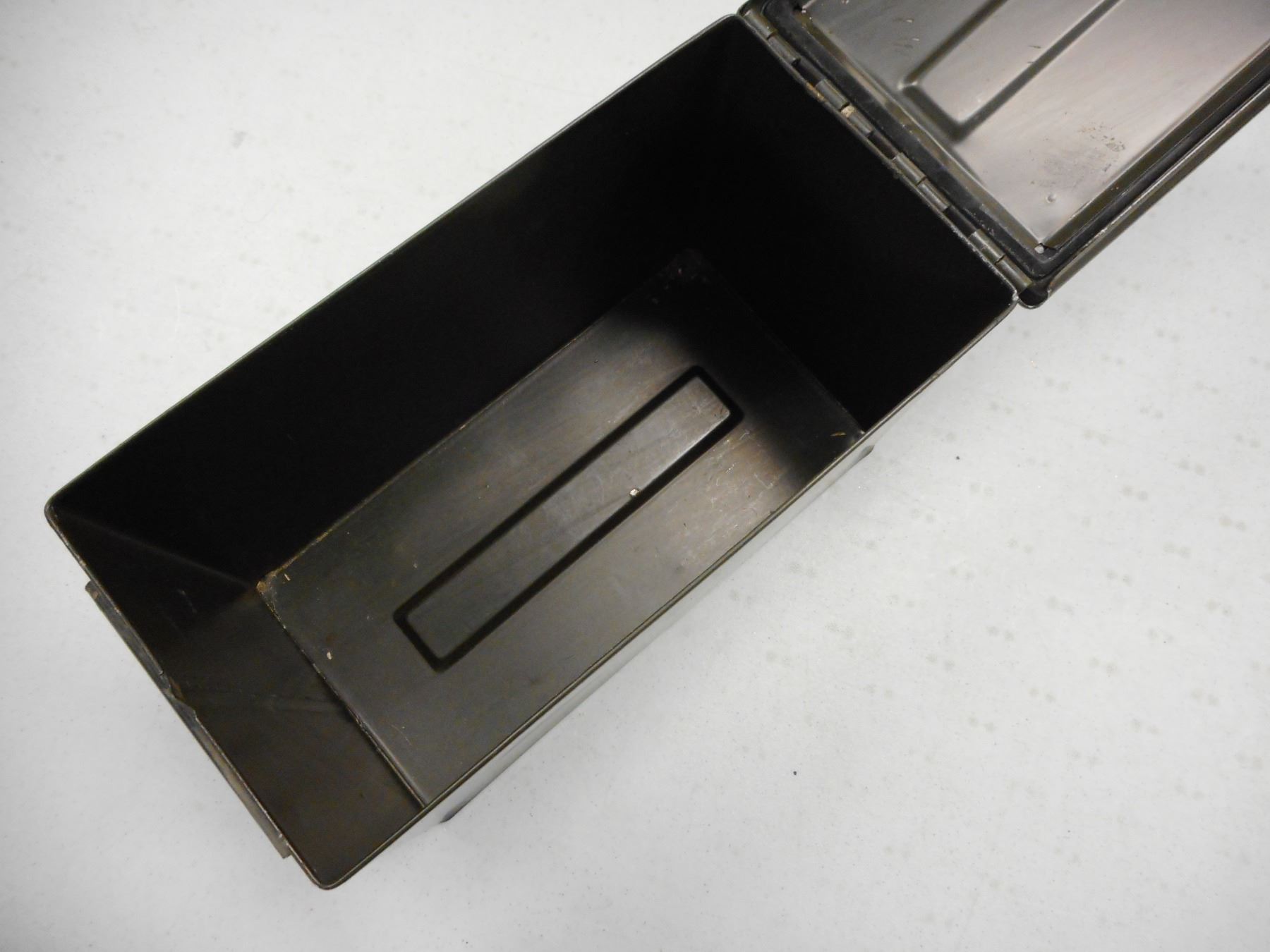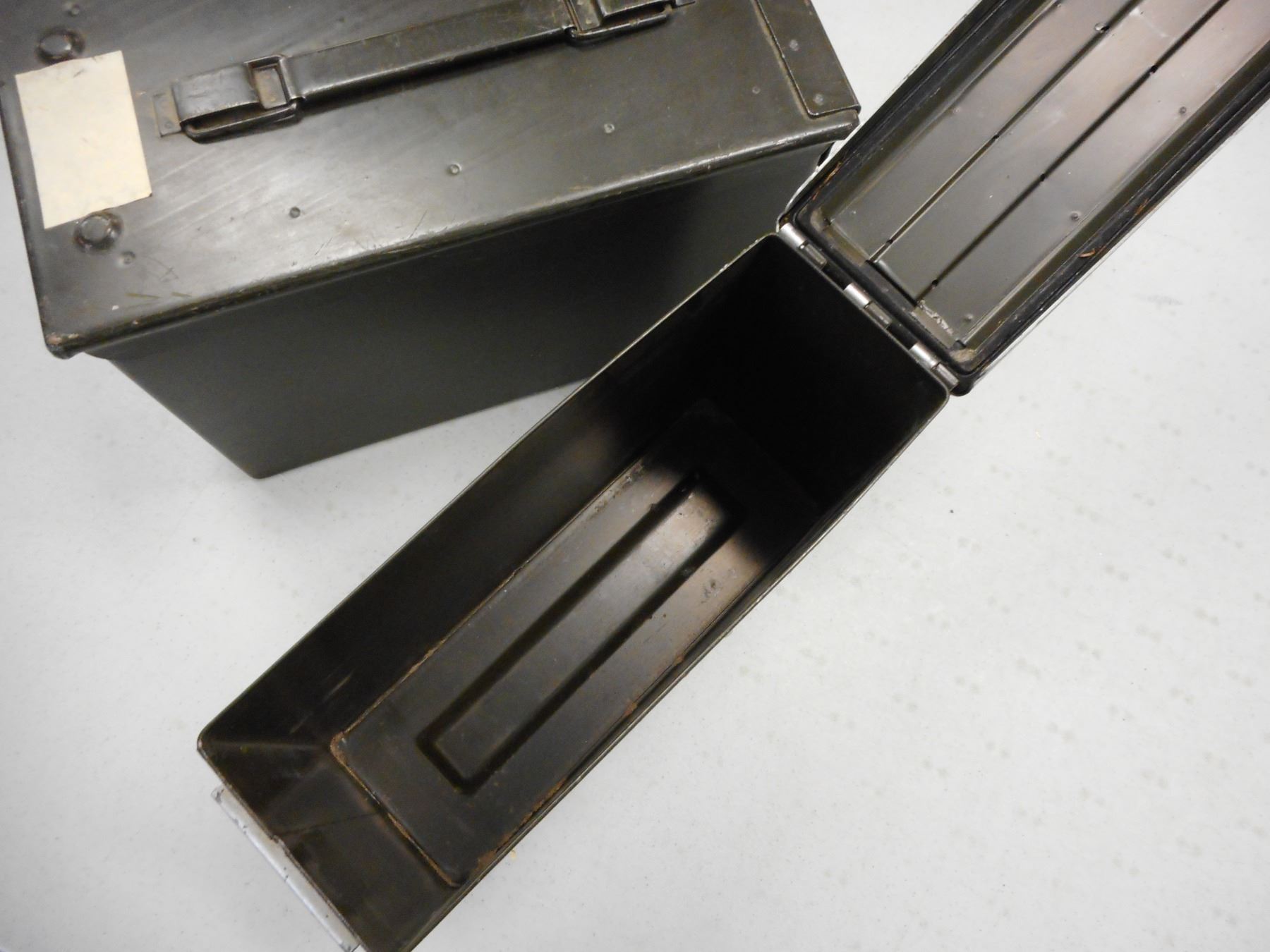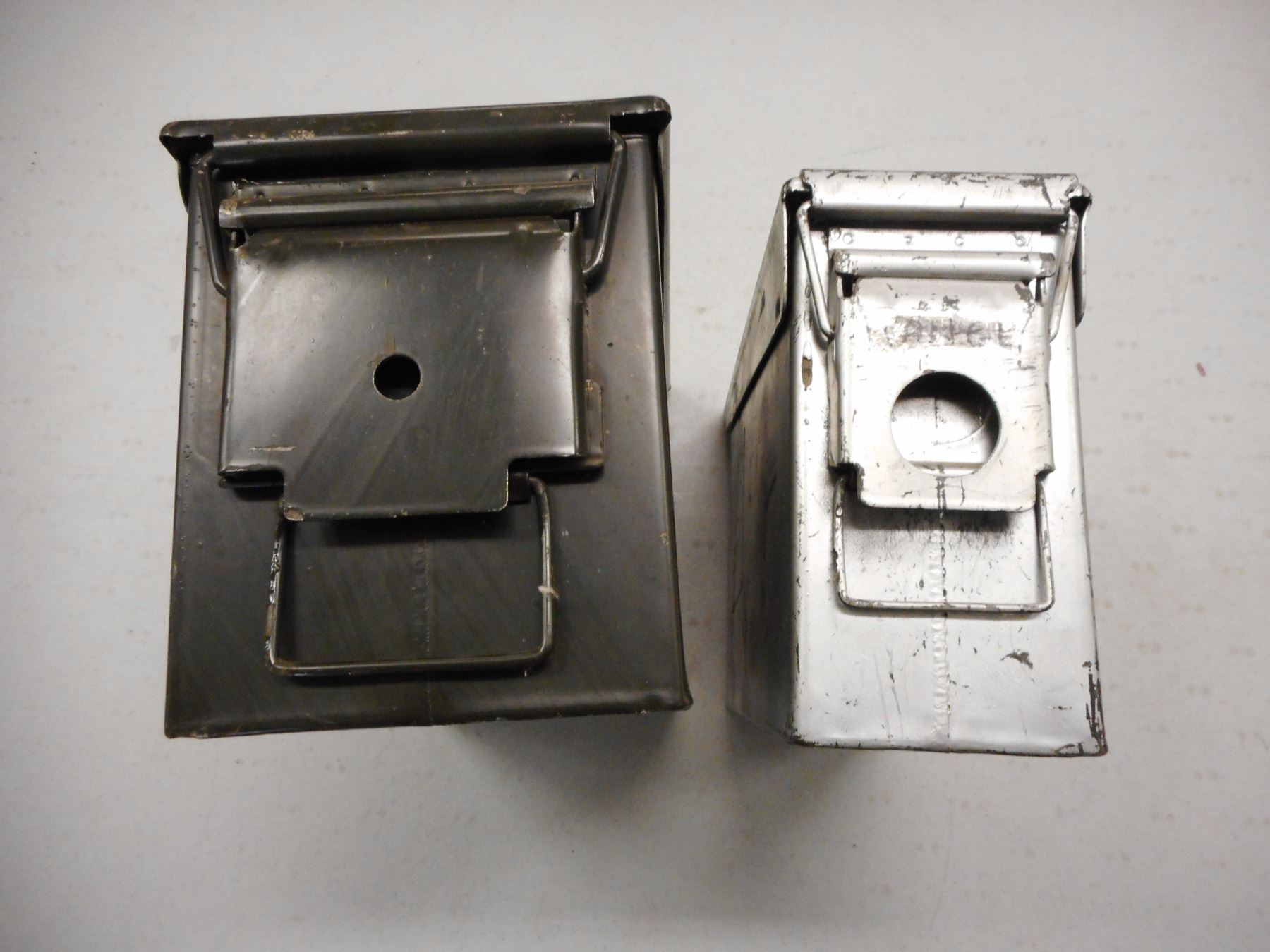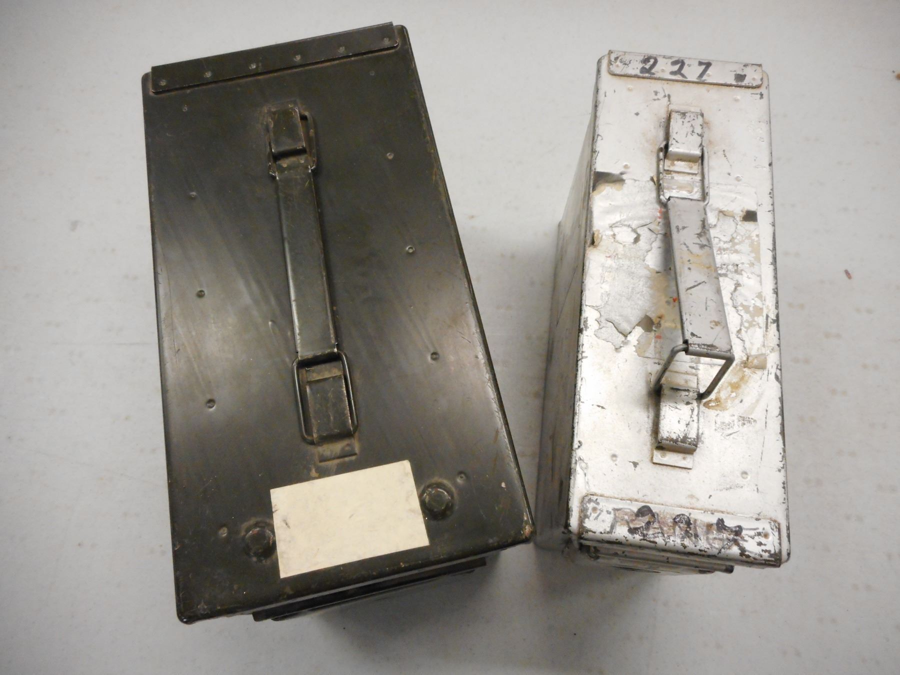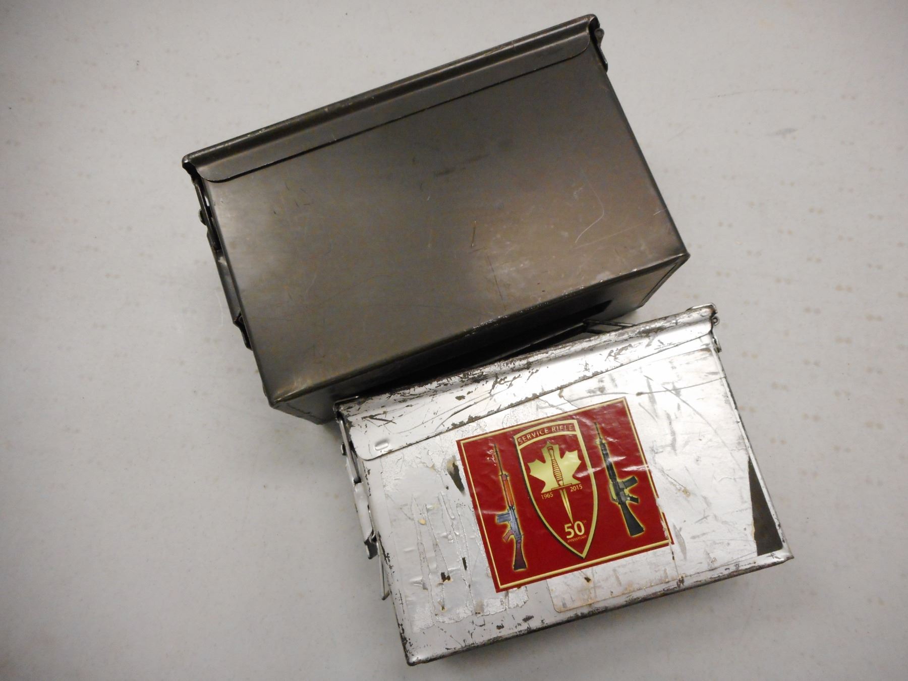 AMMO TINS, (1) STAMPED BUT WORN MOSTLY OFF SIZE 11 X 7 X 5.5", (1) SILVER PAINTED SIZE 10 X 7 X 3.5", LOT OF 2