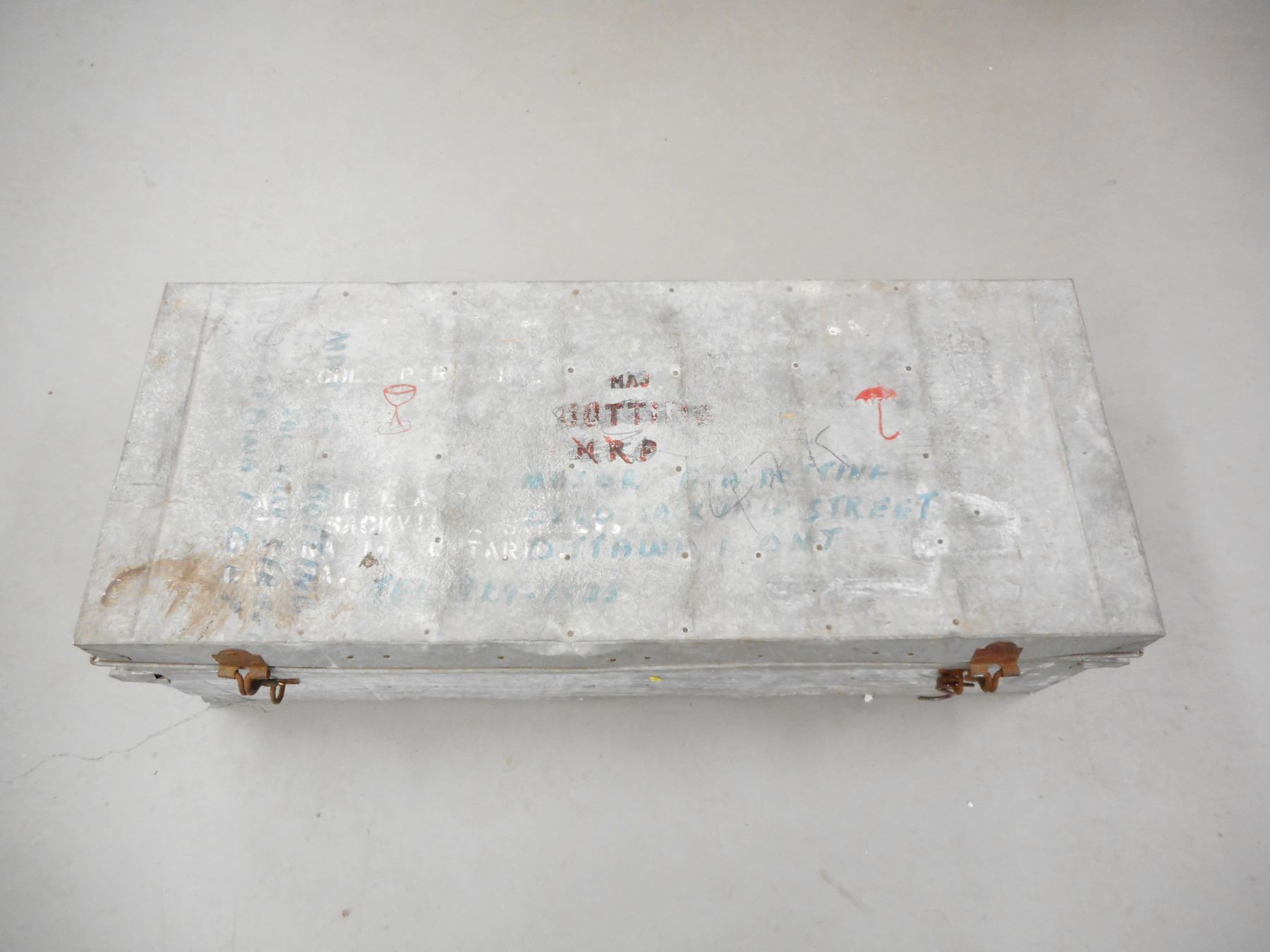 LARGE STEEL TIN , FROM COLLECTION OF VETERAN G. BOTTING APPROX SIZE 44.5 X 18 X 13", NO SHIPPING ON THIS ITEM