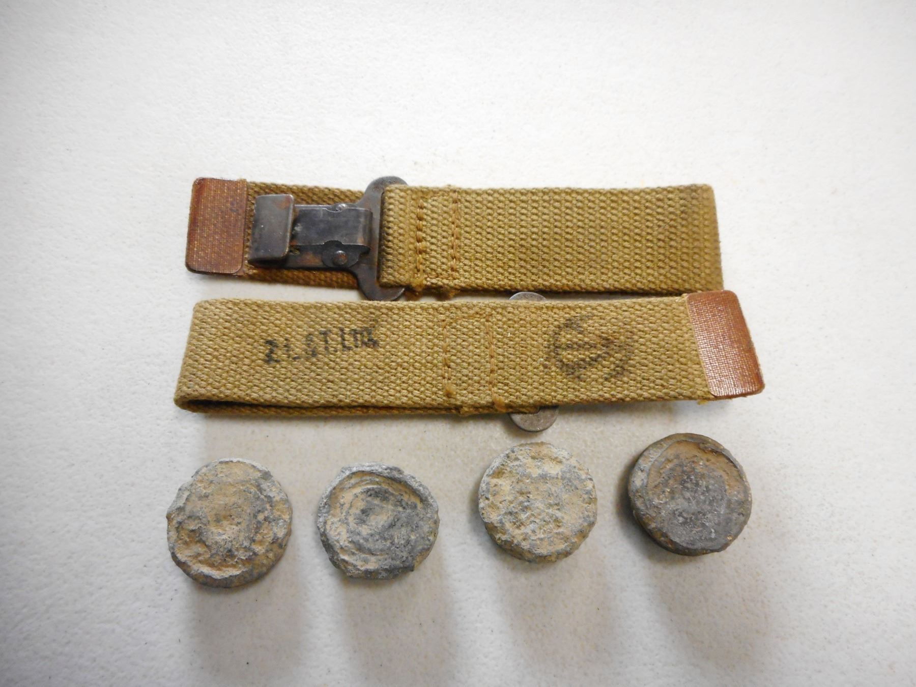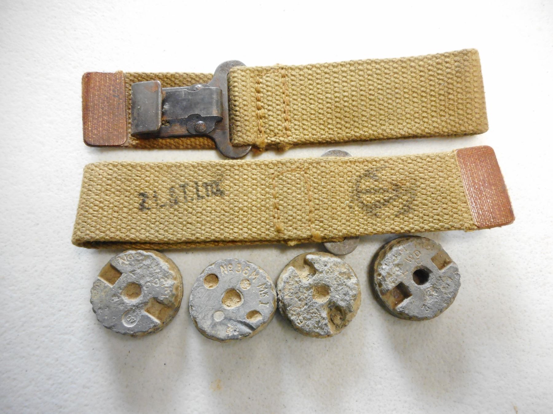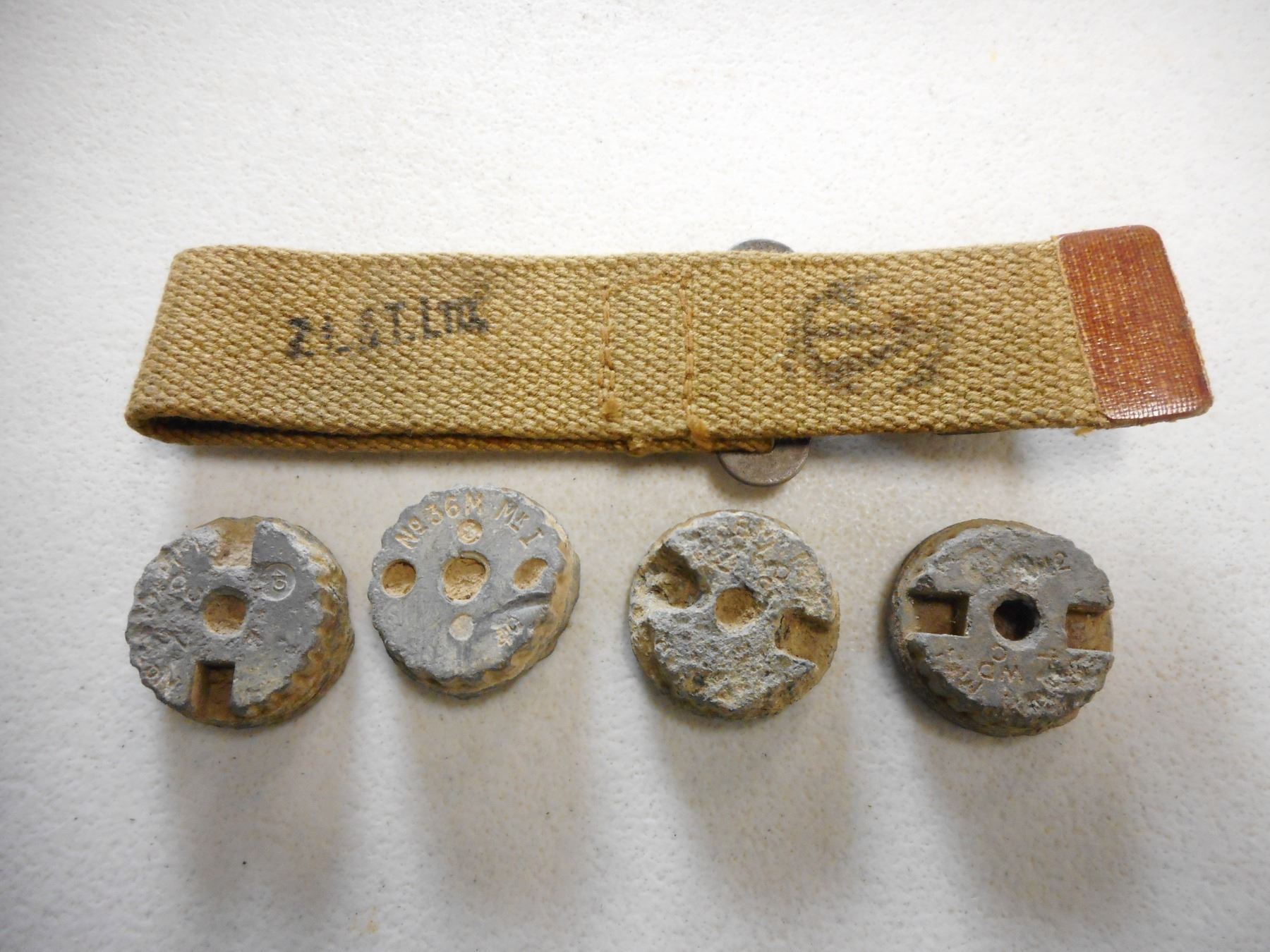 CANADIAN WWII STRAPS & GRENADE PLUGS/CAPS, STRAPS STAMPED Z.L.&T. LTD. WITH CANADIAN BROAD ARROW MARK,(4) PLUGS FROM BRITISH MILLS GRENADE: (1) PLUG MARKED NO 36M MKI, (1) PLUG MARKED ZWD, LOT OF 6