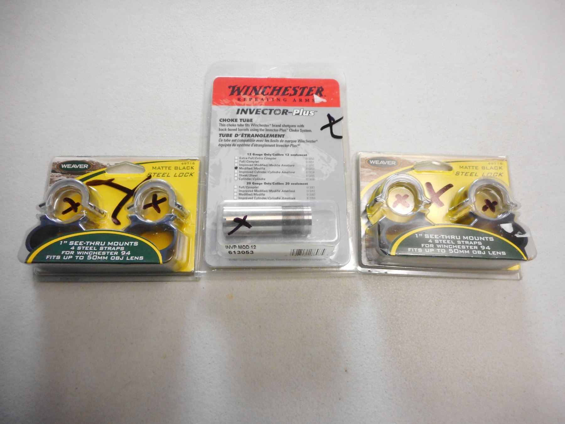 WEAVER SIGHT MOUNTS & WINCHESTER CHOKE TUBE , (2) WEAVER 1" SEE-THRU MOUNTS, (1) WINCHESTER INVECTOR-PLUS MOD. FOR 12 GA, ALL IN ORIGINAL PACKAGING, LOT OF 3
