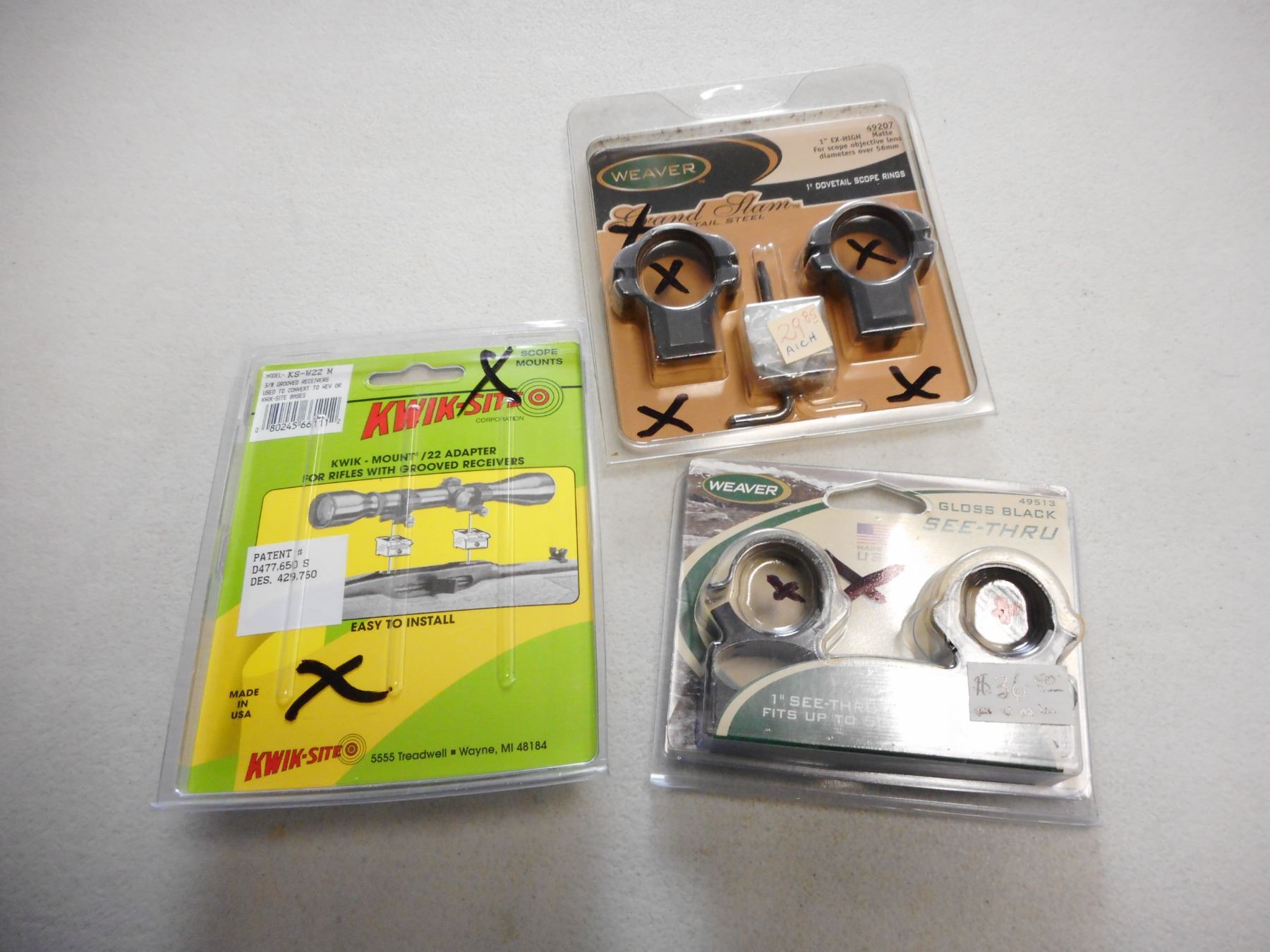 ASSORTED SCOPE MOUNTS , (2) WEAVER 1" MOUNTS: EX-HIGH & SEE THRU-THRU, (1) KWIK-SITE 3/8 GROOVED RECEIVERS, IN ORIGINAL PACKAGING, LOT OF 3