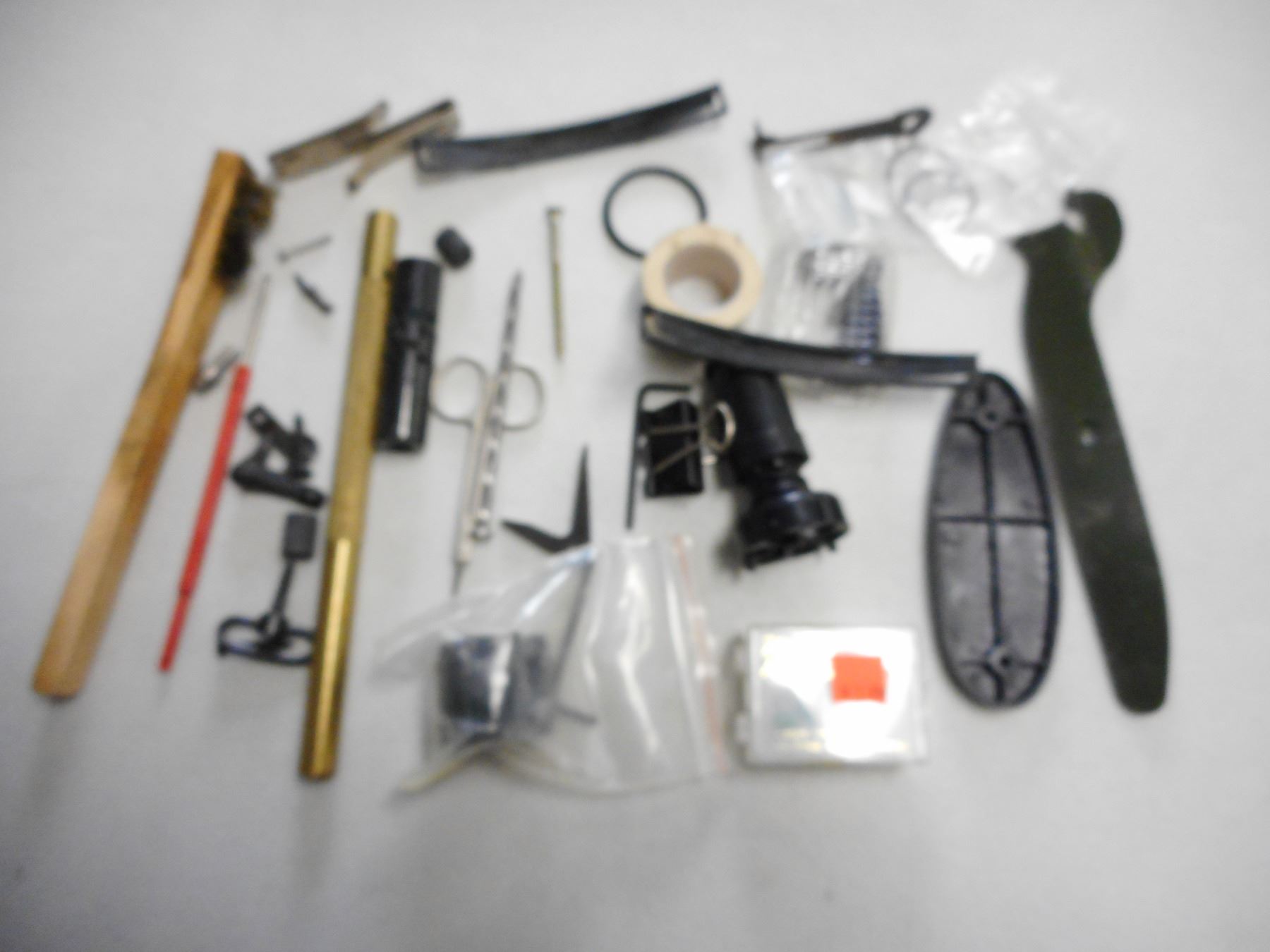 ASSORTED GUN PARTS AND ACCESSORIES, INCLUDES STRIPPER CLIPS, SAFARILAND SPEEDLOADER, BUTT PLATE, MUZZLE BRAKE, SEE PHOTO