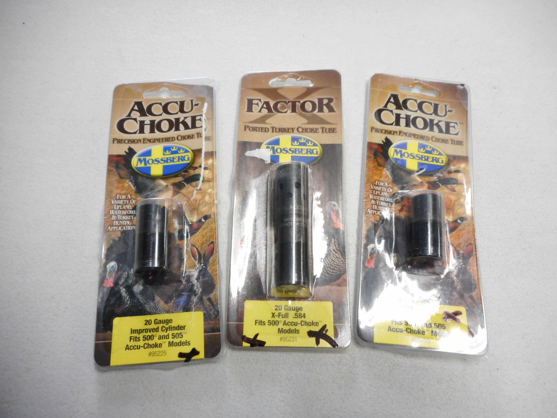 ACCU-CHOKE MOSSBERG 20 GA CHOKES, (1) IMP. CYL, (1) FULL, (1) X-FULL, ALL FIT 500 MODELS IN ORIGINAL PACKAGING, LOT OF 3