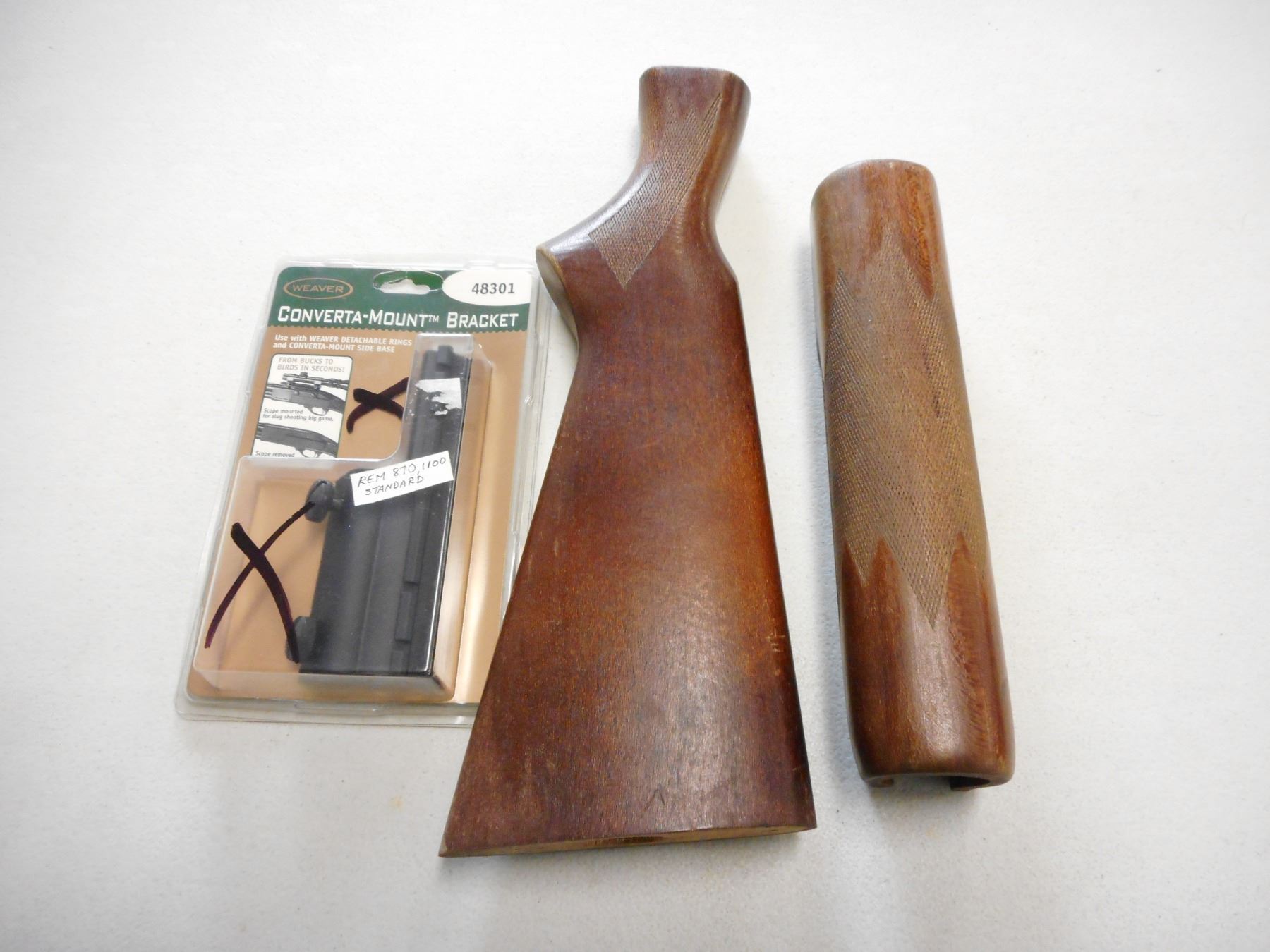 WOODEN GUN STOCK & WEAVER CONVERTA-MOUNT , WEAVER CONVERTA-MOUNT BRACKET REM 870, 1100 STANDARD, IN ORIGINAL PACKAGING, WOODEN BUTT & FORE STOCK
