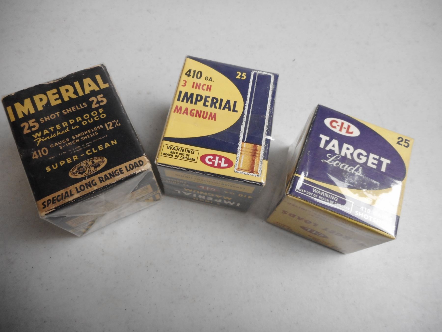 EMPTY ANTIQUE CIL 410 GA BOXES, INCLUDES IMPERIAL WATERPROOF DUCO BOX, CIL TARGET BOX, & IMPERIAL MAGNUM BOX, LOT OF 3