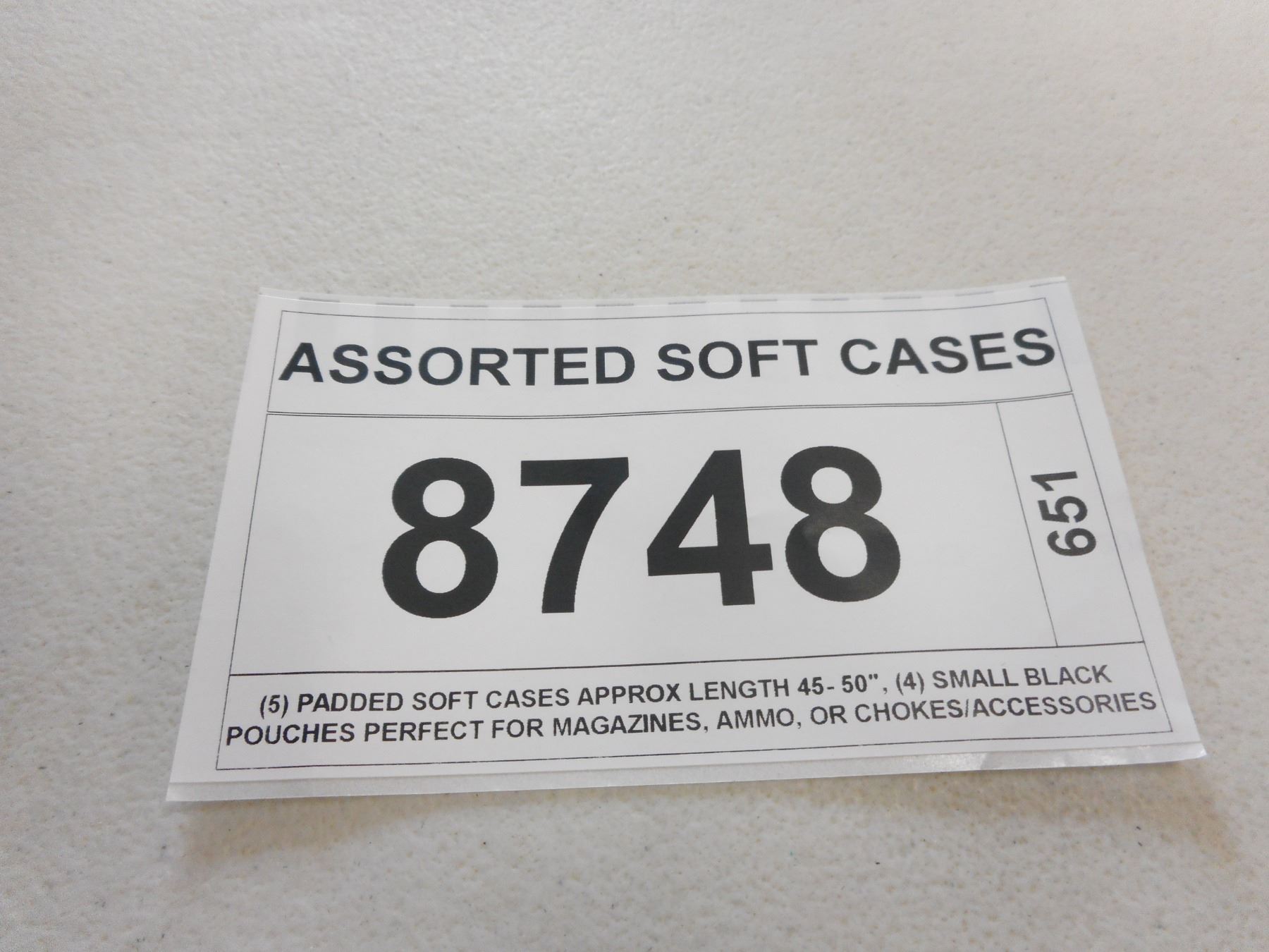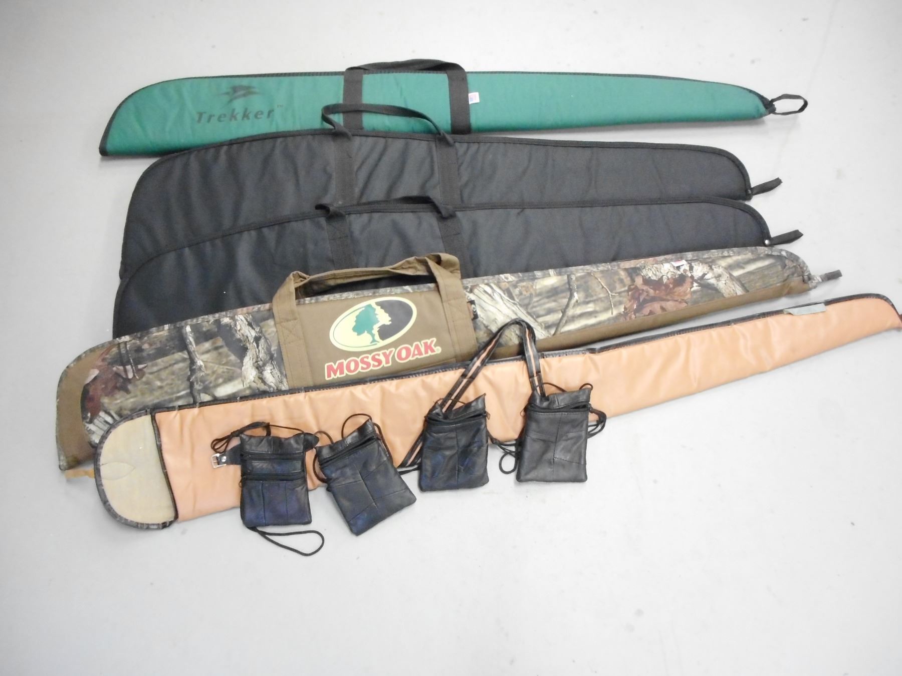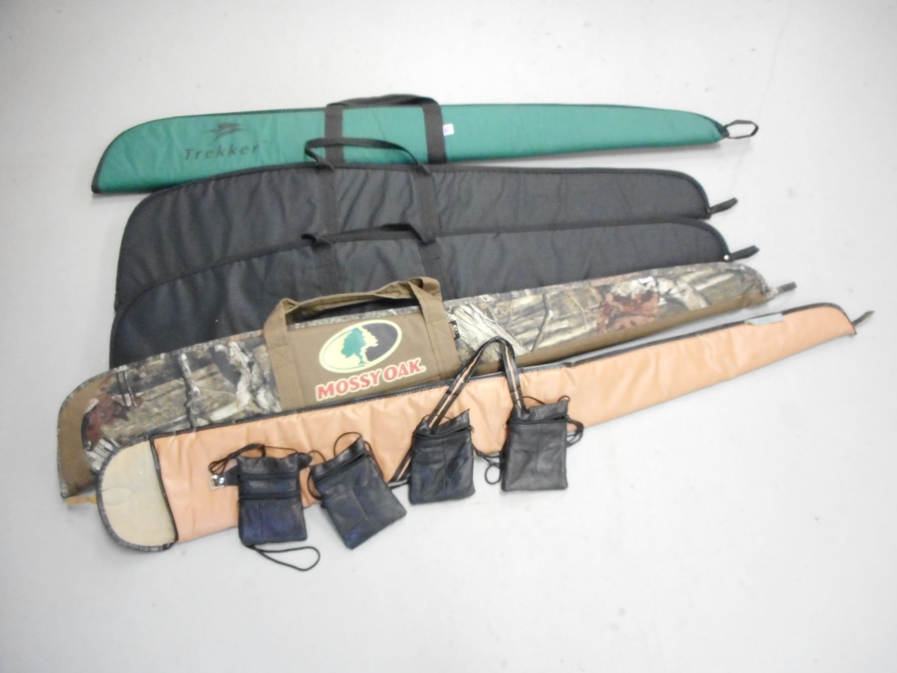 ASSORTED SOFT CASES, (5) PADDED SOFT CASES APPROX LENGTH 45- 50", (4) SMALL BLACK POUCHES PERFECT FOR MAGAZINES, AMMO, OR CHOKES/ACCESSORIES