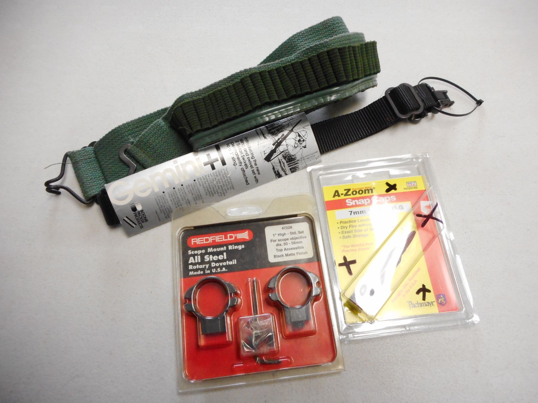 SLING, BELT, SCOPE MOUNT & SNAP CAP, INCLUDES RIFLE SLING, BELT, REDFIELD ROTARY DOVETAIL SCOPE MOUNT, & 7MM REM MAG A-ZOOM SNAP CAP