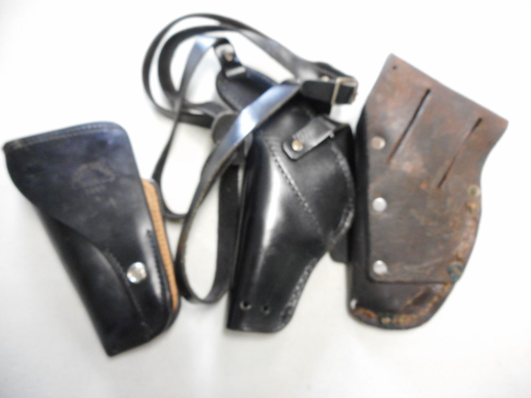 ASSORTED LEATHER HOLSTERS, (1) SHOULDER HOLSTER, (1) MARKED SERVICE MFG. CO. YONKERS, NY 1365 4, (1) BROWN, LOT OF 3