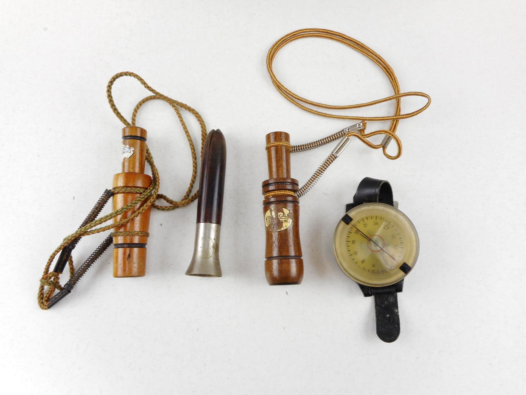 Lot 9213 ANTIQUE/WOODEN DUCK CALLS & WRIST COMPASS