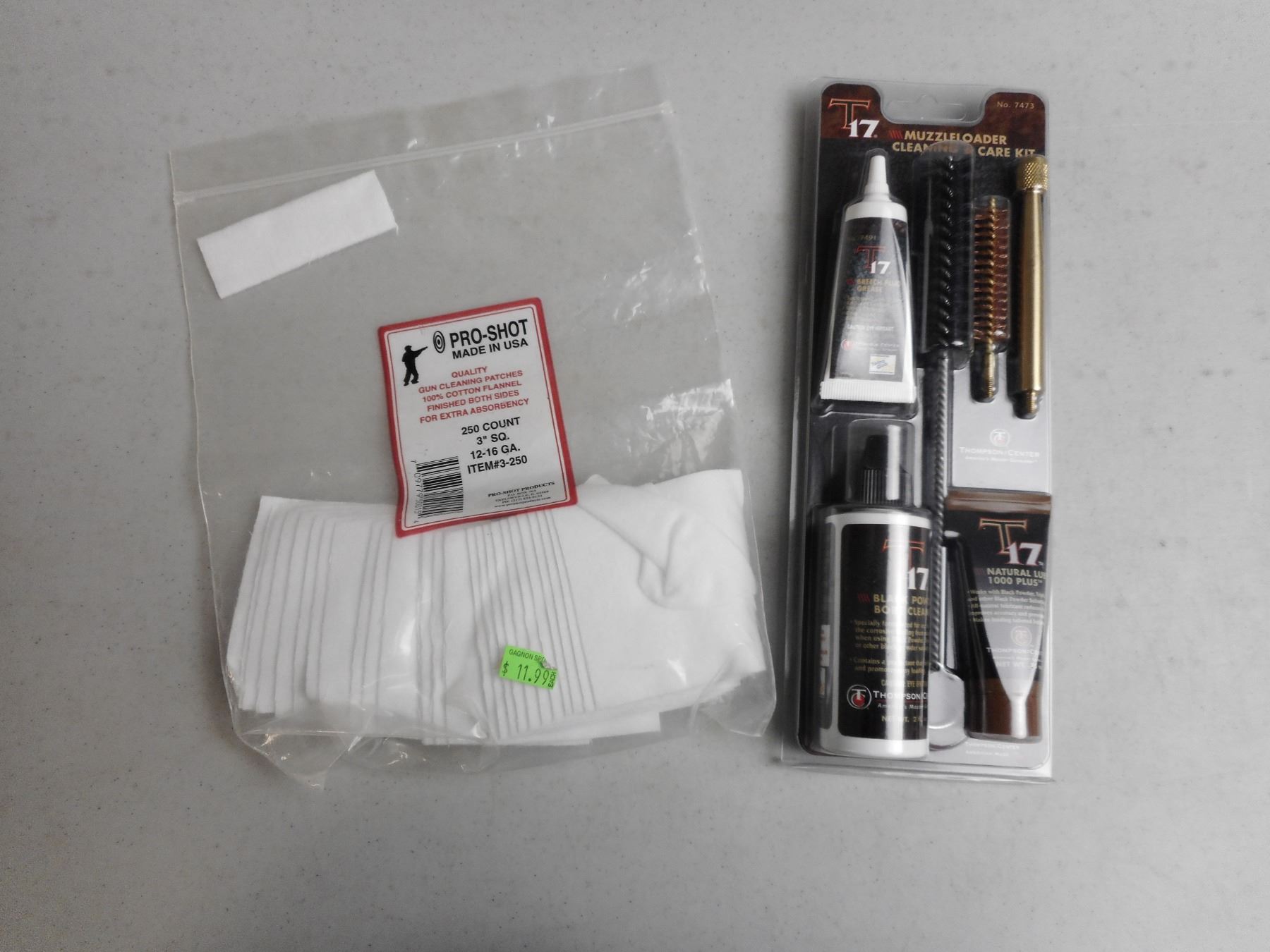 MUZZLE LOADING CLEANING SUPPLES, INCLUDES THOMPSON CENTER T17 CLEANING & CARE KIT- NEW, PRO SHOT 12-16 GA PATCHES-PARTIAL BAG