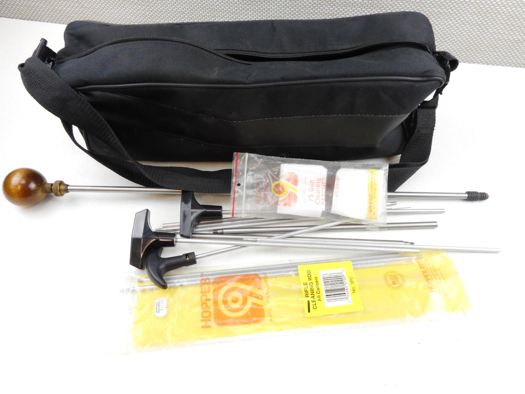 ASSORTED CLEANING TOOLS & CASE, ASSORTED CLEANING RODS, PRIMING ROD, & PATCHES, WITH BLACK SOFT CASE