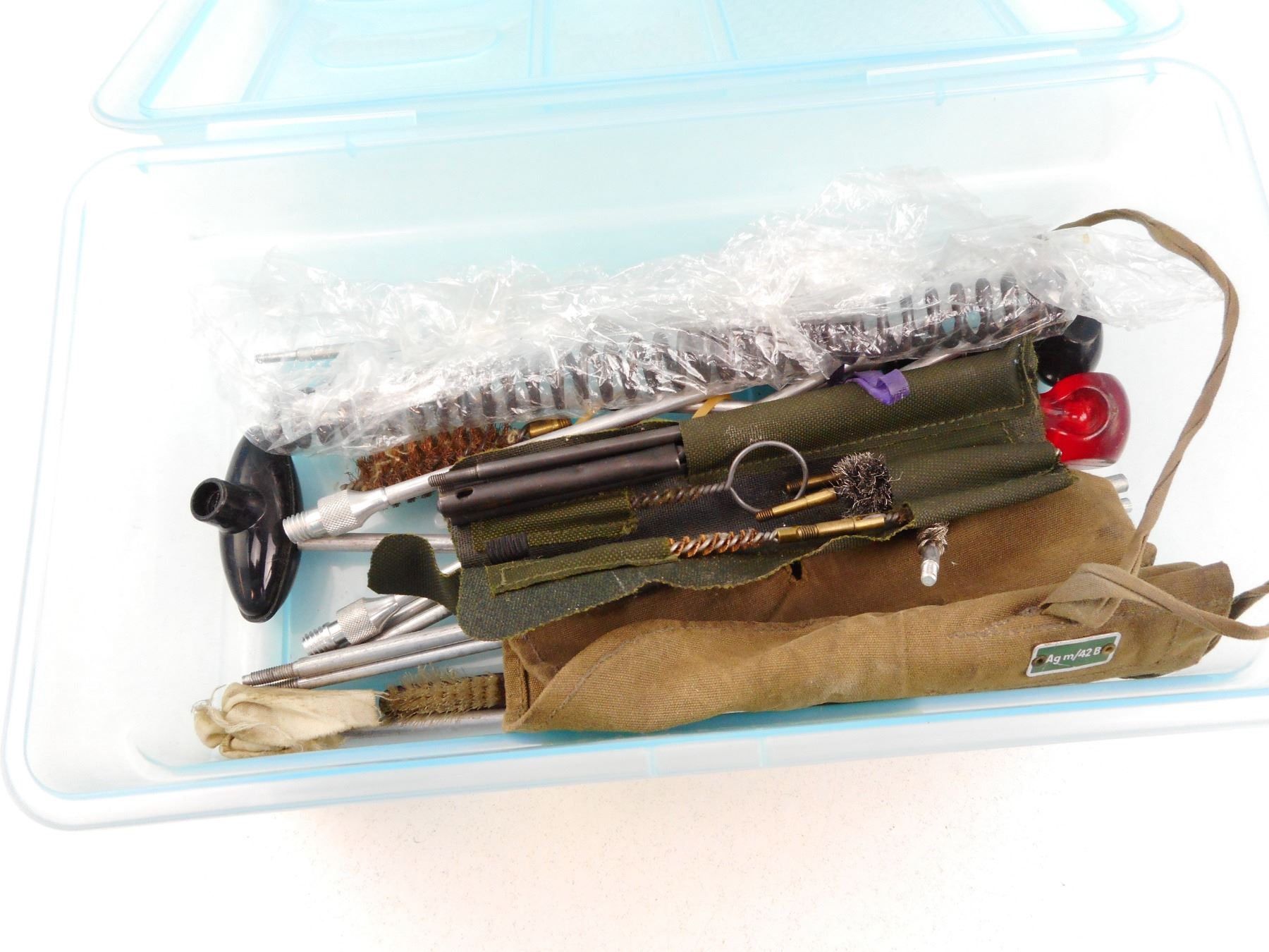 ASSORTED CLEANING ACCESSORIES , INCLUDES RODS, BRUSHES & MILITARY KITS, AMMO TIN SIZE 11 X 7.5 X 5.5"