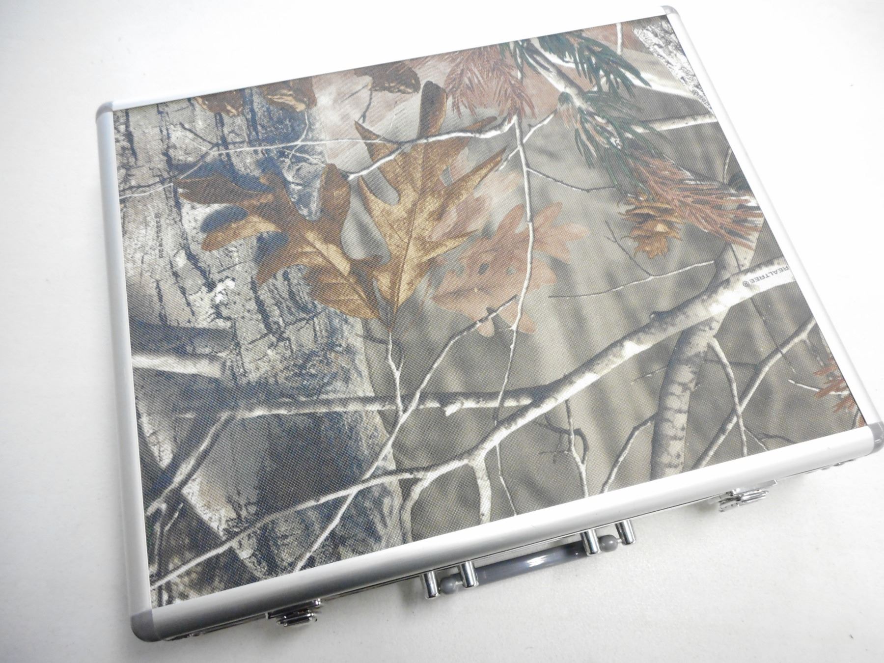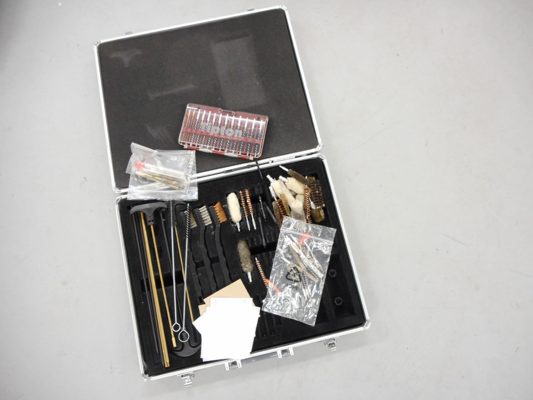 ASSORTED CLEANING EQUIPMENT & HARD CASE, INCLUDES ASSORTED SOFT AND BRISTLE BRUSHES, CLEANING RODS, TIPTON BRUSH SET, IN HARD CAMO CASE 16 X 13 X 3.5"