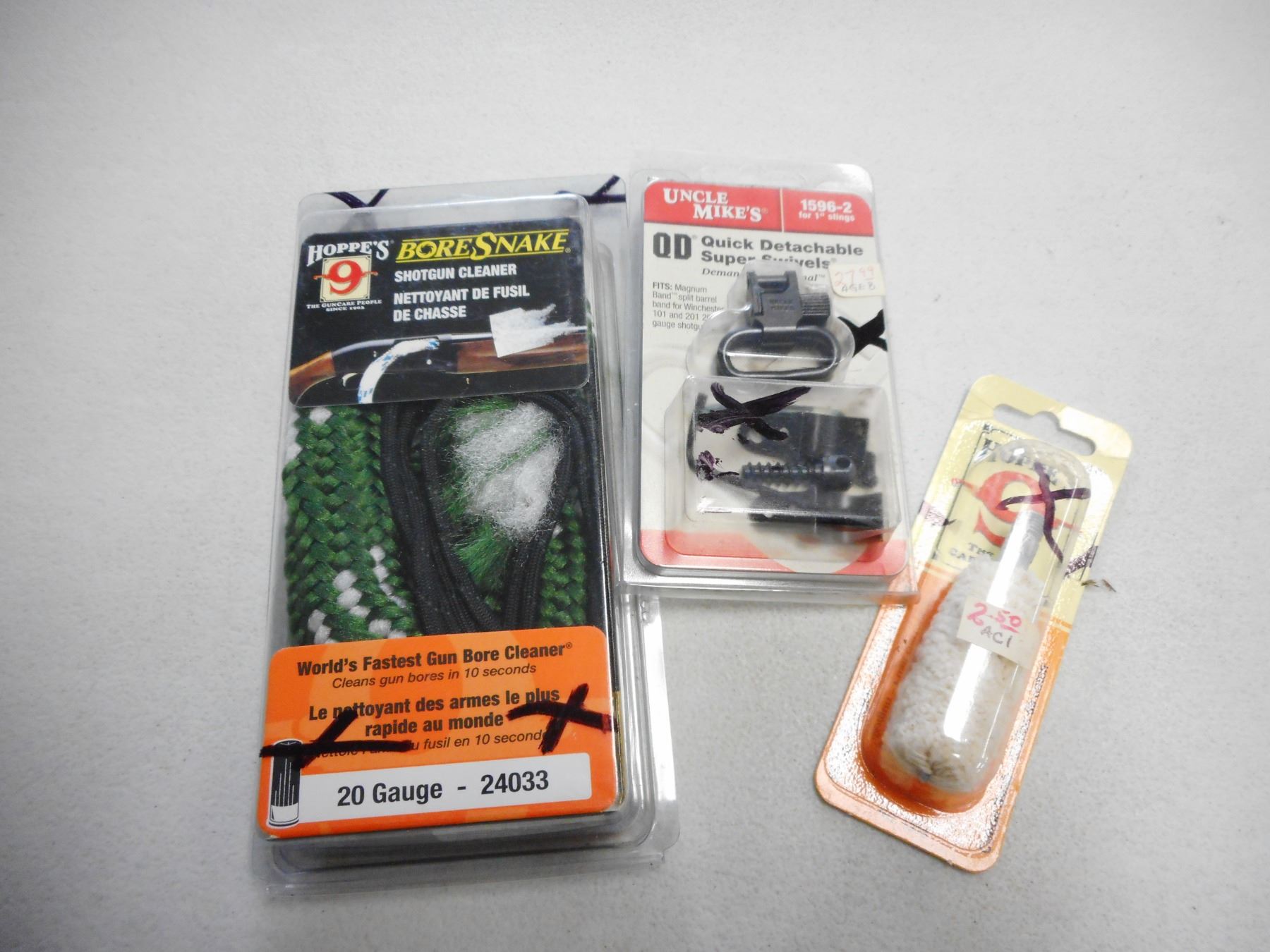 ASSORTED 20 GA ACCESSORIES , (1) HOPPE'S BORE SNAKE, (1) HOPPE'S COTTON SWAB, UNCLE MIKE'S QUICK DETACHABLE SUPER SWIVELS, ALL IN ORIGINAL PACKAGING