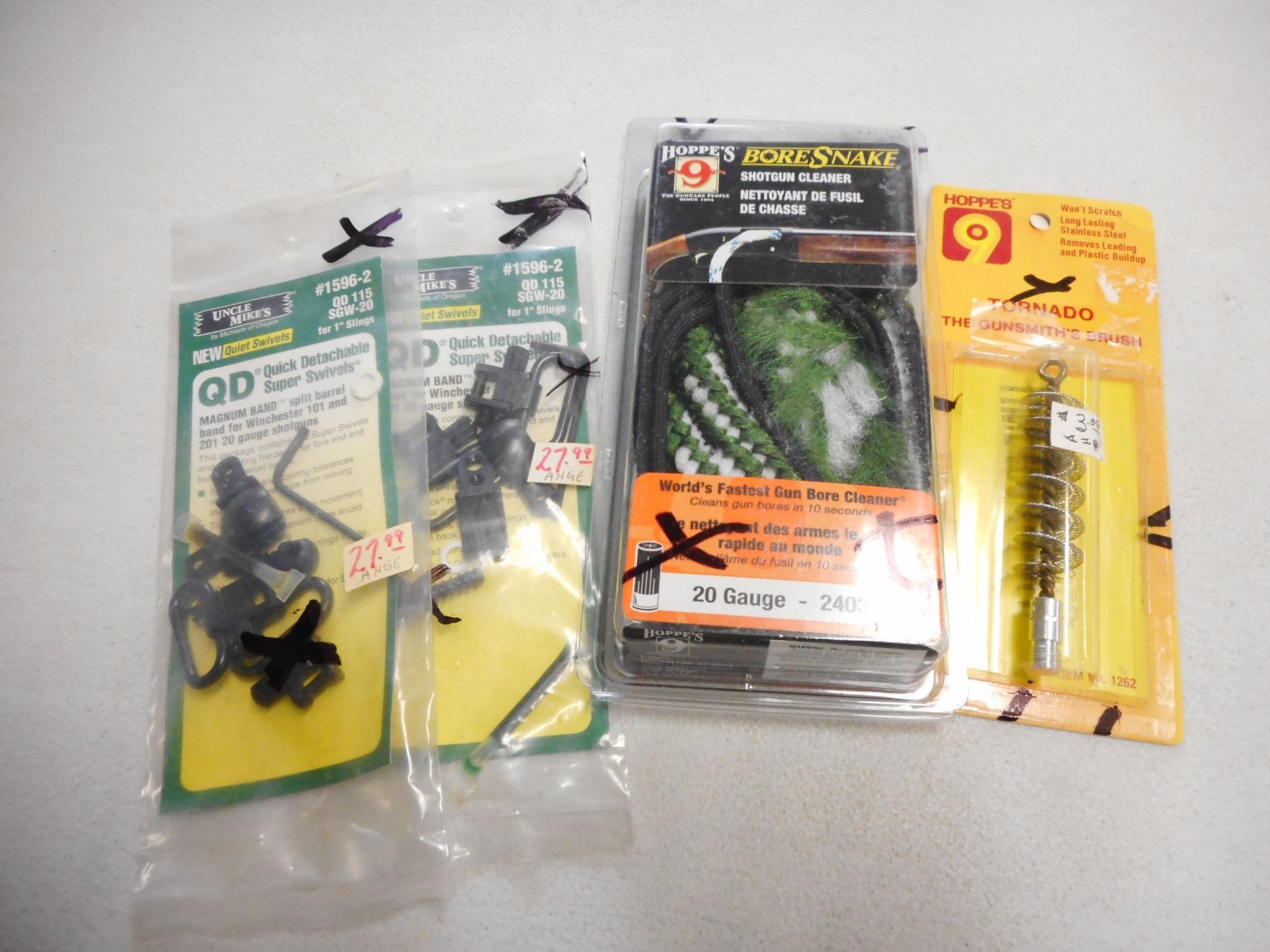 ASSORTED 20 GA ACCESSORIES , (1) HOPPE'S BORE SNAKE, (1) HOPPE'S TORNADO BRUSH, (2) UNCLE MIKE'S QUICK DETACHABLE SUPER SWIVELS, ALL IN ORIGINAL PACKAGING