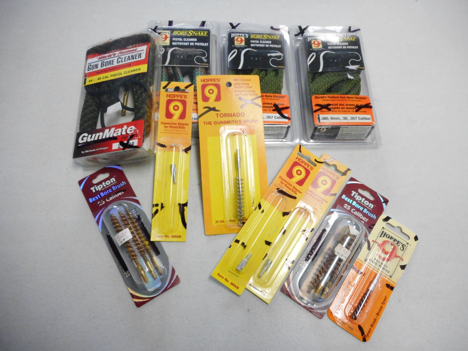 ASSORTED PISTOL CALIBER CLEANING ACCESSORIES, INCLUDES BRUSHES, SWABS & BORE SNAKES, ALL IN ORIGINAL PACKAGING