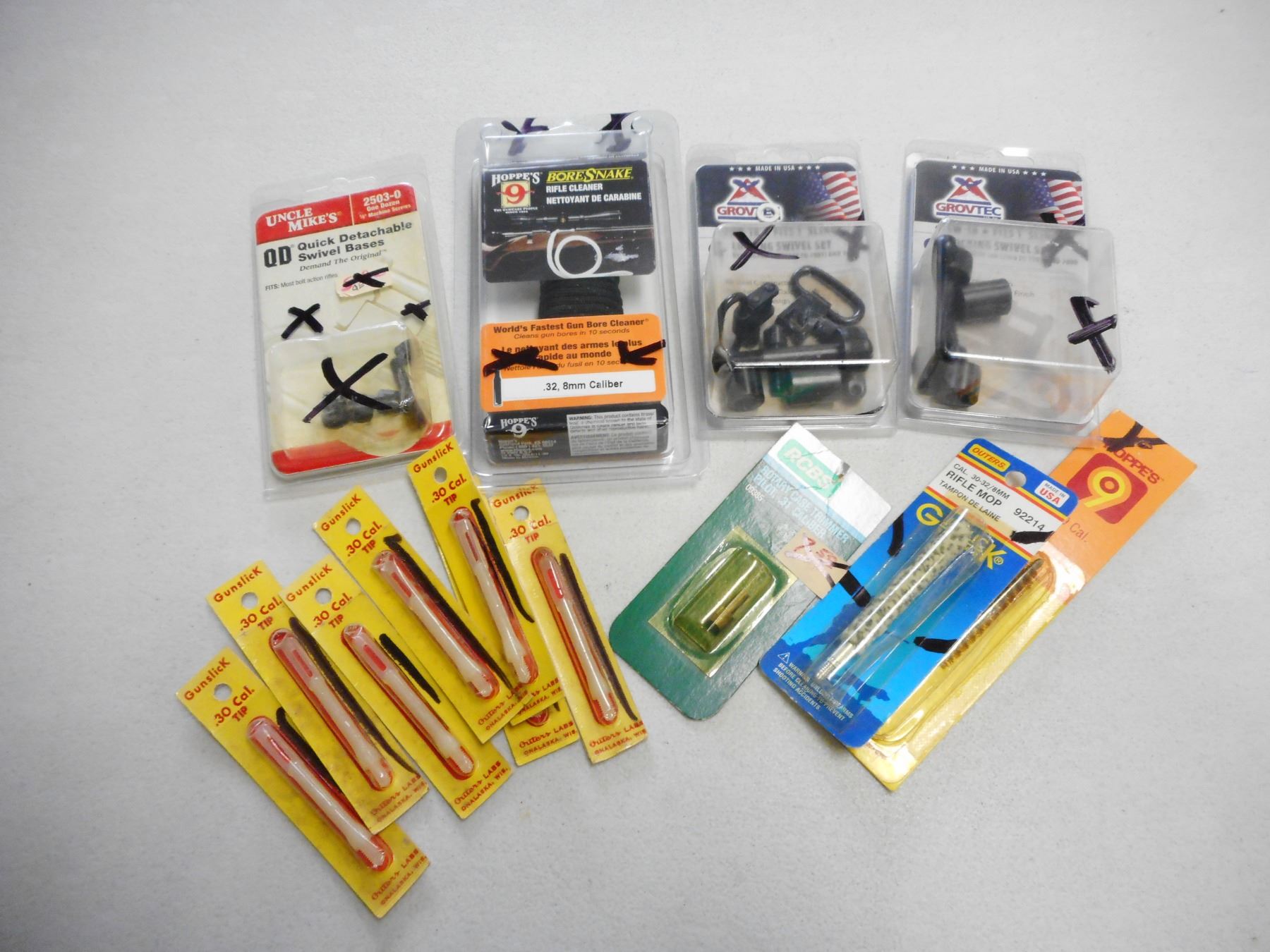 ASSORTED RIFLE & 30 CAL ACCESSORIES , (1) HOPPE'S BORE SNAKE, 30 CAL TIPS, BRUSHES, ROTARY CASE TRIMMER PILOT .31 CAL, & GROVE TECH LOCKING SWIVELS AND UNCLE MIKES BASES