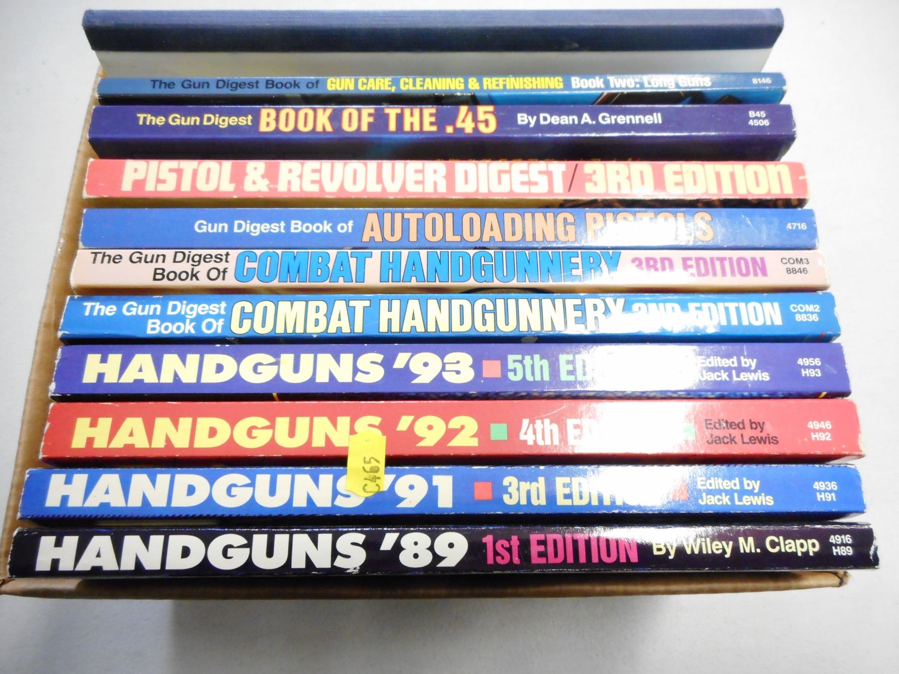 ASSORTED FIREARMS BOOKS , (4) HANDGUNS: '89, '91, 92, '93; (2) COMBAT HANDGUNNERY, (1) AUTOLOADING PISTOLS, (1) PISTOLS & REVOLVER DIGEST, (1) BOOK OF THE .45, (1) GUN CARE, CLEANING & REFURBISHING, (1) KNOW YOUR .45 AUTO PISTOLS, (1) ABERCOMBIE & FITCH 1935, LOT OF 12