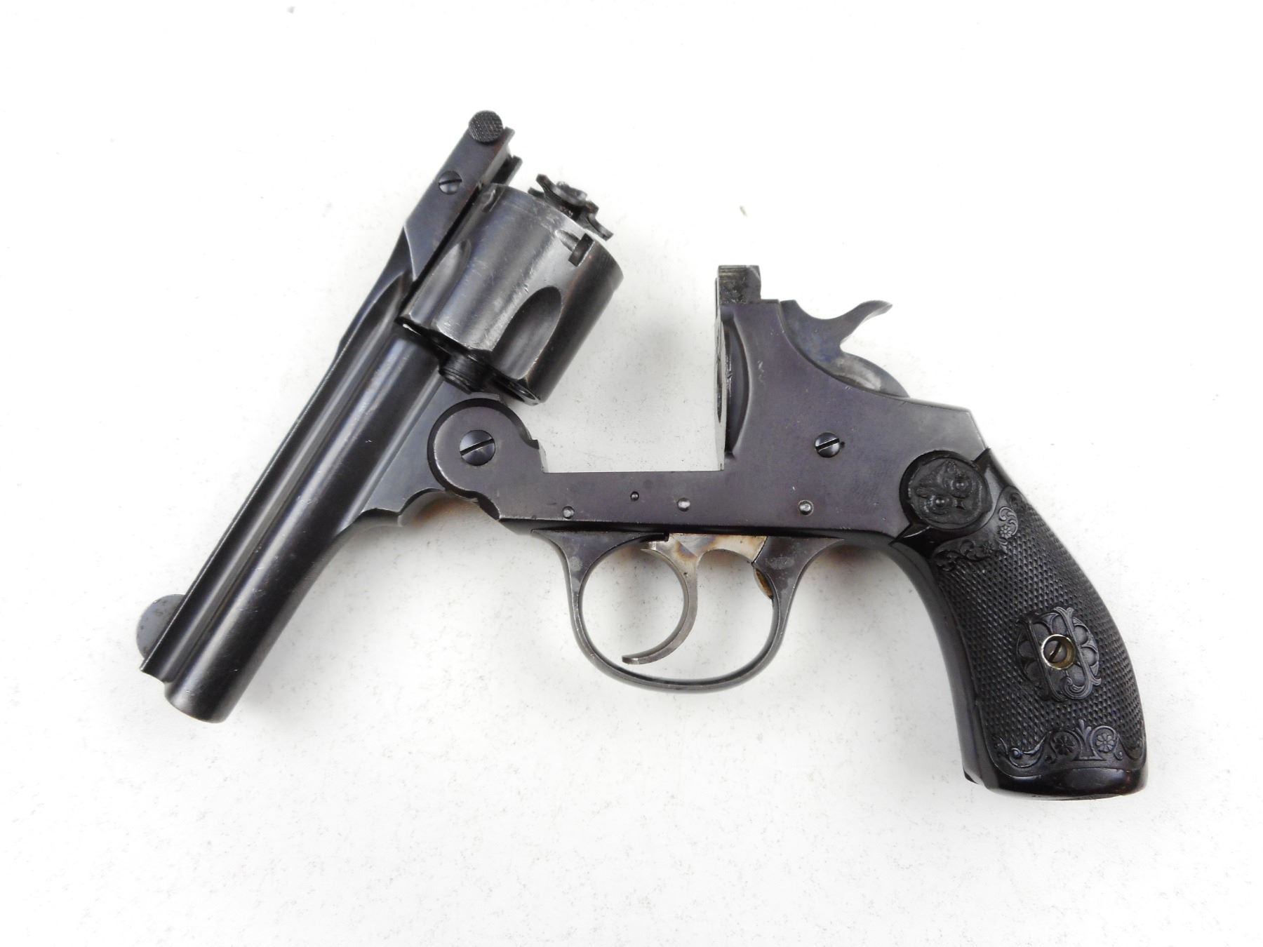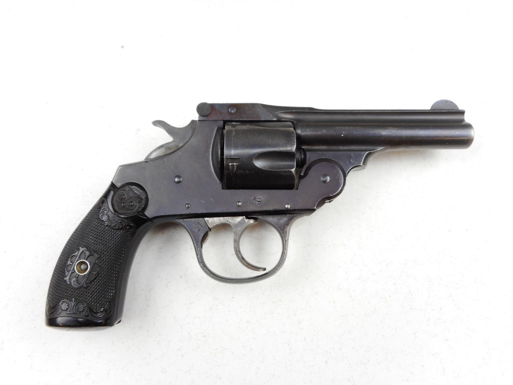 IVER JOHNSON , MODEL: SAFETY HAMMER AUTOMATIC THIRD MODEL , CALIBER: 38 S&W , BLUE FINISH SHOWING AGE WEAR, NOTCH & BLADE SIGHTS, CHECKERED HARD RUBBER GRIPS, DOUBLE ACTION LOCKS UP AND INDEXES WELL, GOOD BORE , ACTION: REVOLVER , BARREL LENGTH:83MM , CONDITION: 7/10 , SERIAL # C17199 , CANADIAN CLASS PROHIBITED