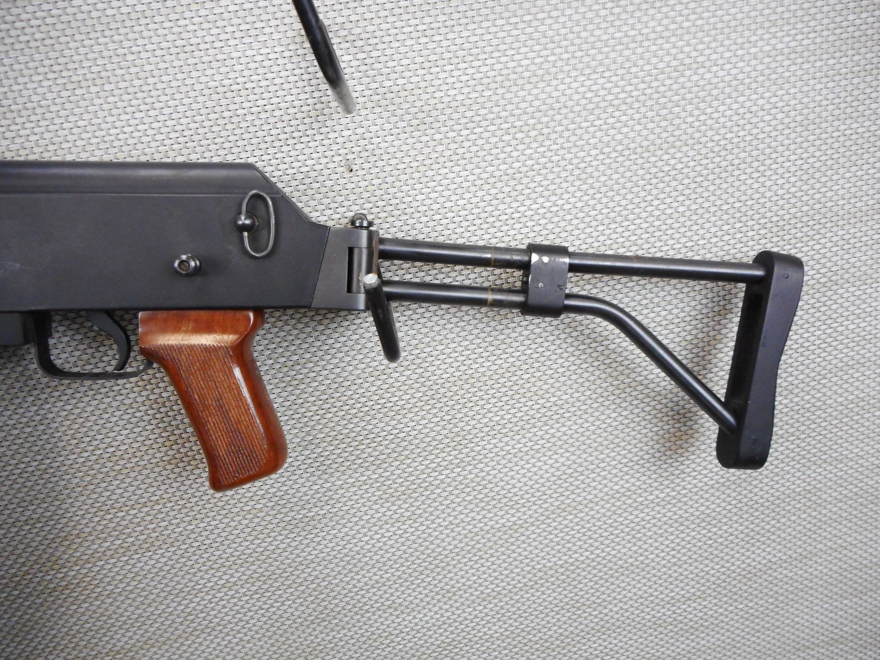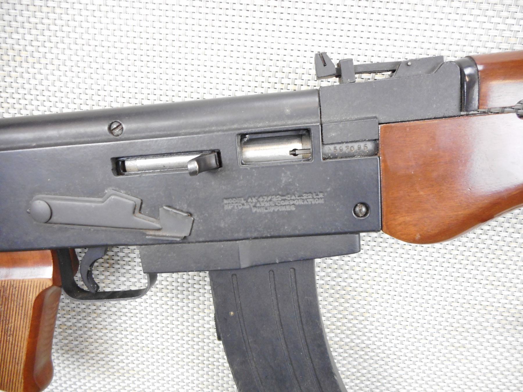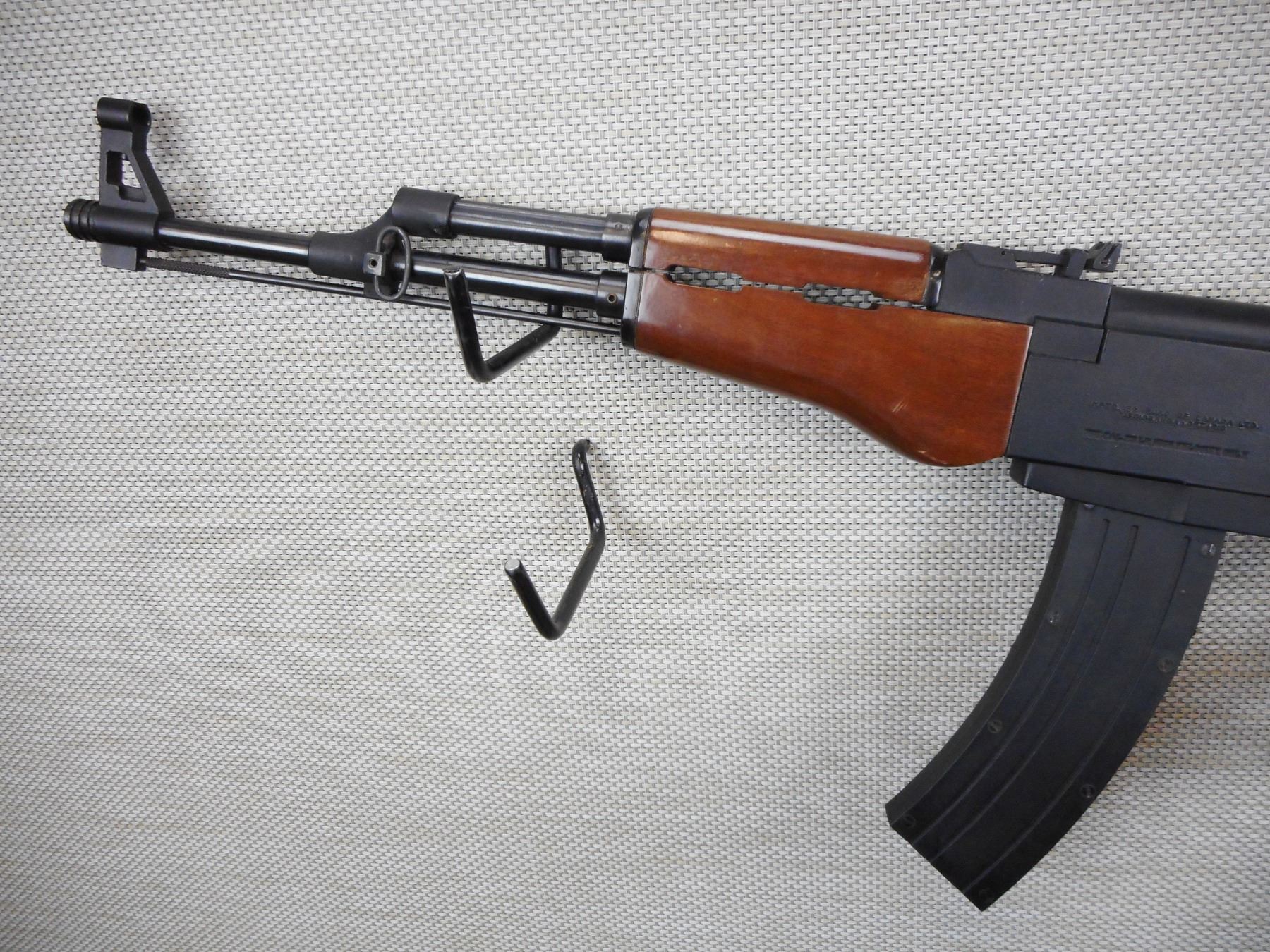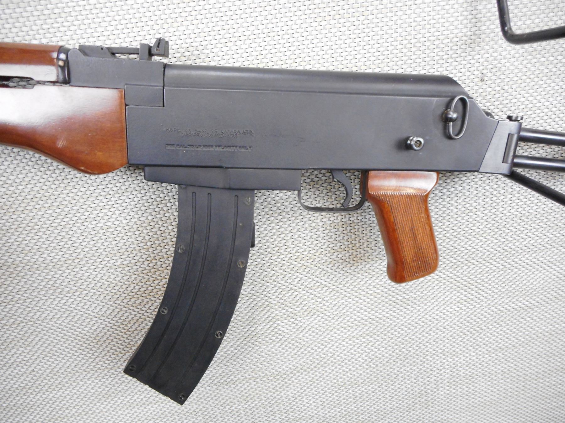 SQUIRES BINGHAM , MODEL: M AK47/22F , CALIBER: 22 LR , COMES WITH MAGAZINE, REQUIRES 12.5 PROHIBITED CLASS TO PURCHASE, 10 SHOT CAPACITY, BORE IS VERY GOOD, HOODED FRONT SIGHT, ADJUSTABLE REAR SIGHT, WOODEN FOREND WITH WOOD PISTOL GRIP, SKELOTONIZED FOLDING BUTT STOCK, SHOWS VERY LITTLE HANDLING MARKS, SLING SWIVEL LOOPS , ACTION: SEMI AUTOMATIC RIFLE , BARREL LENGTH:470MM , CONDITION: 8/10 , SERIAL # A597095 , CANADIAN CLASS PROHIBITED