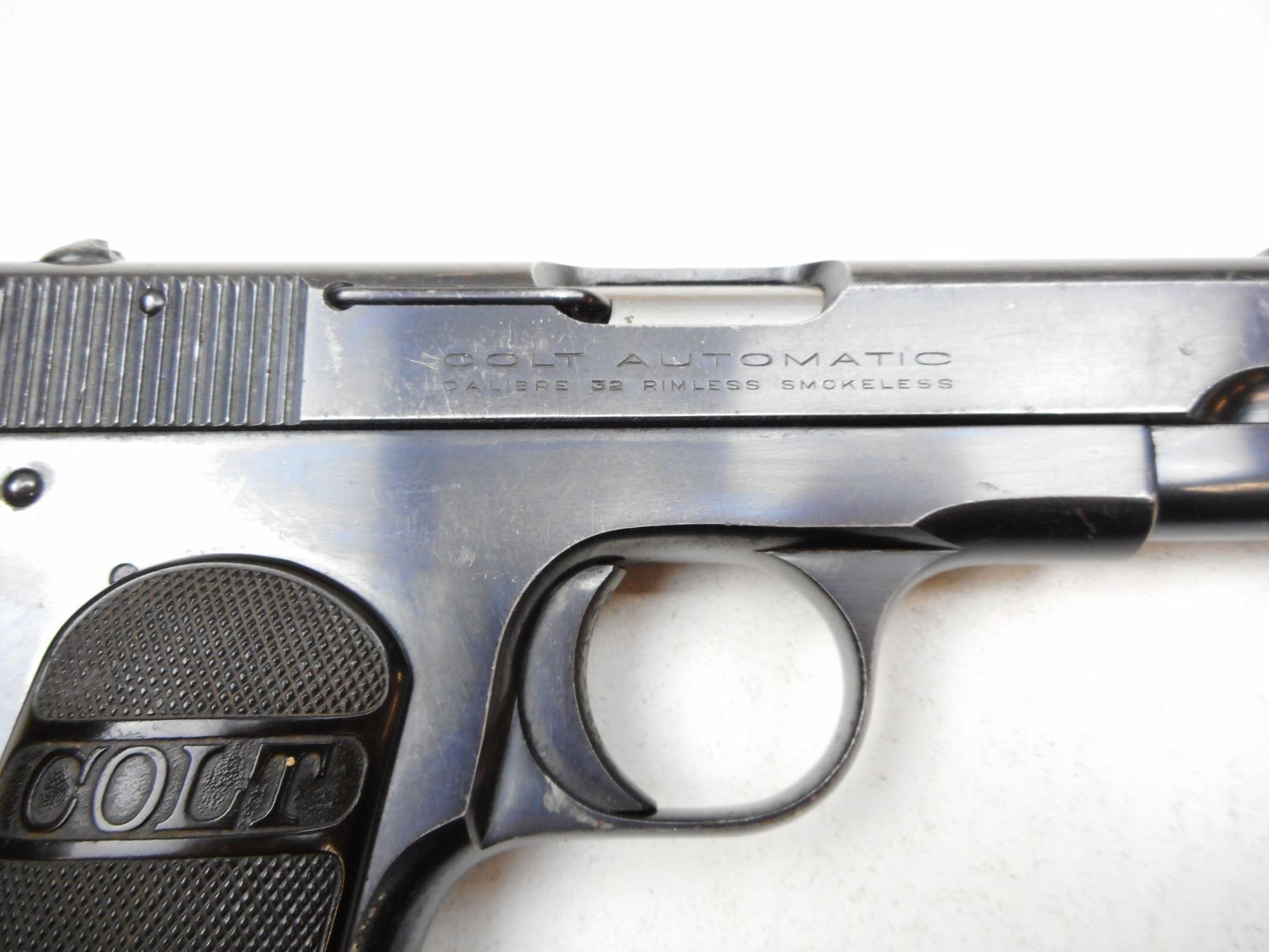COLT , MODEL: 1903 POCKET HAMMERLESS , CALIBER: 32ACP , COMES WITH MAGAZINE, NOTCH & BLADE SIGHTS, BLACK HARD RUBBER CHECKERED GRIPS, BLUE FINISH SHOWING APPROPRIATE AGE RELATED WEAR, GOOD BORE, GRIP SAFETY , ACTION: SEMI-AUTOMATIC , BARREL LENGTH:95MM , CONDITION: 7/10 , SERIAL # 400163 , CANADIAN CLASS PROHIBITED