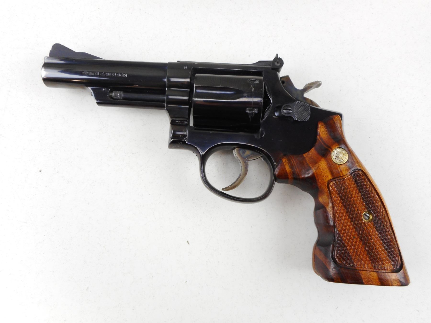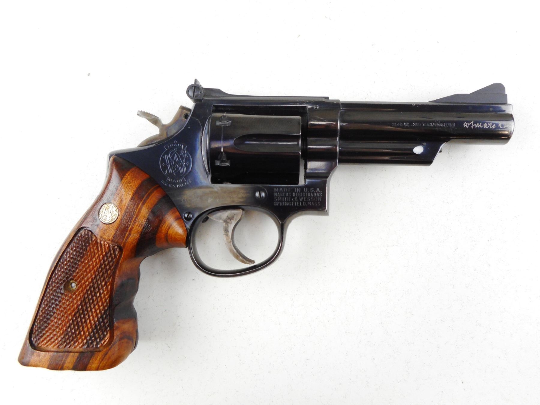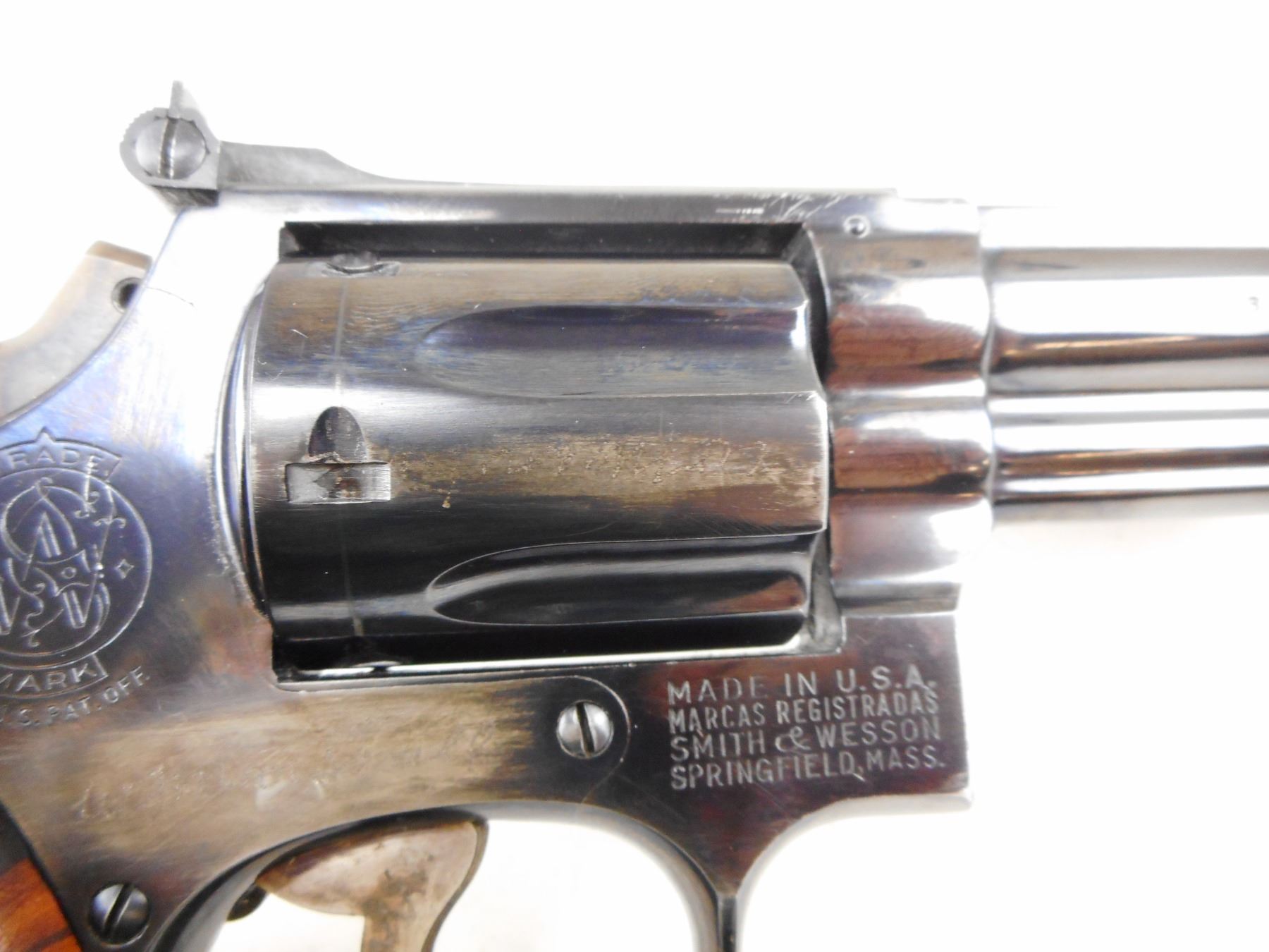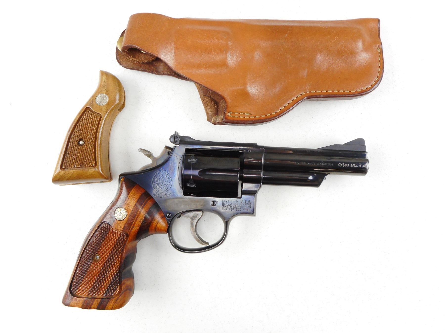 SMITH & WESSON , MODEL: 19 , CALIBER: 357 MAGNUM , COMES WITH LEATHER HOLSTER AND SECOND SET OF GRIPS, 6 SHOT CAPACITY, FIREARM IS ELECTRO ENGRAVED WITH PREVIOUS OWNERS NAME THAT HAS BEEN PARTIALLY REMOVED THIS IS IN MULTIPLE SPOTS INCLUDING THE RIGHT SIDE OF RECEIVER, THE MUZZLE, THE TRIGGER, AND THE CYLINDER, BORE IS VERY GOOD, RAMP FRONT AND ADJUSTABLE REAR SIGHTS, CHECKERED WOOD GRIP PANELS WITH S& W LOGO, SHOWS SOME HANDLING MARKS, , ACTION: REVOLVER , BARREL LENGTH:102MM , CONDITION: 6/10 , SERIAL # K358544 , CANADIAN CLASS PROHIBITED