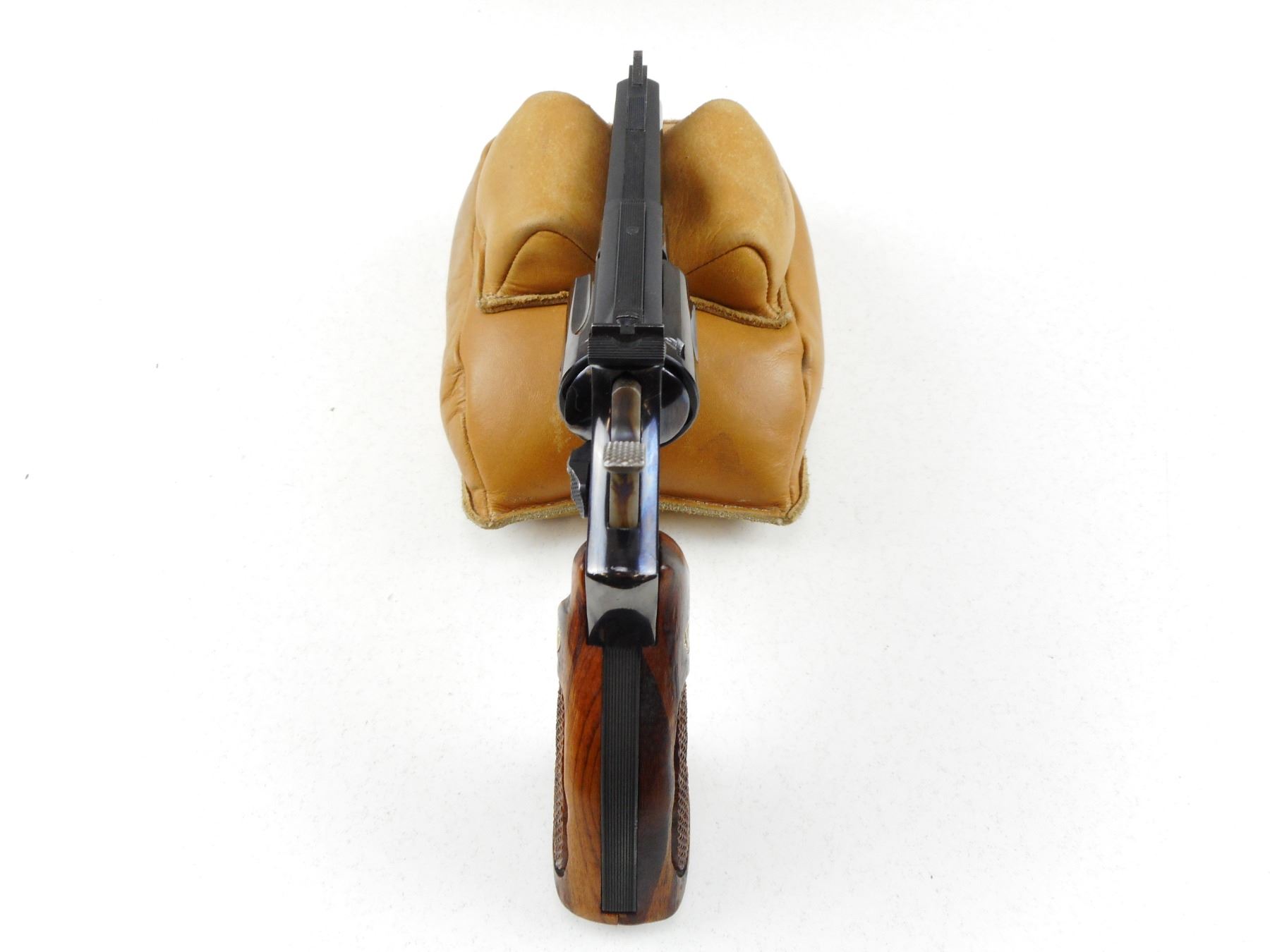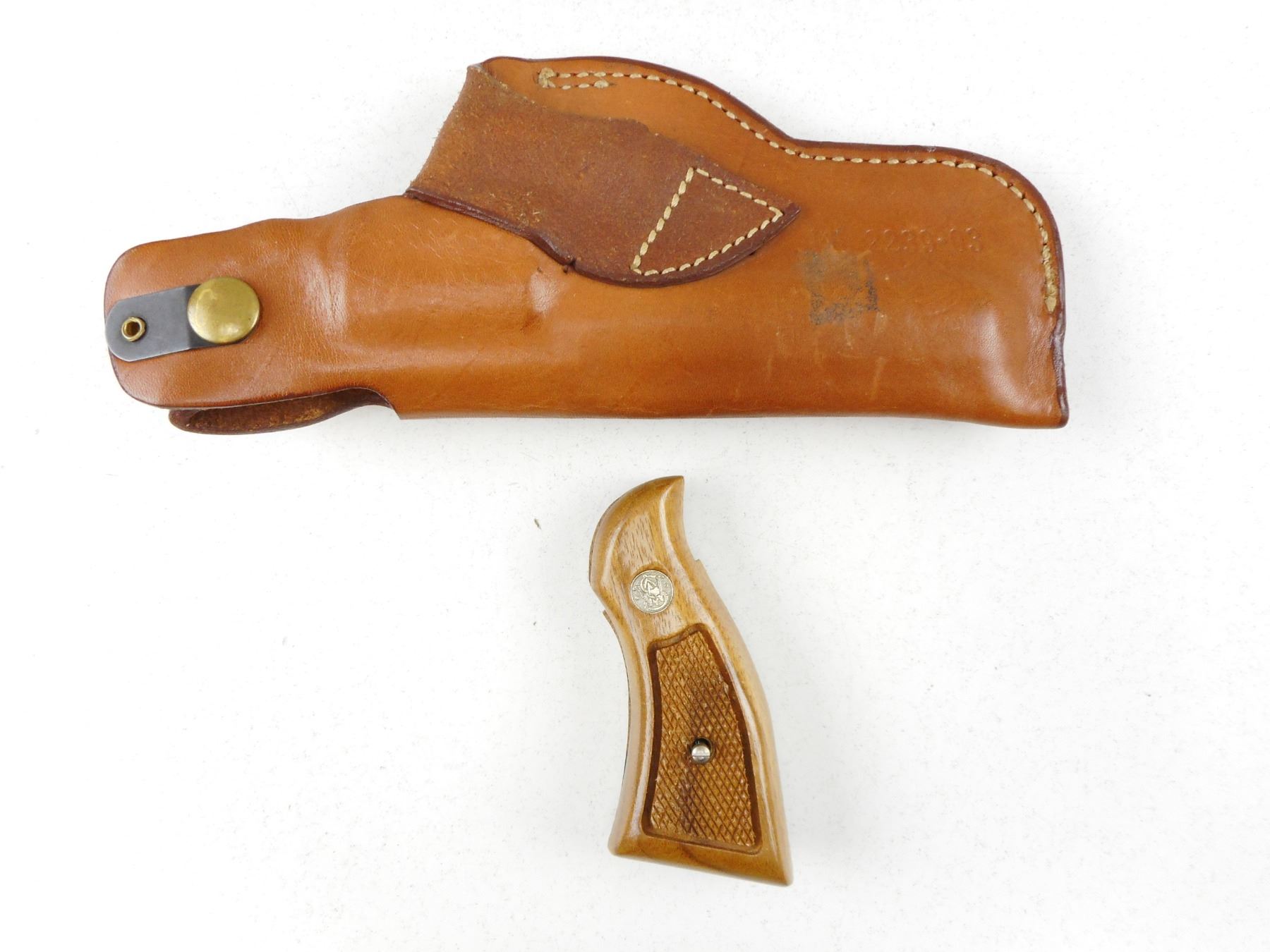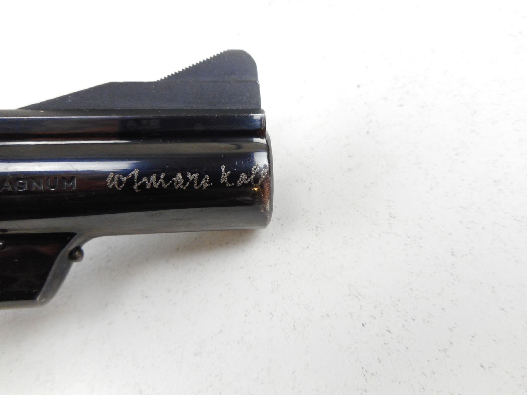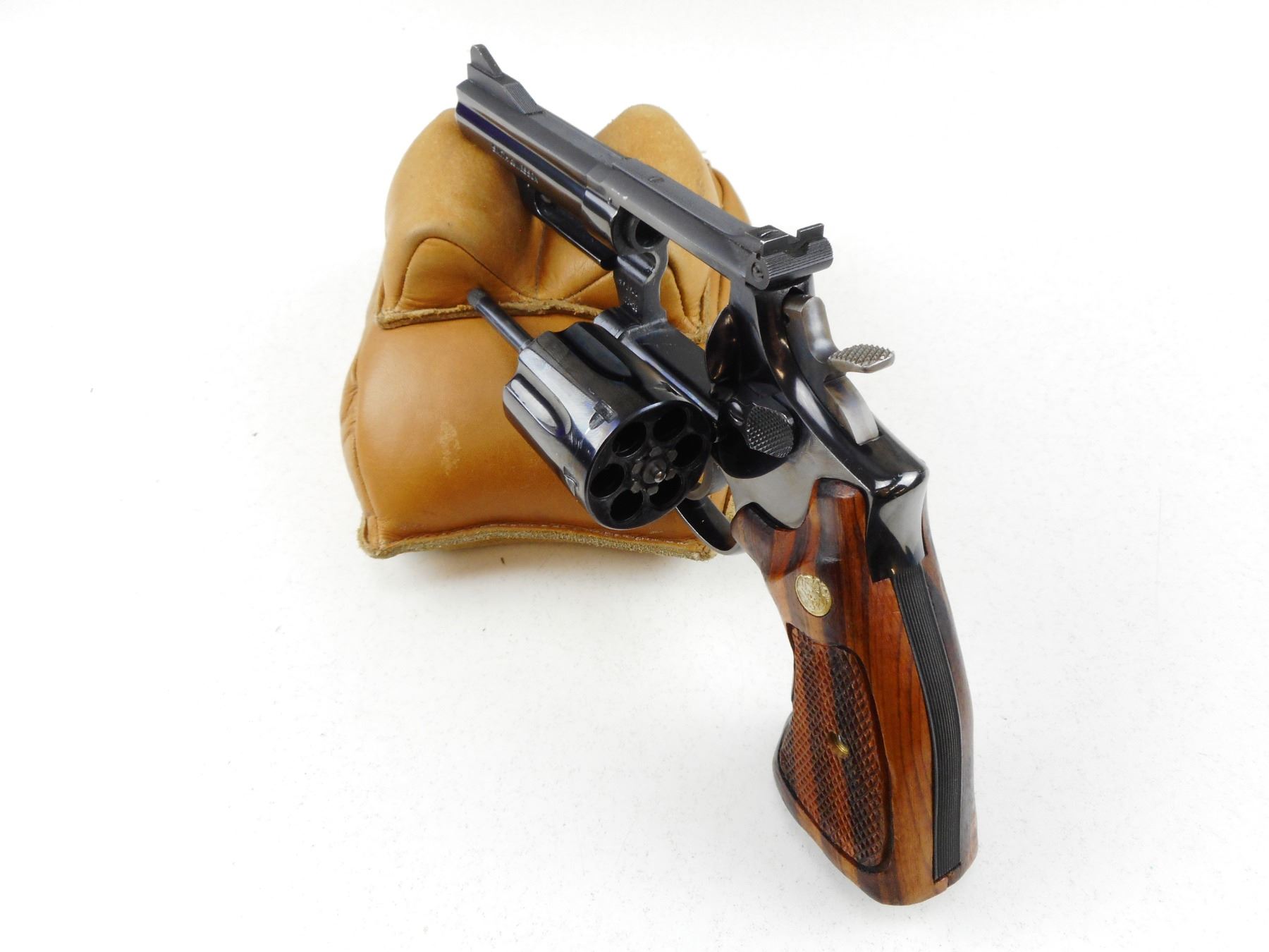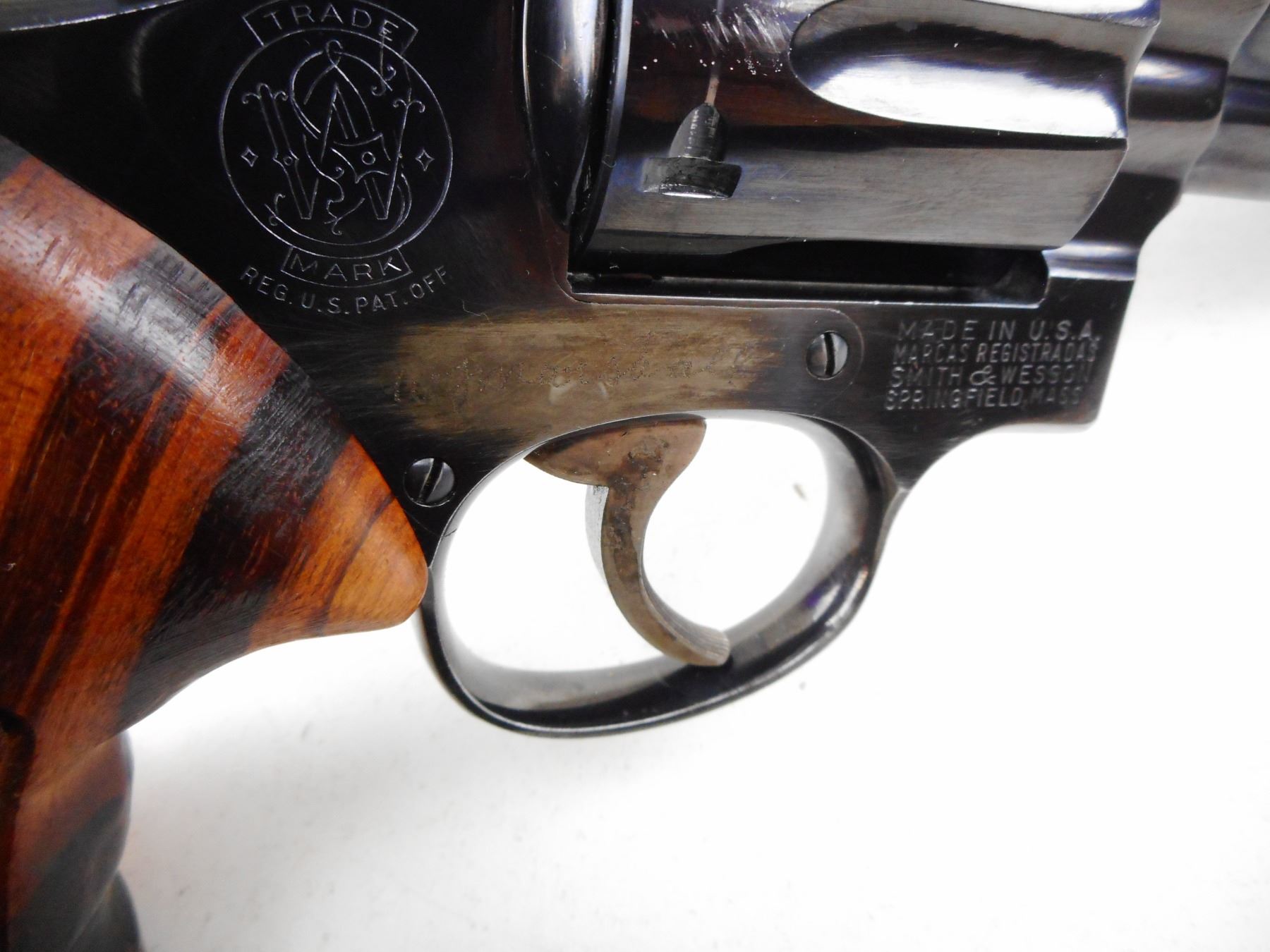 SMITH & WESSON , MODEL: 19 , CALIBER: 357 MAGNUM , COMES WITH LEATHER HOLSTER AND SECOND SET OF GRIPS, 6 SHOT CAPACITY, FIREARM IS ELECTRO ENGRAVED WITH PREVIOUS OWNERS NAME THAT HAS BEEN PARTIALLY REMOVED THIS IS IN MULTIPLE SPOTS INCLUDING THE RIGHT SIDE OF RECEIVER, THE MUZZLE, THE TRIGGER, AND THE CYLINDER, BORE IS VERY GOOD, RAMP FRONT AND ADJUSTABLE REAR SIGHTS, CHECKERED WOOD GRIP PANELS WITH S& W LOGO, SHOWS SOME HANDLING MARKS, , ACTION: REVOLVER , BARREL LENGTH:102MM , CONDITION: 6/10 , SERIAL # K358544 , CANADIAN CLASS PROHIBITED