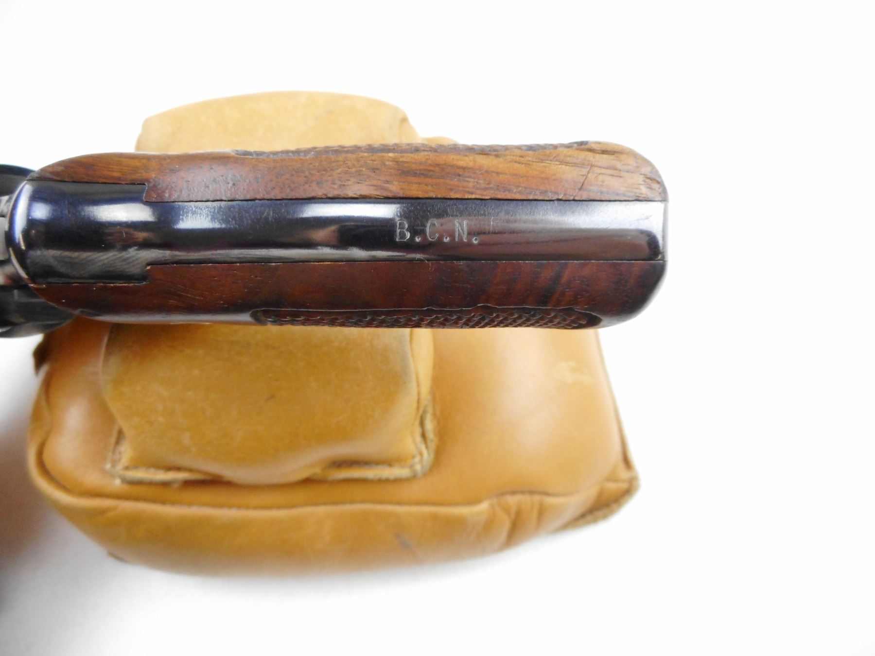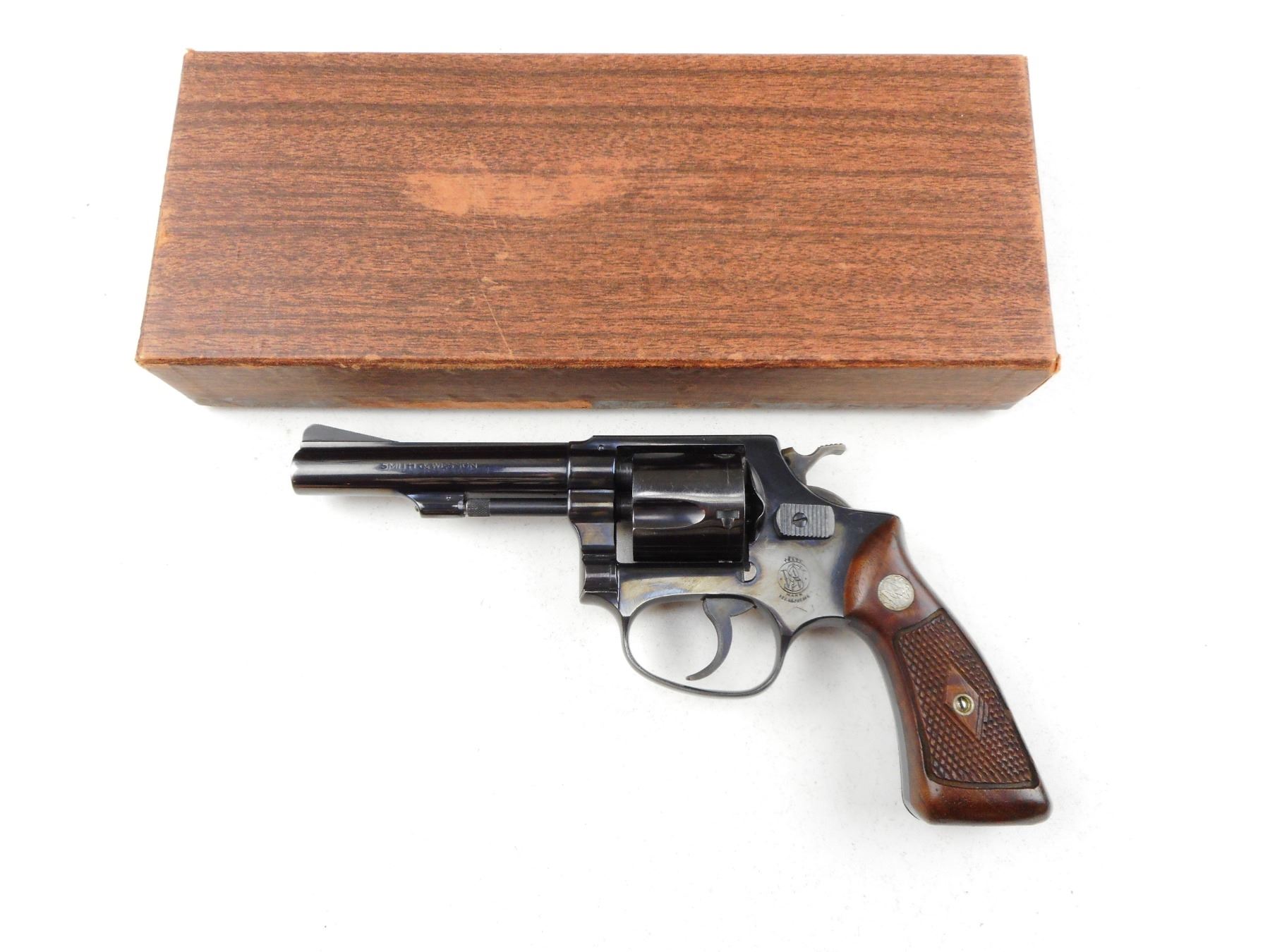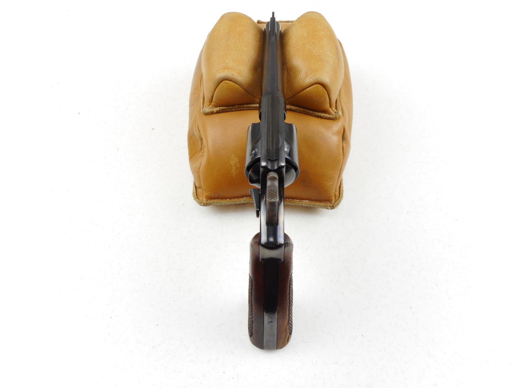 SMITH & WESSON , MODEL: 33 , CALIBER: 38 S&W , COMES WITH BOX BACK STRAP IS INSCRIBED "B.C.N.", 5 SHOT CAPACITY, RAMP FRONT AND GROOVED REAR SIGHT, CHECKERED WOODEN GRIP PANELS WITH S&W LOGO, SHOWS SOME HANDLING MARKS , ACTION: REVOLVER , BARREL LENGTH:102MM , CONDITION: 6/10 , SERIAL # 85458 , CANADIAN CLASS PROHIBITED