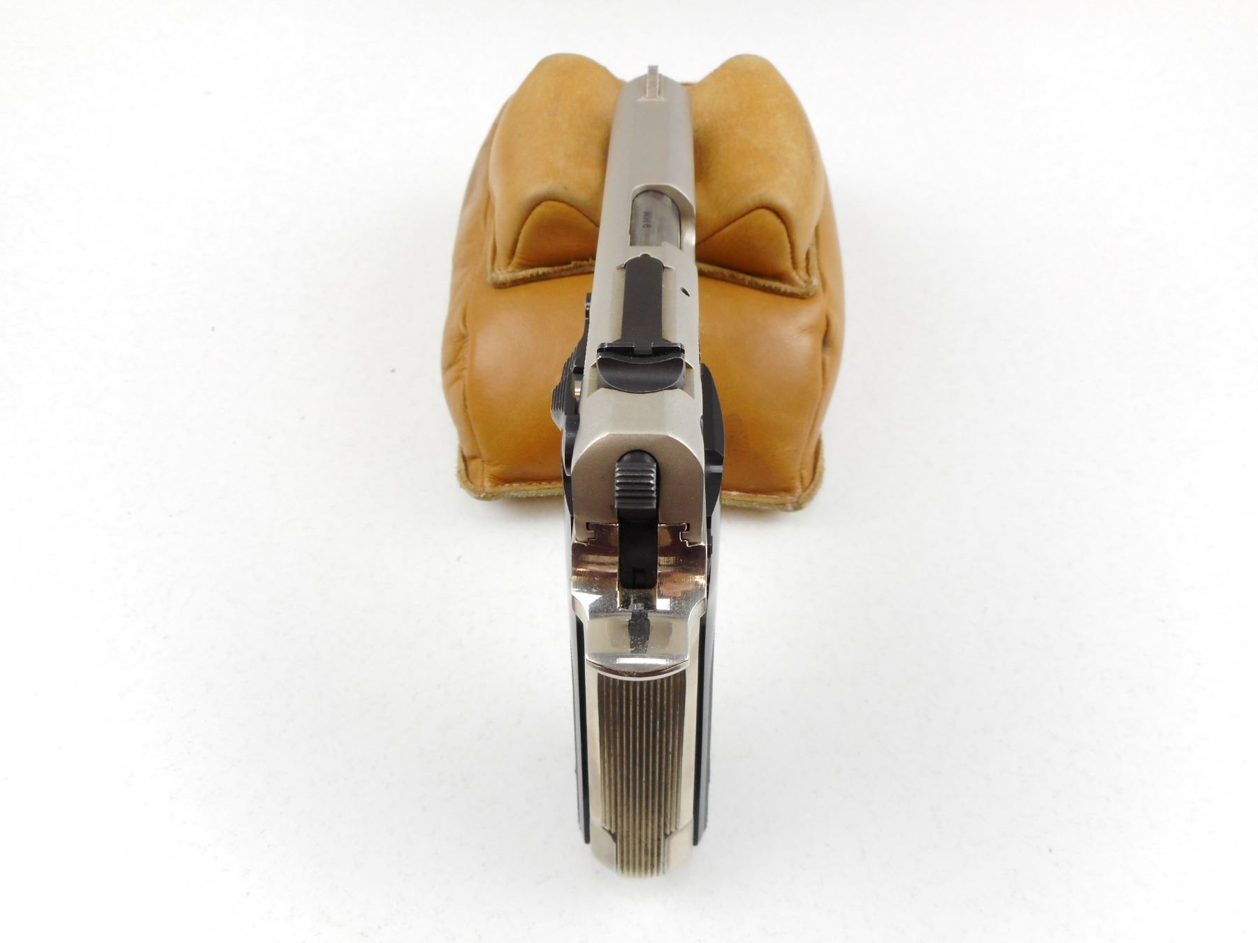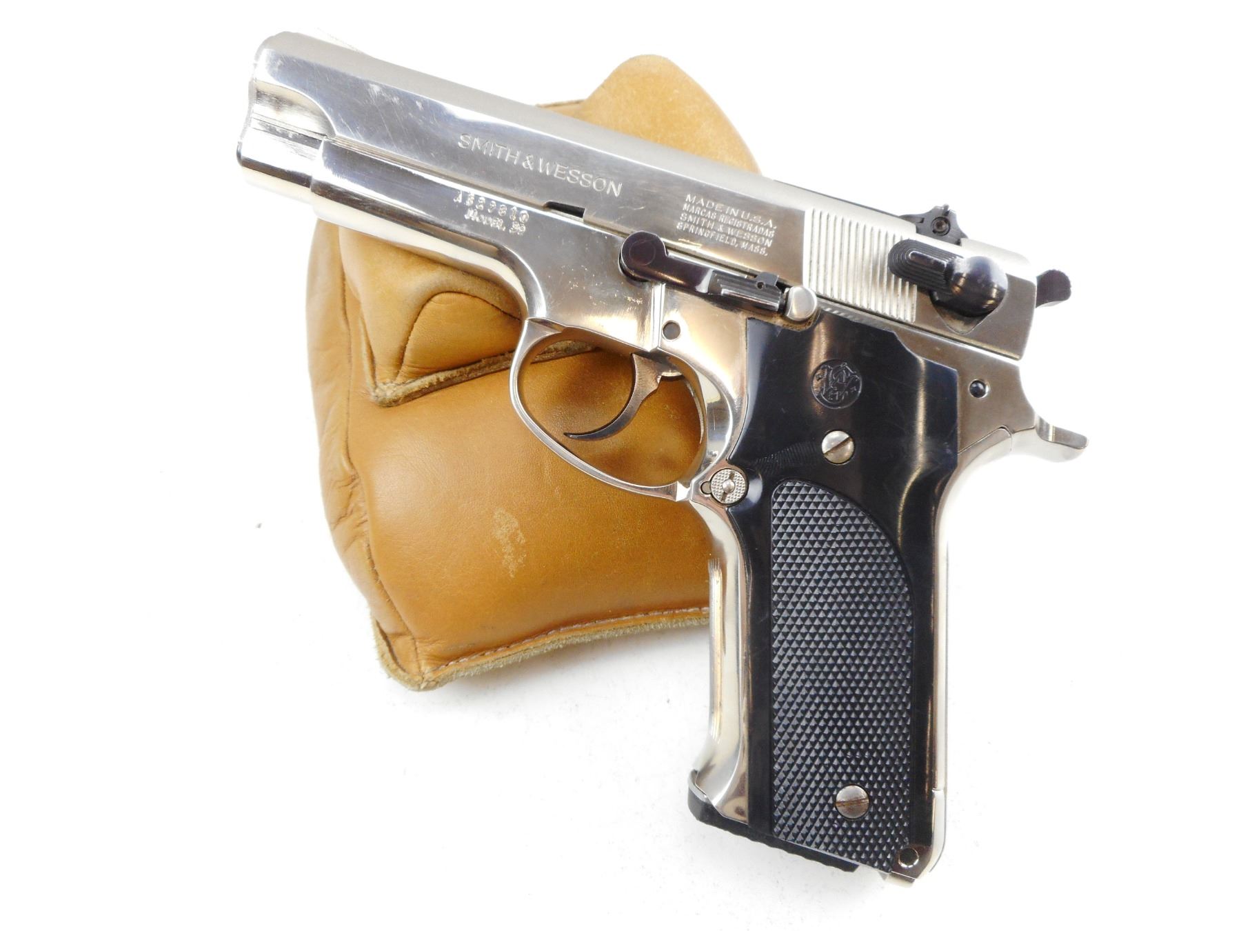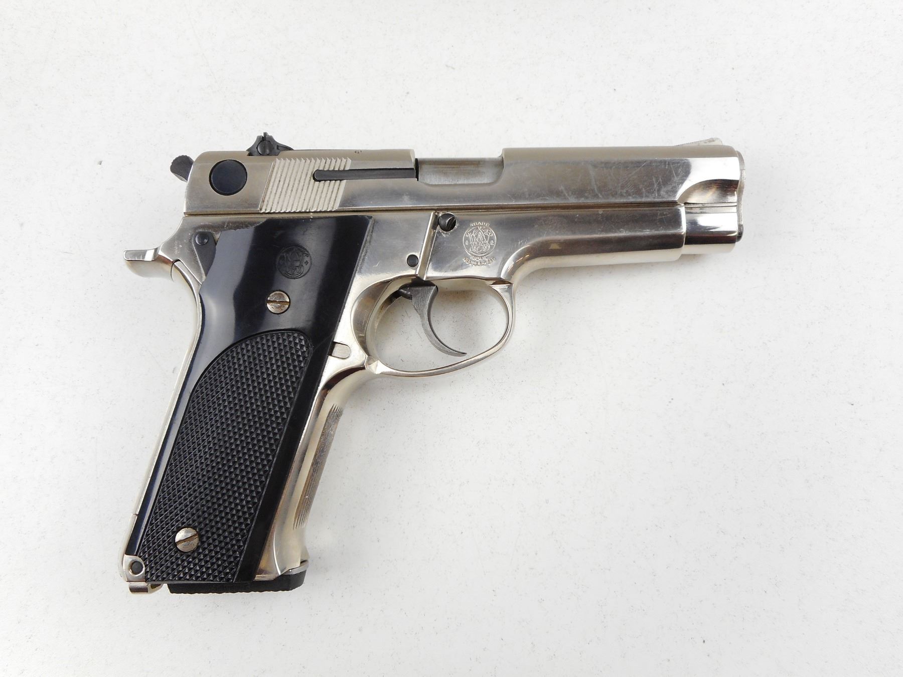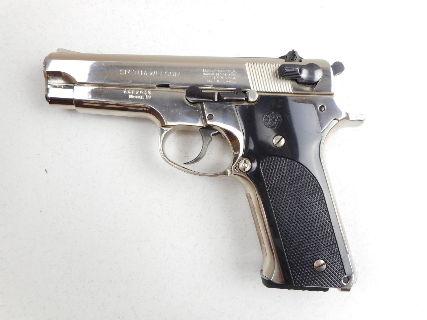 SMITH & WESSON , MODEL: 59 , CALIBER: 9MM , COMES WITH MAGAZINE, NICKEL PLATED, RAMP FRONT AND ADJUSTABLE REAR SIGHTS, CHECKERED PLASTIC GRIP PANELS WITH S& W LOGO, BORE IS GOOD, SHOWS SOME HANDLING MARKS , ACTION: SEMI-AUTOMATIC HANDGUN , BARREL LENGTH:102MM , CONDITION: 7/10 , SERIAL # A627910 , CANADIAN CLASS PROHIBITED