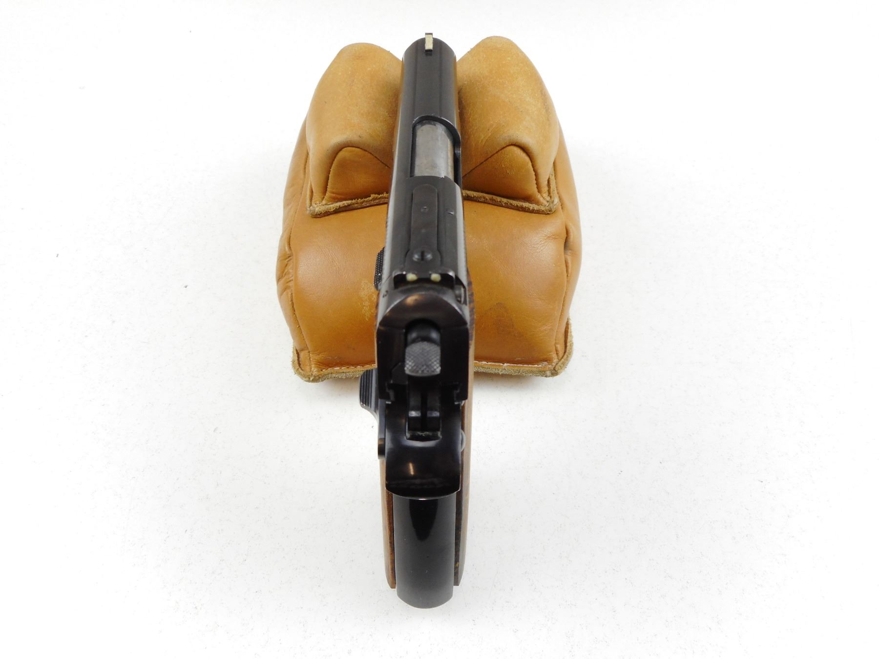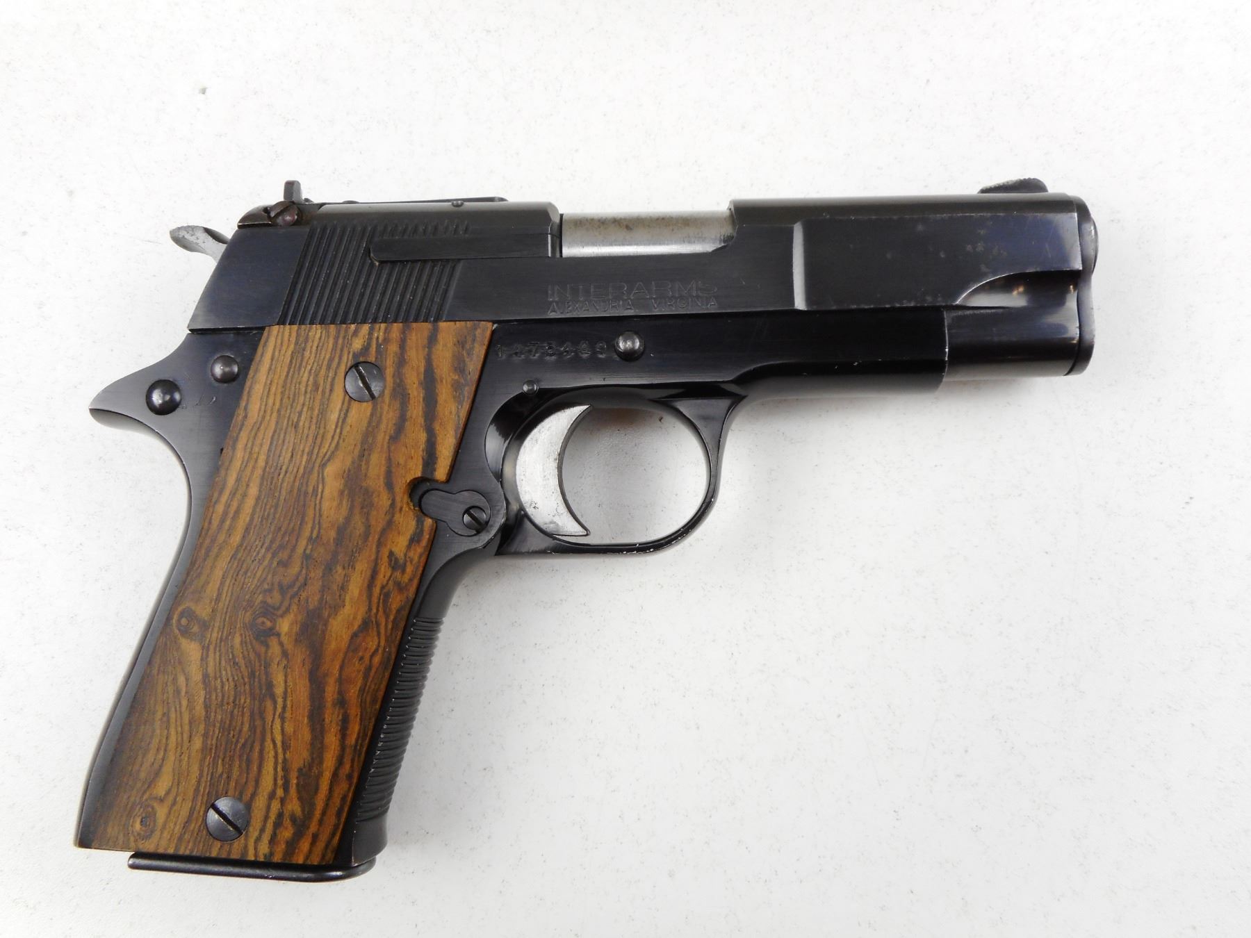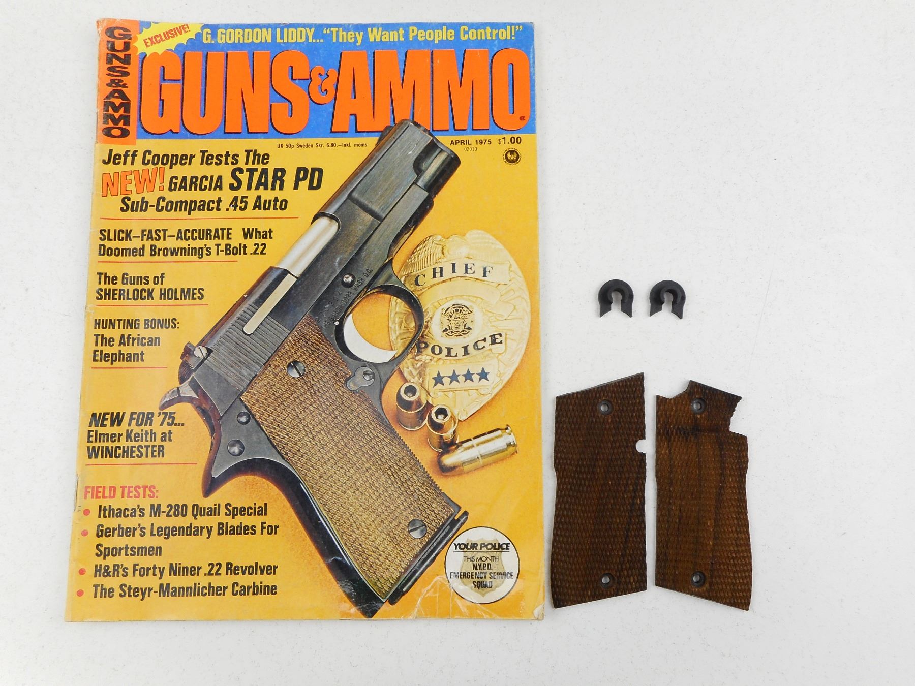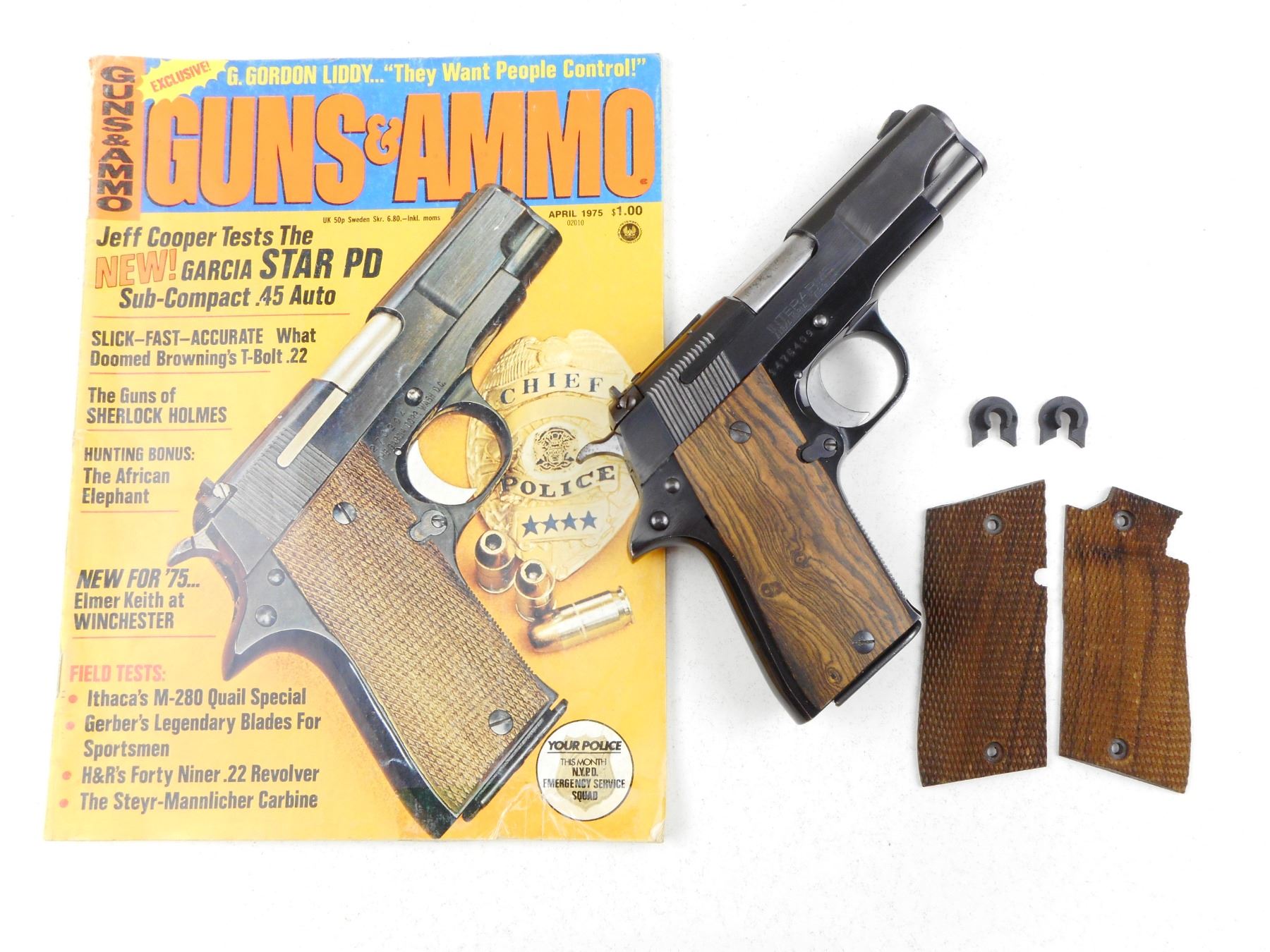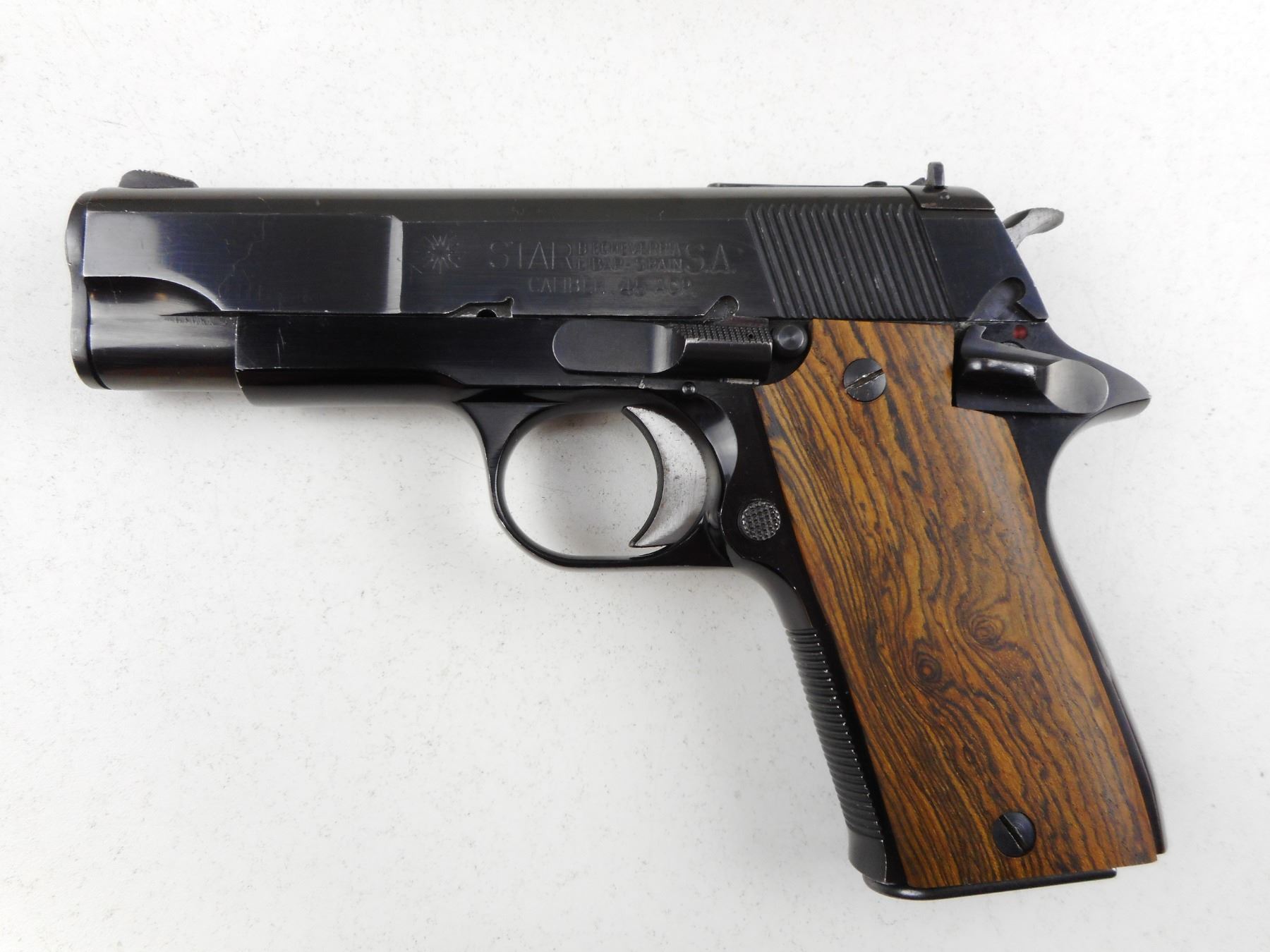 STAR , MODEL: PD , CALIBER: 45 ACP , COMES WITH MAGAZINE, FACTORY GRIPS, BUFFERS AND 1975 GUNS & AMMO CATALOG , 6 SHOT CAPACITY, BORE IS GOOD, RAMP FRONT AND ADJUSTABLE REAR SIGHT, WOOD GRIP PANELS, SHOWS SOME HANDLING MARKS , ACTION: SEMI-AUTOMATIC HANDGUN , BARREL LENGTH:102MM , CONDITION: 6/10 , SERIAL # 1475409 , CANADIAN CLASS PROHIBITED