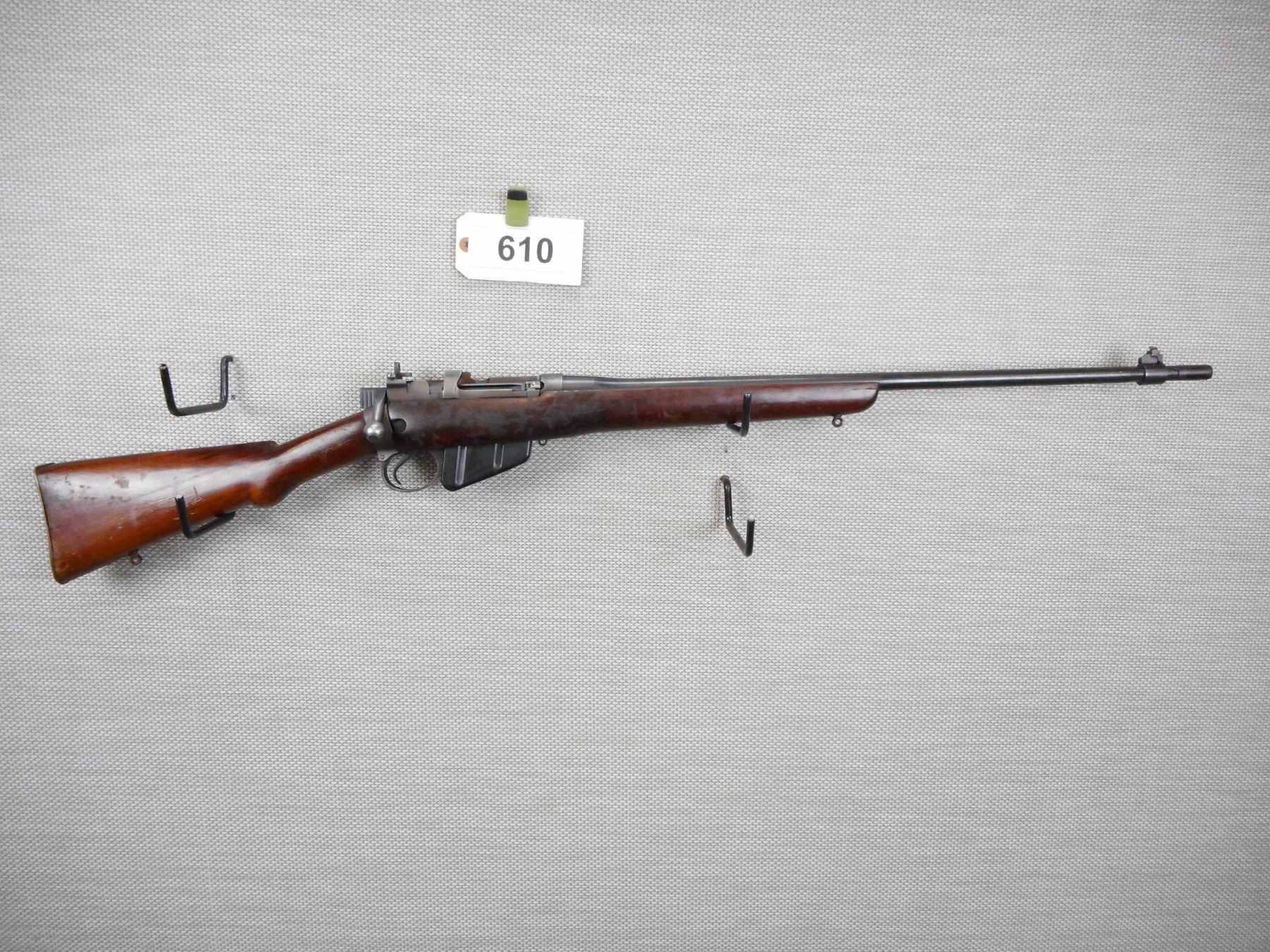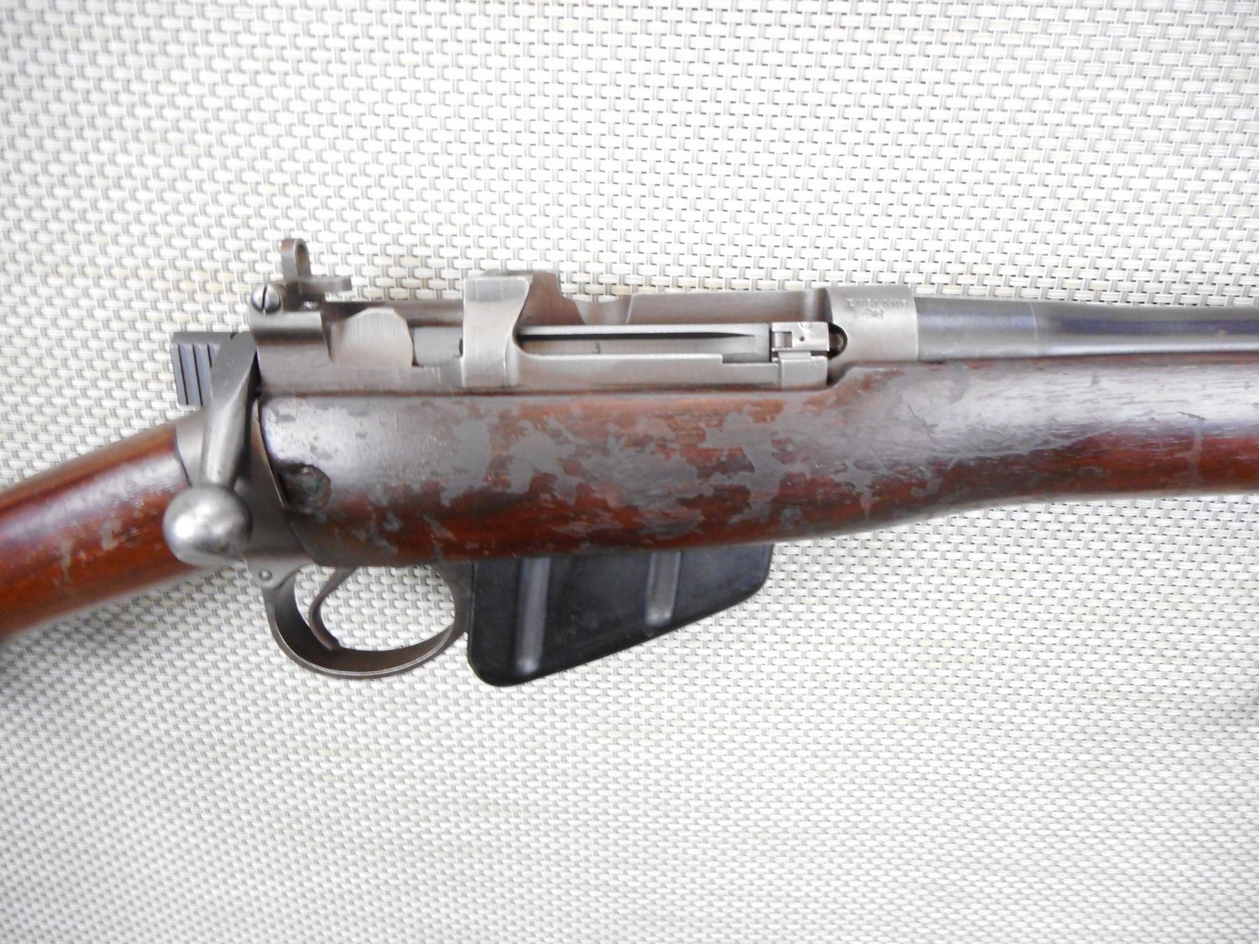 LEE ENFIELD , MODEL: NO 4 MK1* SPORTER , CALIBER: 303 BR , COMES WITH MAGAZINE , MADE BY SAVAGE AND MARKED US PROPERTY MARKED ENGLAND, VERY GOOD BORE, RAISED FRONT AND PEEP APERTURE REAR SIGHT, SLING SWIVEL LOOPS, SHOWS SOME HANDLING MARKS, BRASS BUTT PLATE , ACTION: BOLT ACTION RIFLE , BARREL LENGTH:25" , CONDITION: 5/10 , SERIAL # 0005934 , CANADIAN CLASS NON RESTRICTED