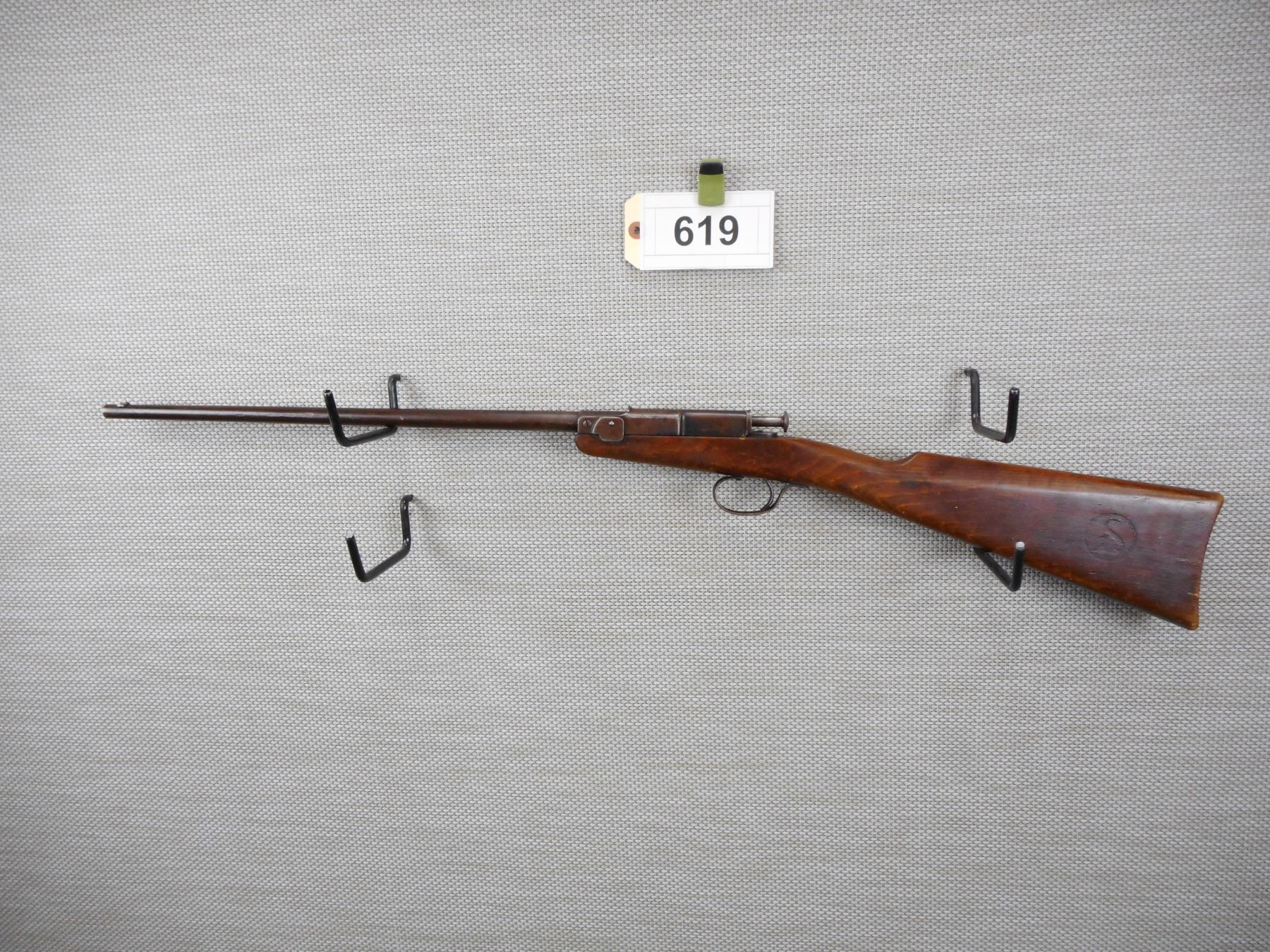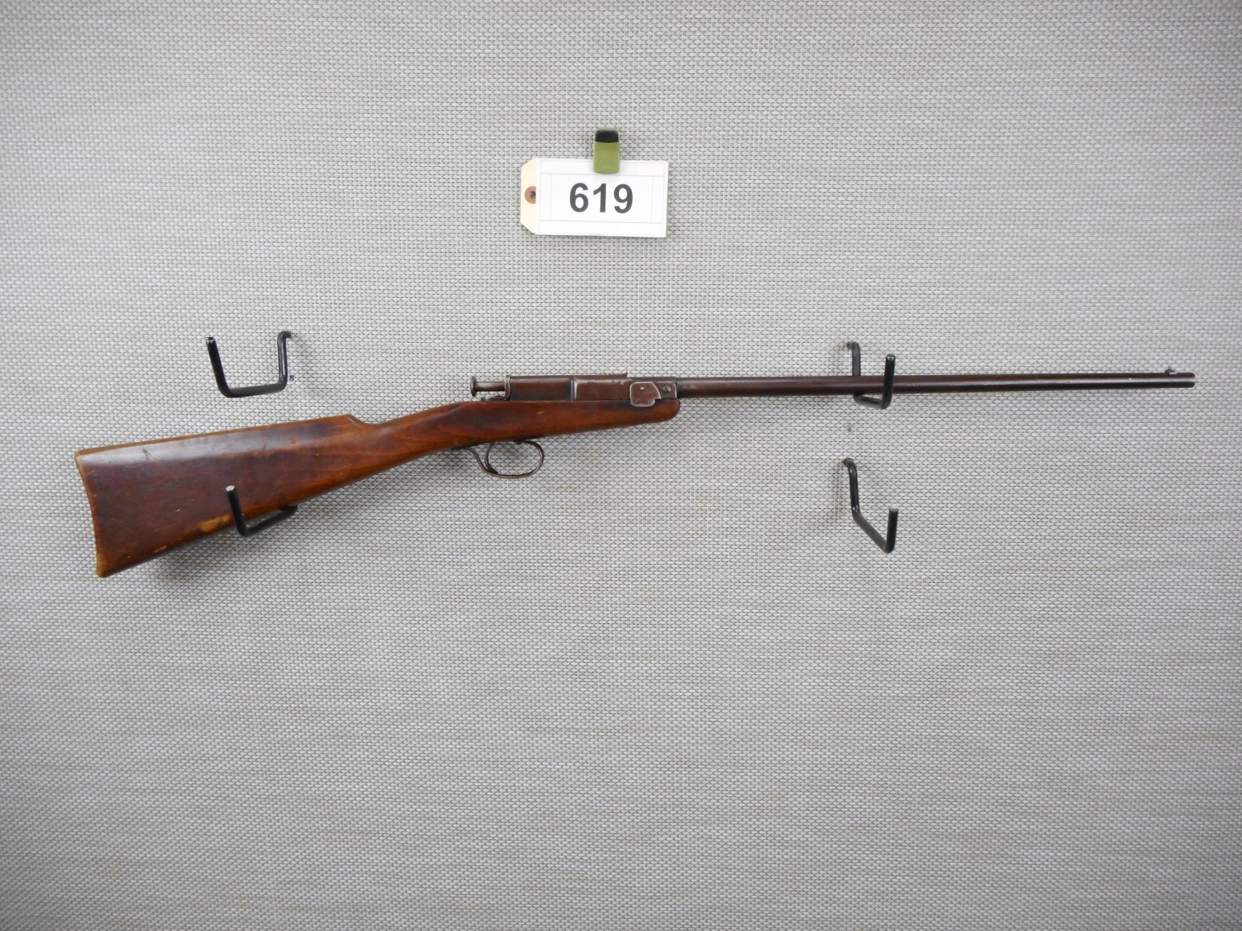 DEUTSCHE WERKE , MODEL: 1 , CALIBER: 22LR , GOOD BORE, REPLACED BEAD FRONT SIGHT, NOTCHED REAR SIGHT, ONE PIECE WOOD STOCK WITH A CRACK AT THE BUTT, SHOWS EXTENSIVE HANDLING MARKS , ACTION: SINGLE SHOT , BARREL LENGTH:19" , CONDITION: 5/10 , SERIAL # N/A , CANADIAN CLASS NON RESTRICTED