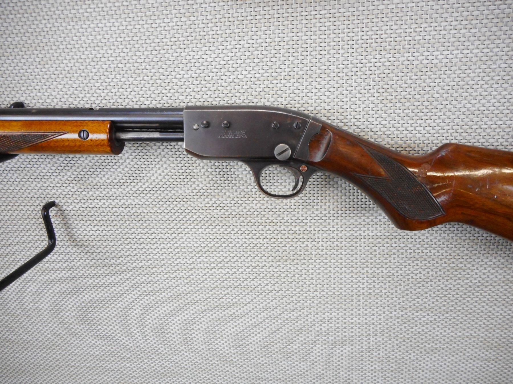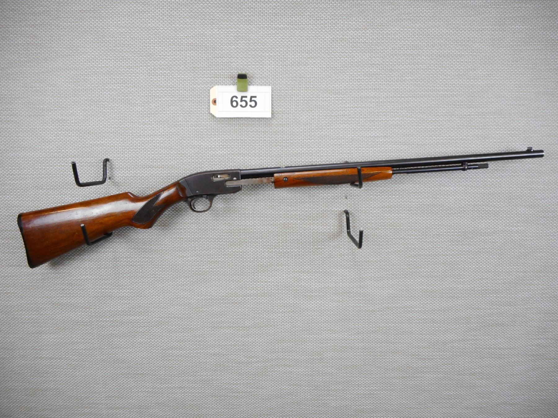 SAVAGE , MODEL: 29-A , CALIBER: 22LR , GOOD BORE, BLADE FRONT AND NO REAR SIGHT, DRILLED AND TAPPED FOR SCOPE MOUNT, CHECKERED FOREND AND SEMI PISTOL GRIP BUTT STOCK WITH PLASTIC BUTT PLATE, FOREND WOOD AND BUTT APPEAR NOT TO MATCH, SHOWS SOME HANDLING MARKS , ACTION: PUMP ACTION RIFLE , BARREL LENGTH:24" , CONDITION: 5/10 , SERIAL # 59849L , CANADIAN CLASS NON RESTRICTED