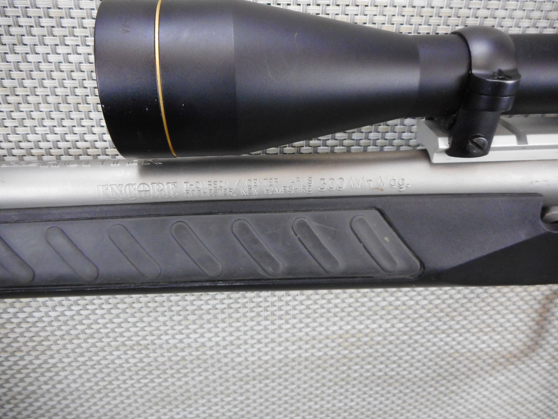 THOMPSON CENTER , MODEL: ENCORE PRO HUNTER , CALIBER: 50 CAL PERC , COMES WITH SECOND BARREL 28", HAS AN EXCELLENT BORE, STAINLESS STEEL FLUTED BARREL IN 300 WIN MAG WITH 3 X 9 VX-1 LEUPOLD SCOPE, THE BARREL THAT IS MOUNTED IS A STAINLESS FLUTED BARREL, WITH 2 X 7 BUSHNELL SCOPE WHICH IS MOUNTED ON RIFLE, FIBEROPTIC FRONT AND REAR SIGHTS, SYNTHETIC FULL PISTOL GRIP BUTT STOCK WITH RUBBER RECOIL PAD, SLING SWIVEL LOOPS, SHOWS VERY LITTLE HANDLING MARKS , ACTION: MUZZLE LOADER RIFLE , BARREL LENGTH:28" , CONDITION: 8/10 , SERIAL # PS38837 , CANADIAN CLASS NON RESTRICTED